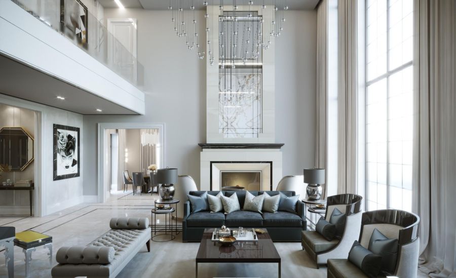 В проекте оформления интерьеров дома представлены две идеи отделки гостиной. В первом случае каминная зона более светлая, во втором – акцентирована черным мрамором. Еще одно различие кроется в дизайне центральной люстры.