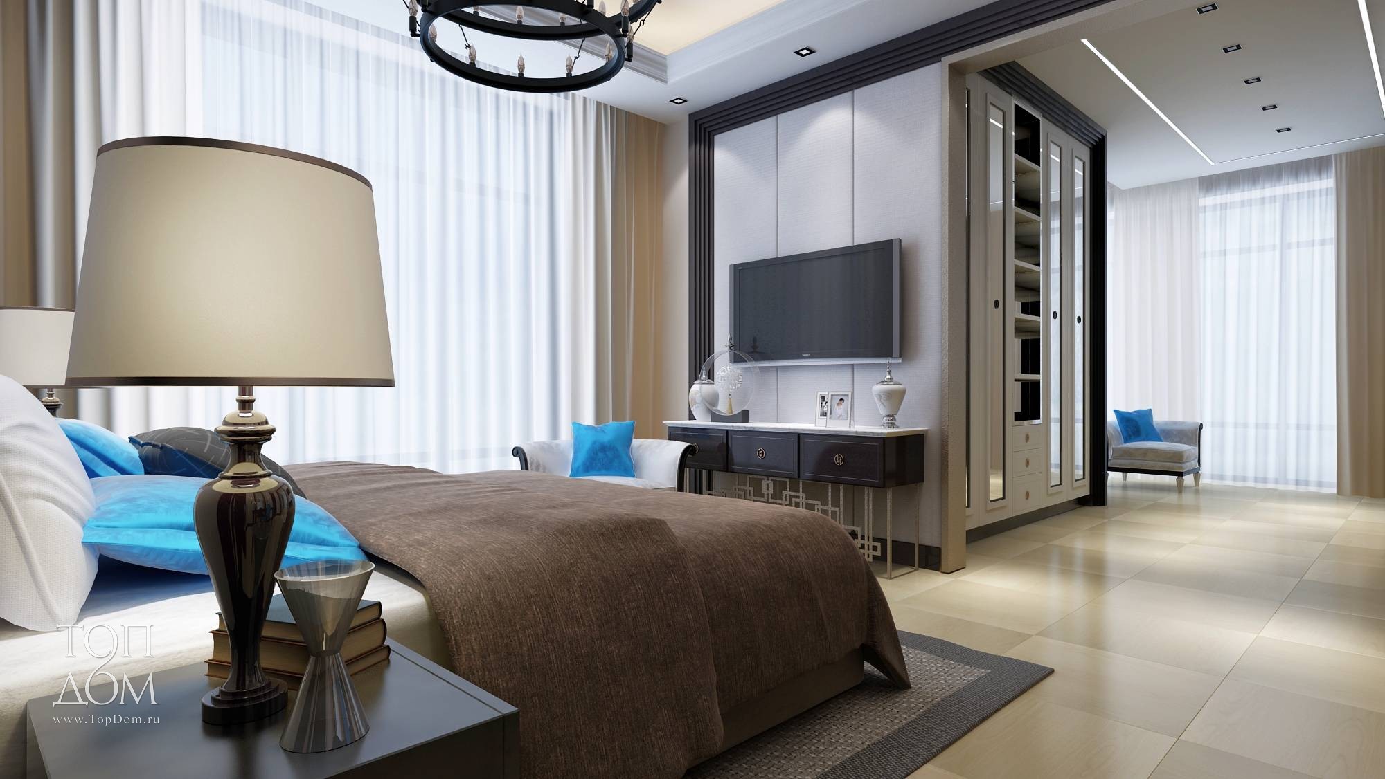 Интересное решение найдено для спальни из проекта красивого интерьера коттеджа. Она совмещается с большой гардеробной зоной с естественным освещением. Часть шкафов встроена за перегородкой с телевизором. Светлая фоновая палитра помогает восприятию пространства как единого целого.