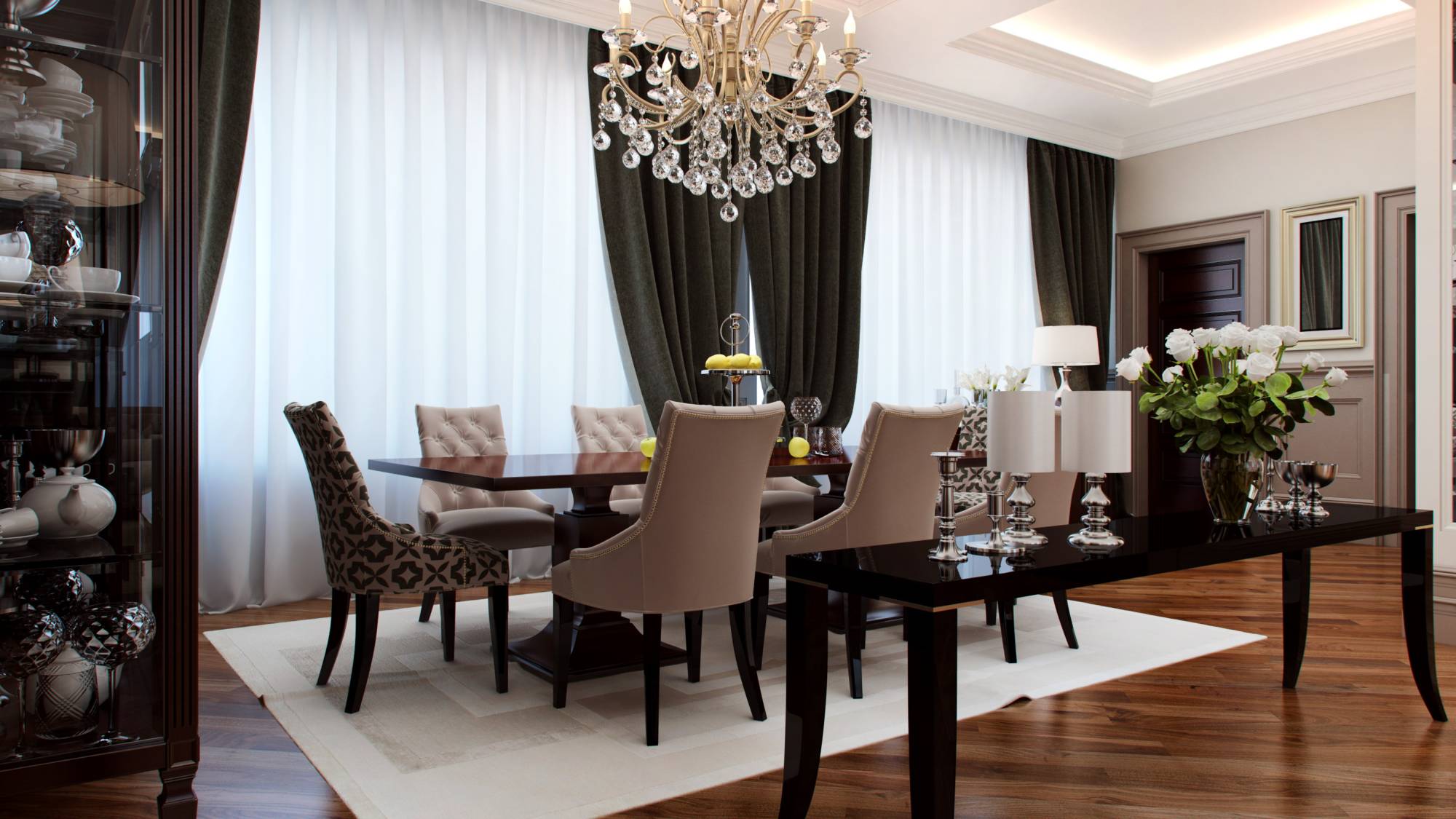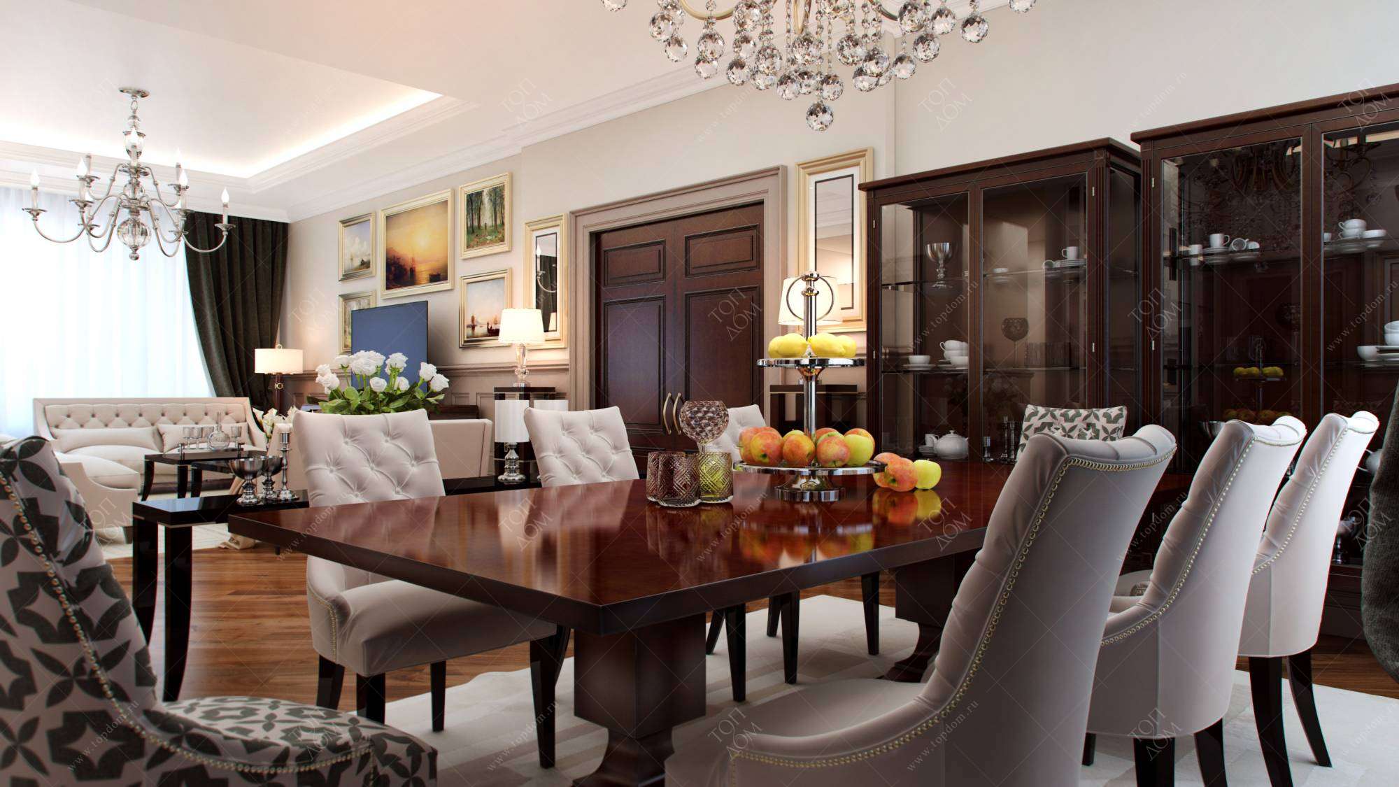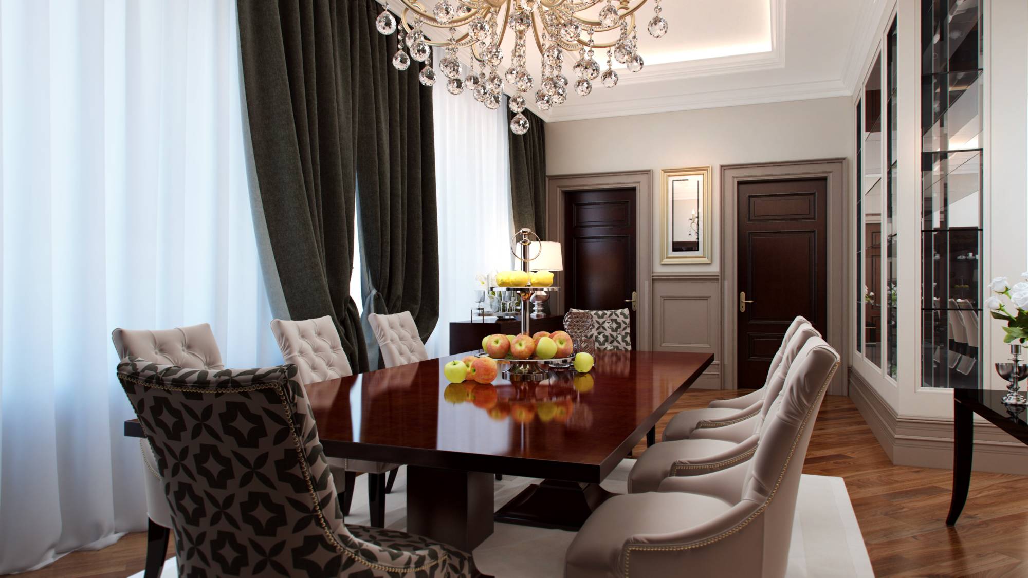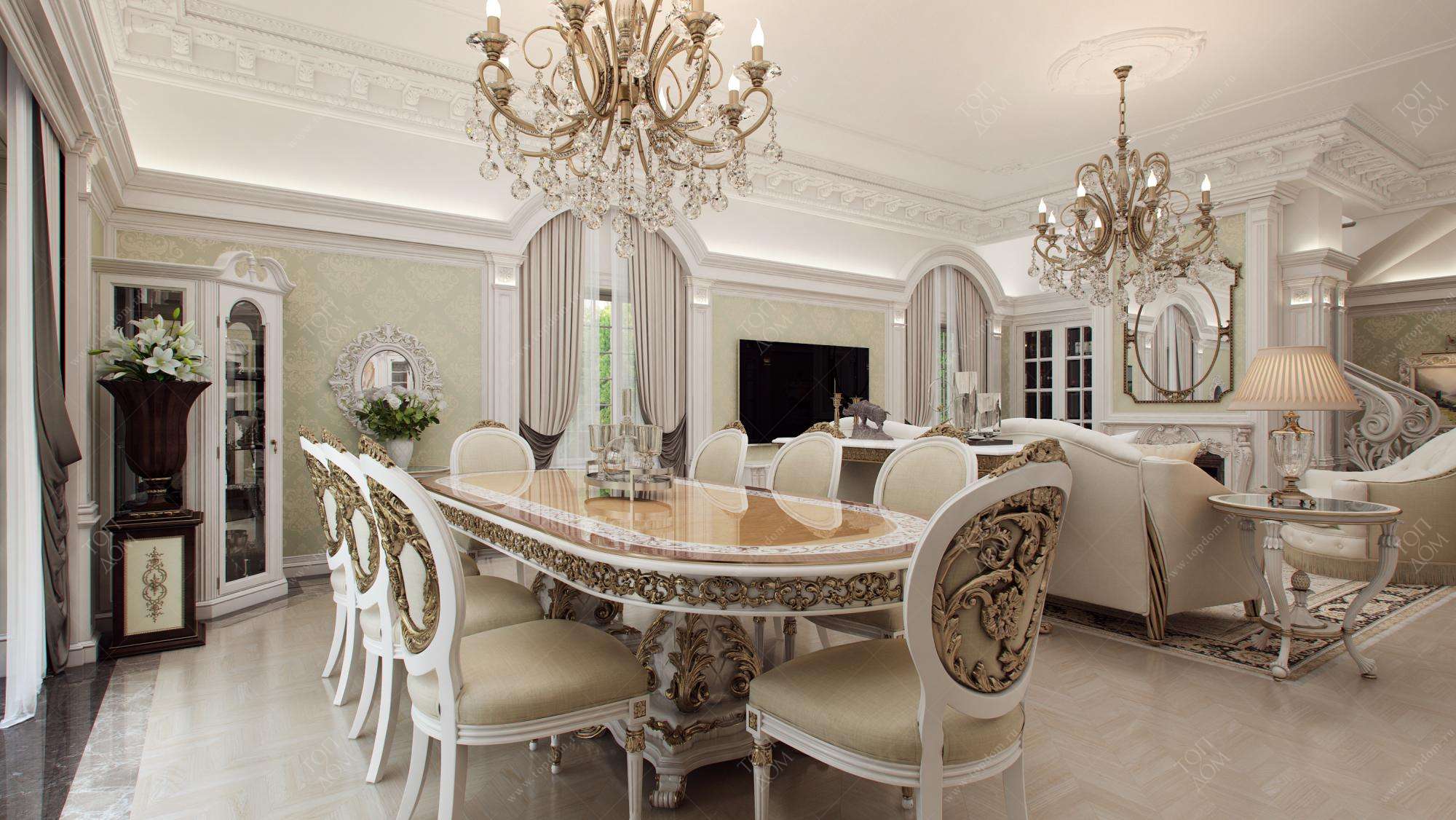 В проекте шикарного оформления частного дома в едином пространстве выполнены гостиная, столовая и совмещенная с ней кухня. Классический стиль проявляется в роскошной светлой мебели с резным декором, сложной потолочной лепнине, хрустальных люстрах. Простор объединенного помещения подчеркивает благородная бежево-оливковая гамма.