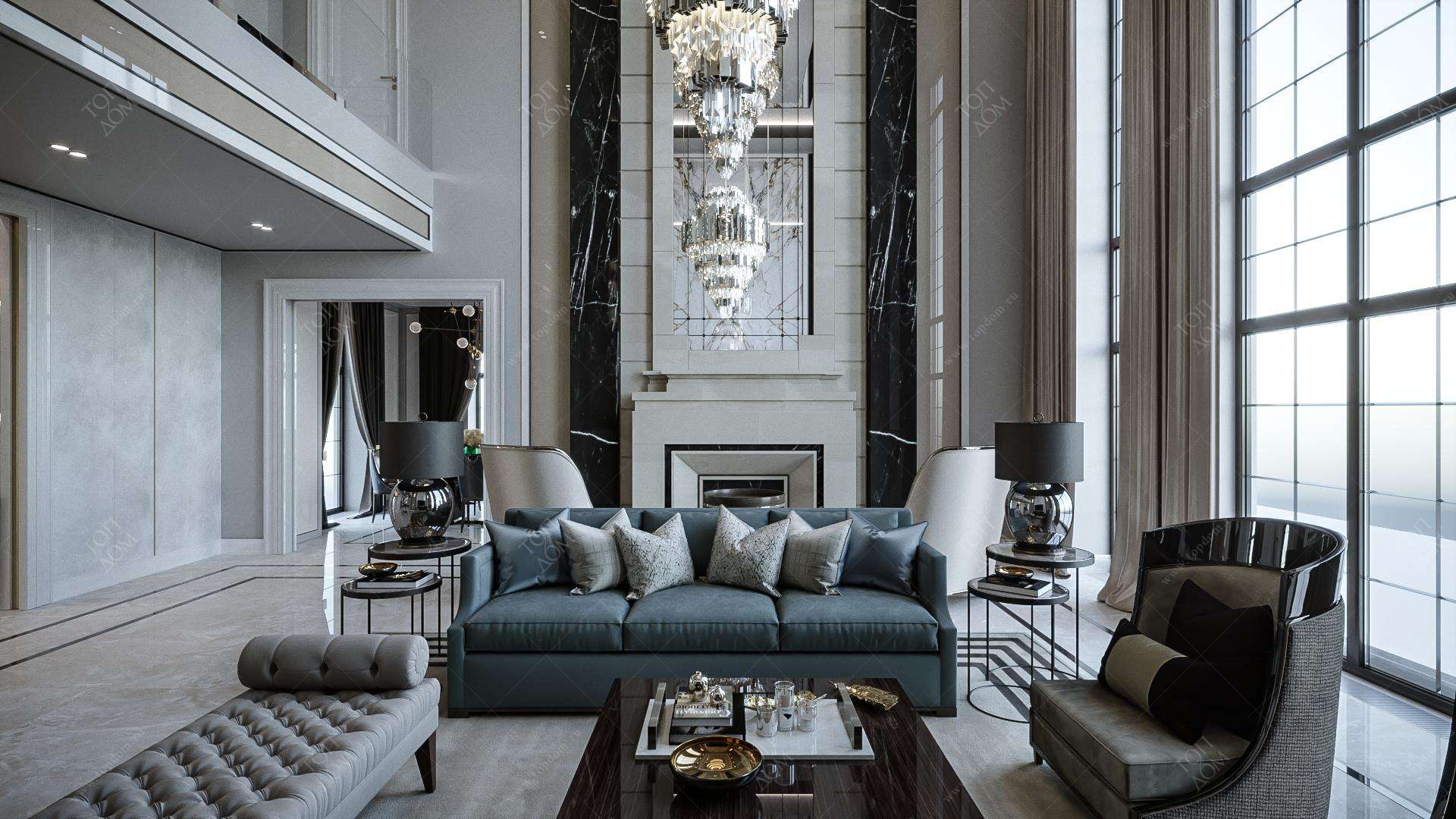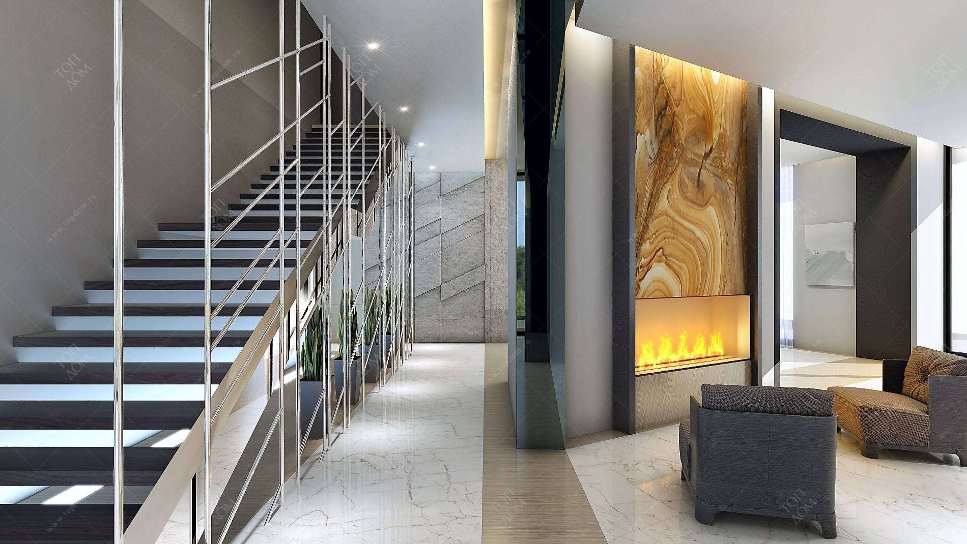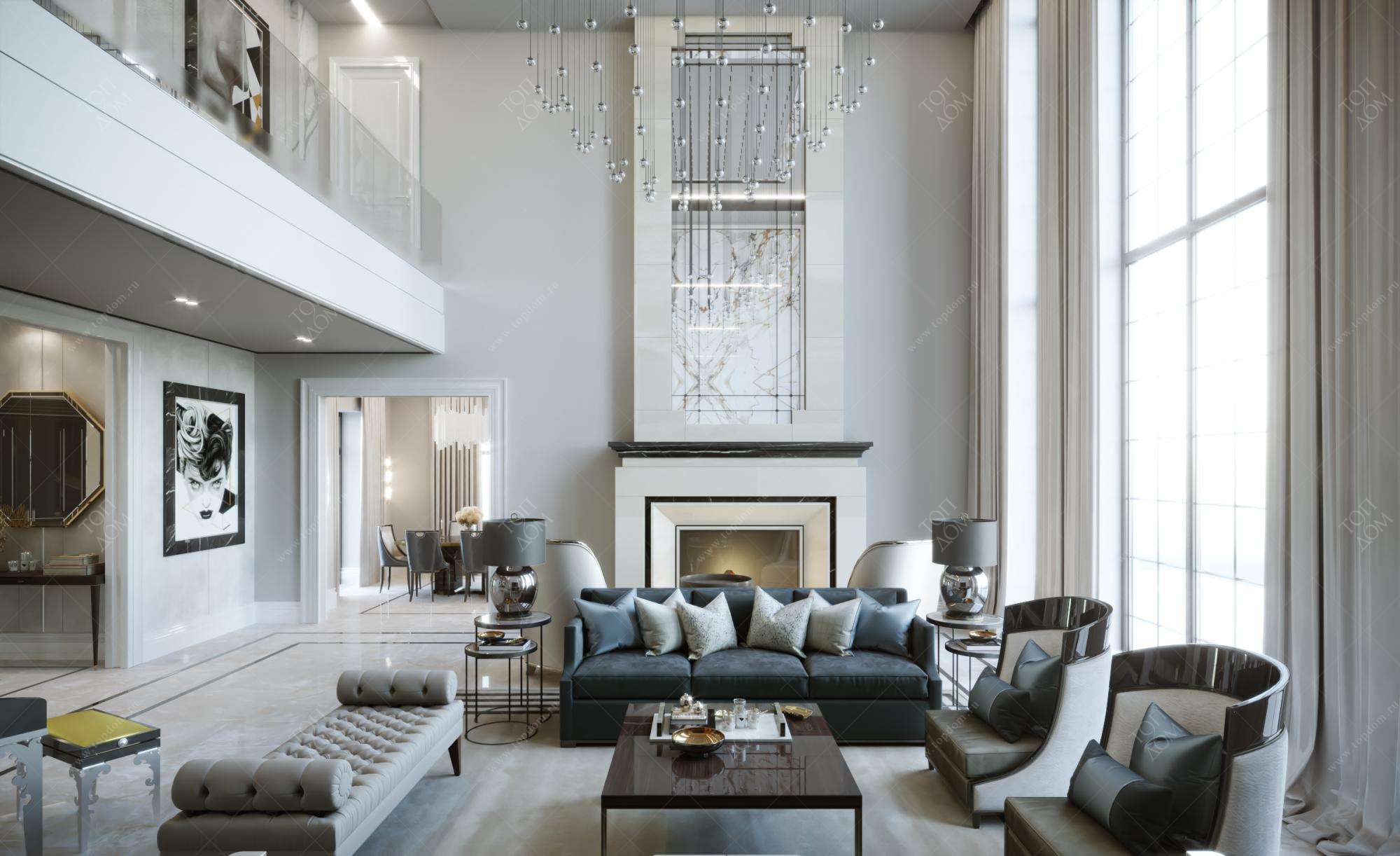 В проекте оформления интерьеров дома представлены две идеи отделки гостиной. В первом случае каминная зона более светлая, во втором – акцентирована черным мрамором. Еще одно различие кроется в дизайне центральной люстры.