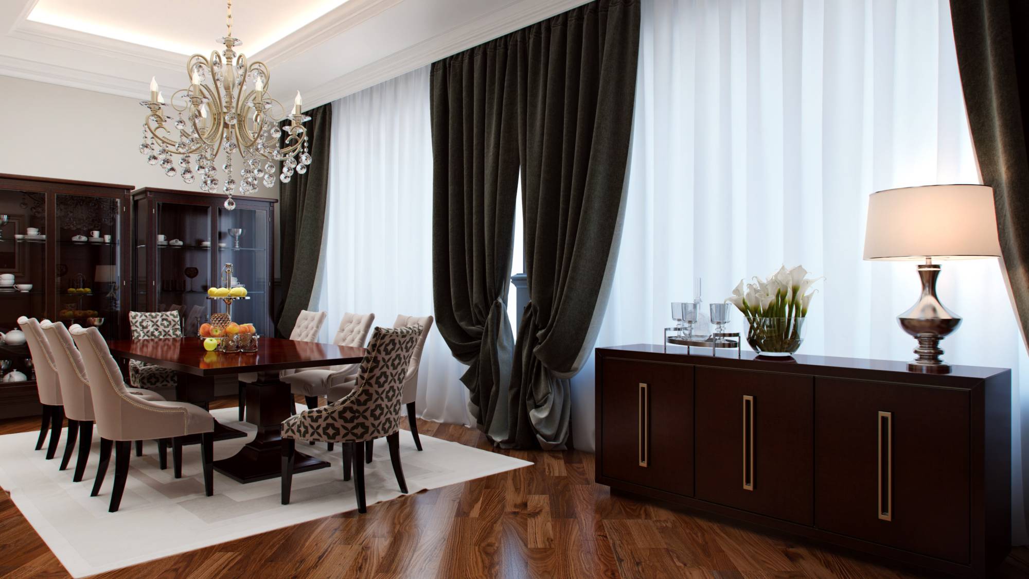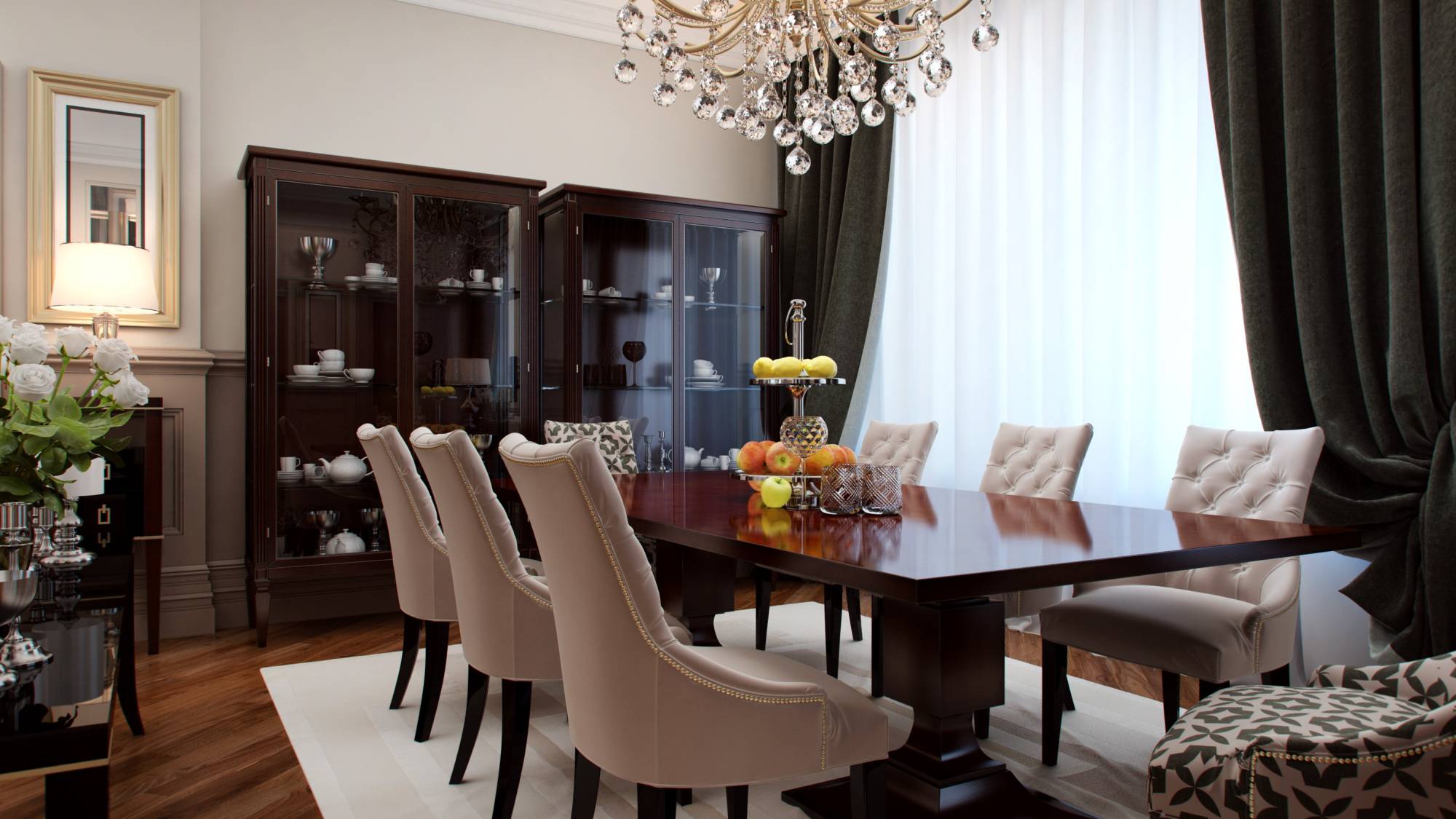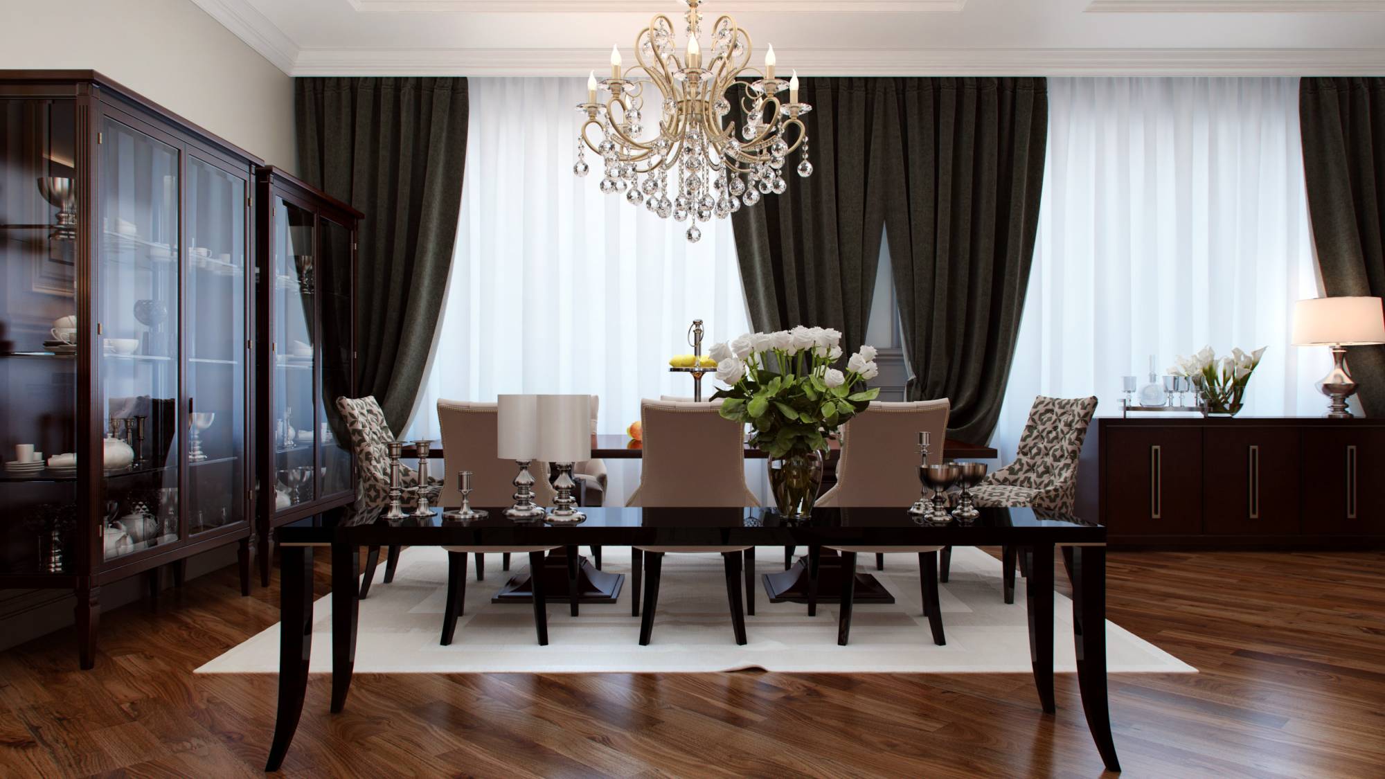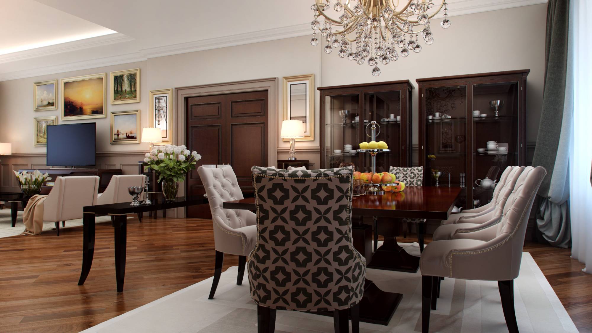 - Темно-коричневая мебель из ореха (обеденный стол, витрины, тумба под телевизором, комод, межкомнатные двери) и паркет дополняют светлый фон насыщенной, благородной палитрой.