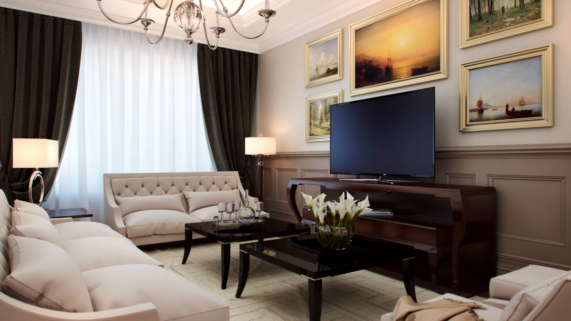 Каждая из зон гостиной имеет собственный основной источник освещения – классическую рожковую люстру.