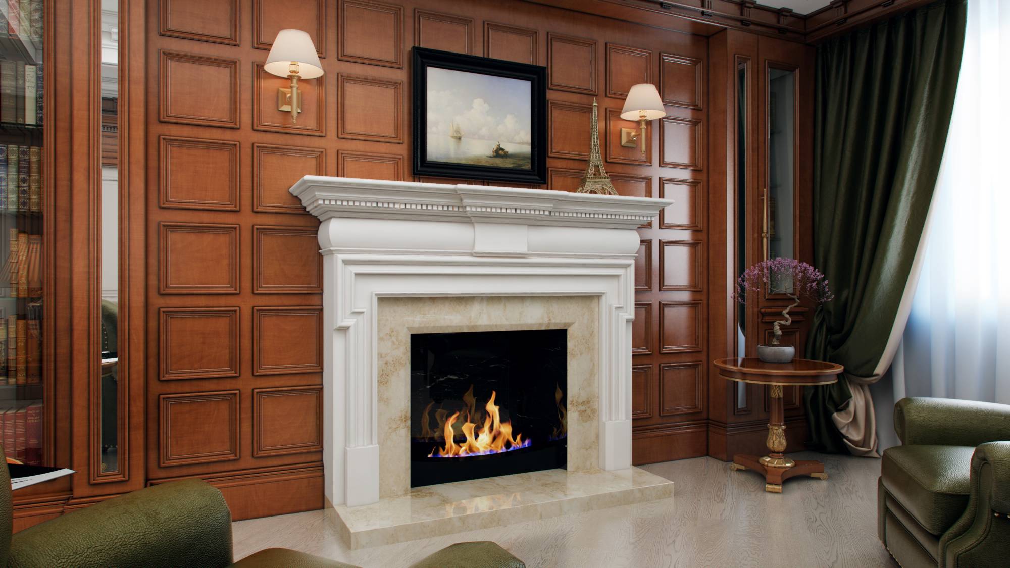 Современный электрокамин обрамлен классическим порталом из бежевого мрамора и белоснежной лепнины. Перед ним – два кожаных кресла темно-охристого оттенка, их дополняют темно-зеленые шторы. Природная зеленая гамма хорошо гармонирует с коричневой, поэтому интерьерная композиция приобретает завершенный вид.