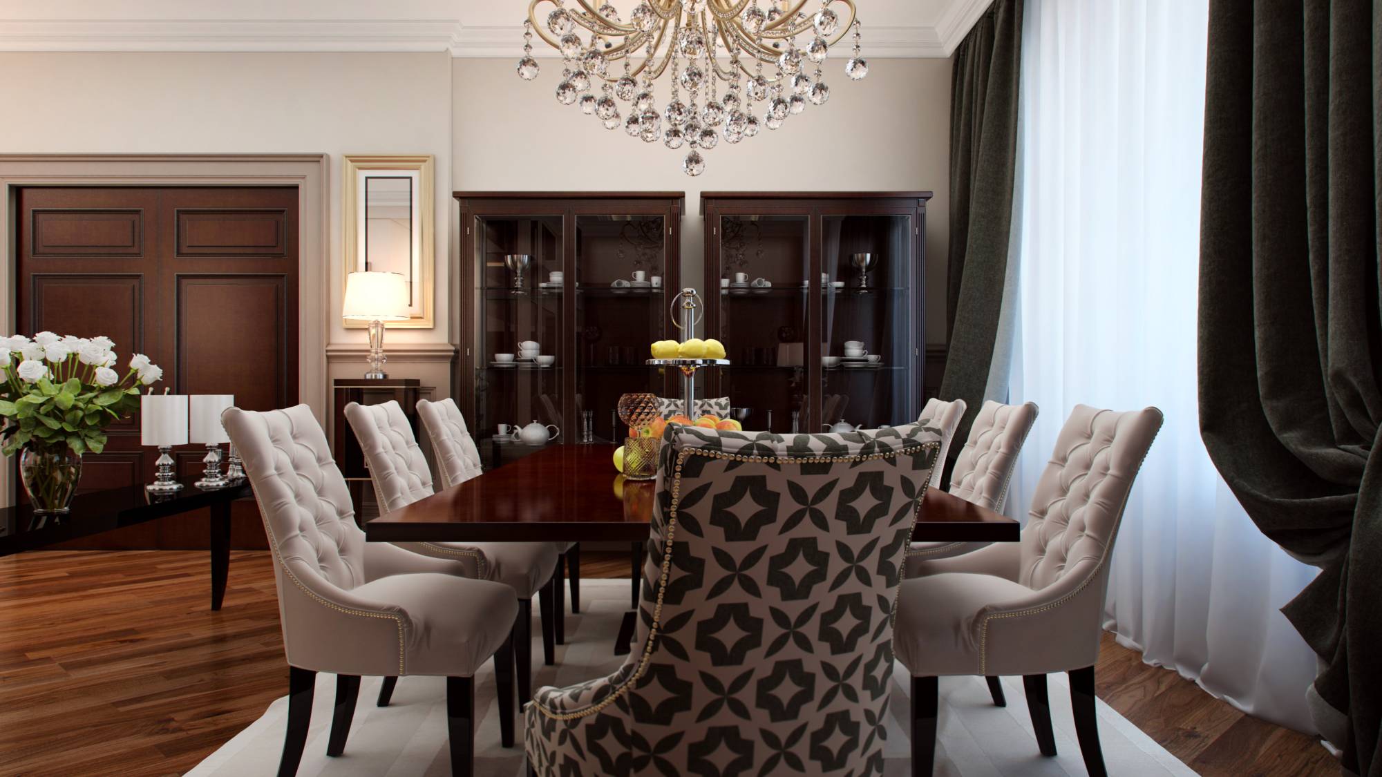 - В светло-бежевом исполнении подобрана обивка диванов и кресел. На однотонной ткани очень привлекательно смотрится каретная стяжка и золотые обивочные гвоздики. Пара стульев в столовой украшена темно-серым орнаментом, это помогает визуальной акцентировать зону.
