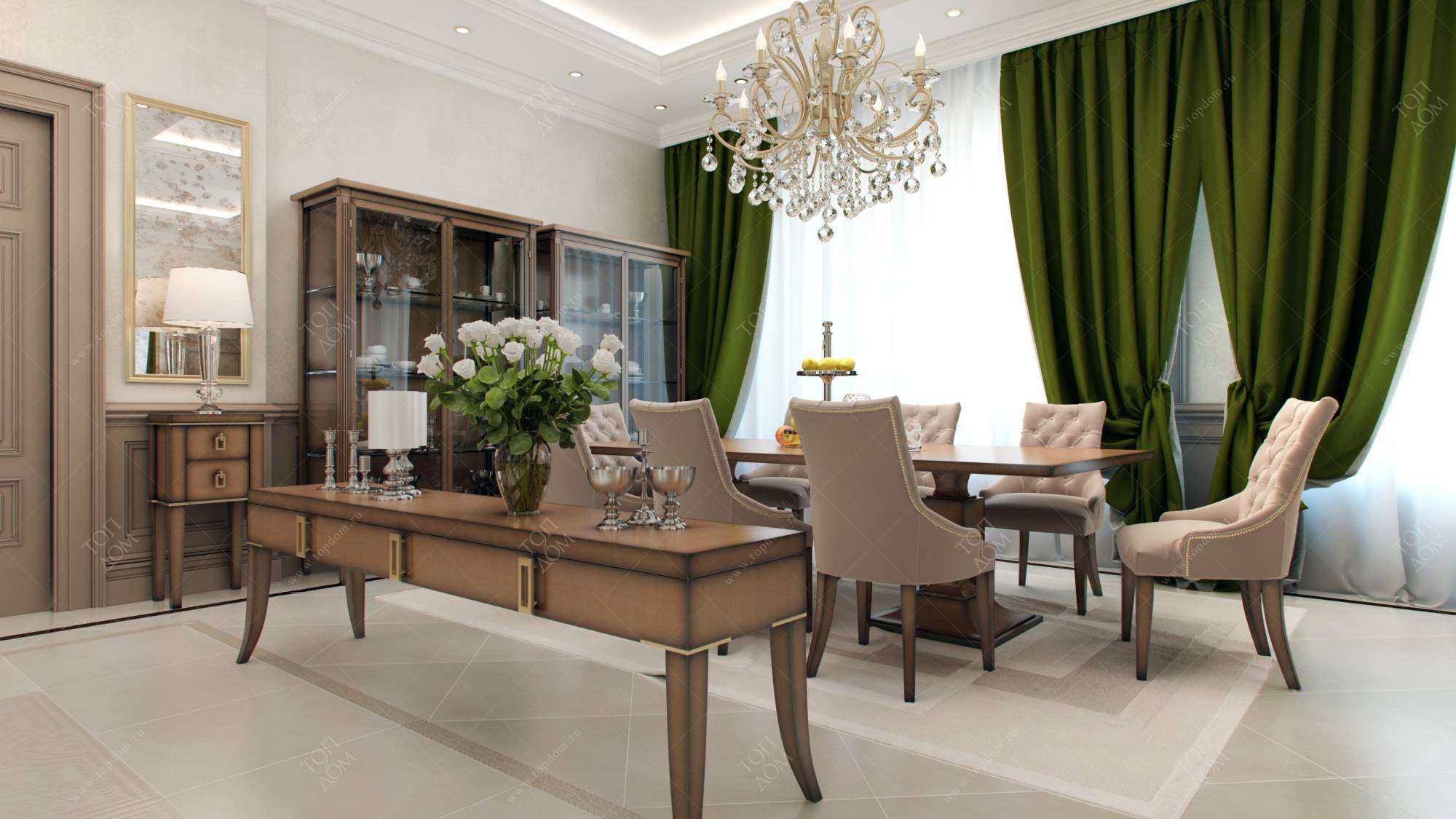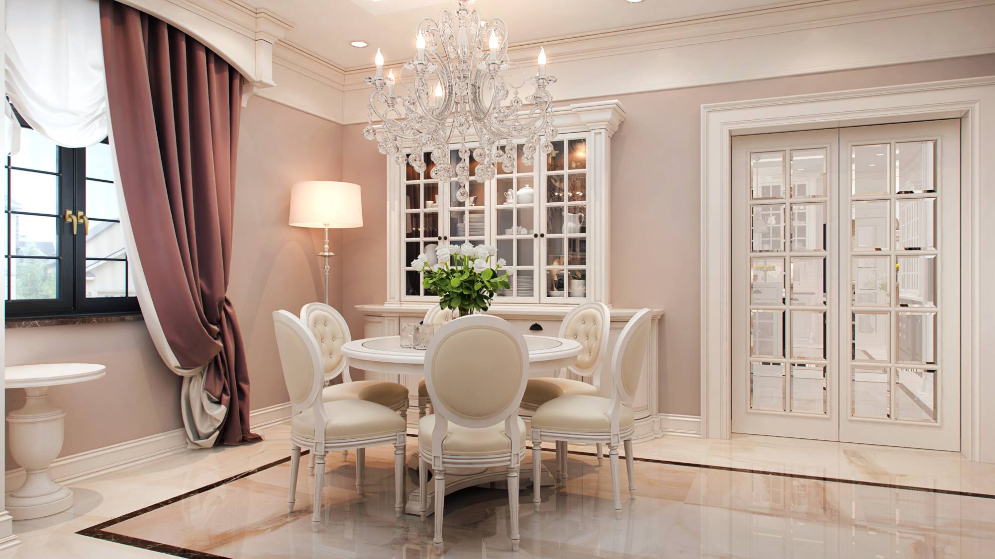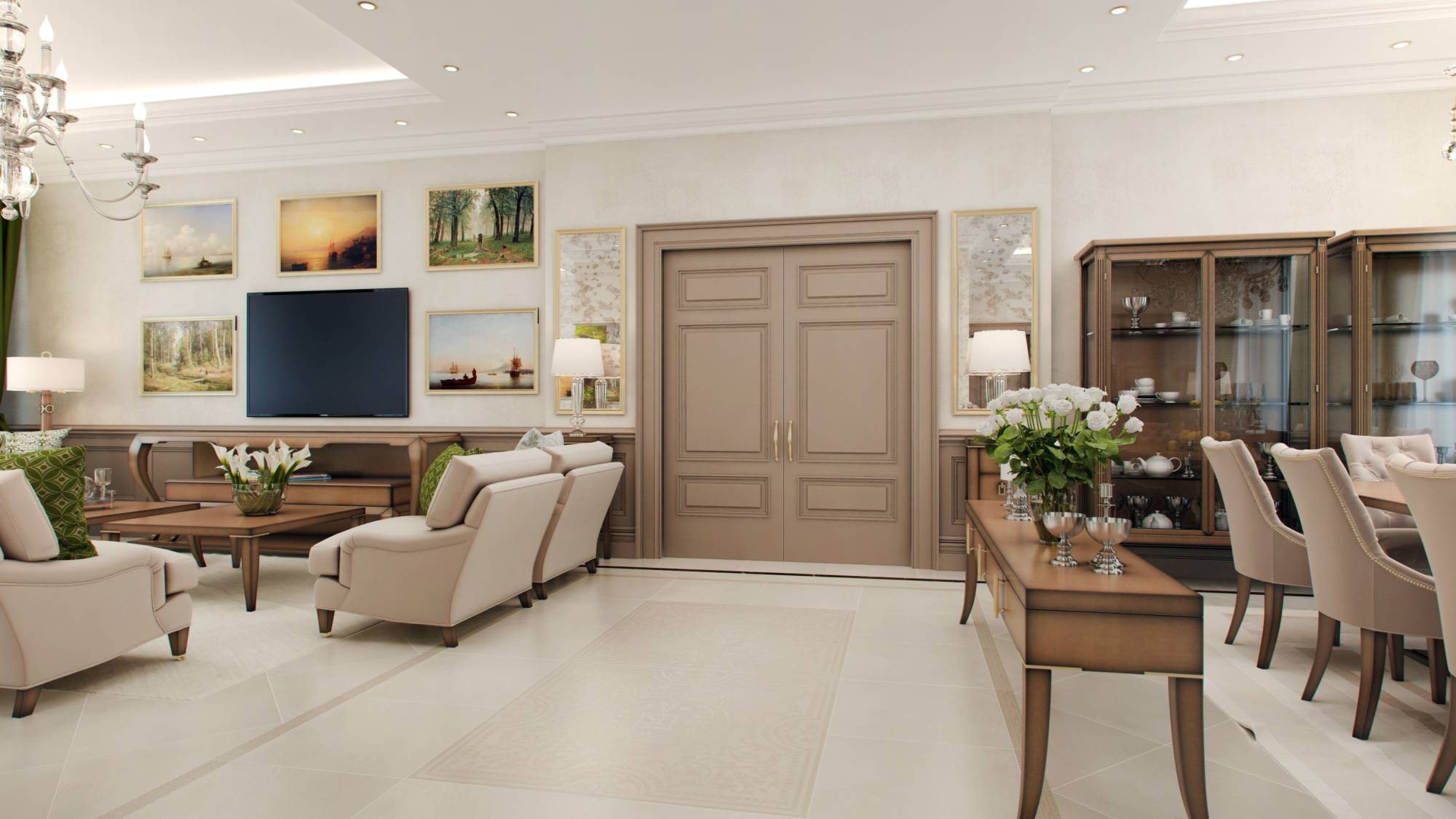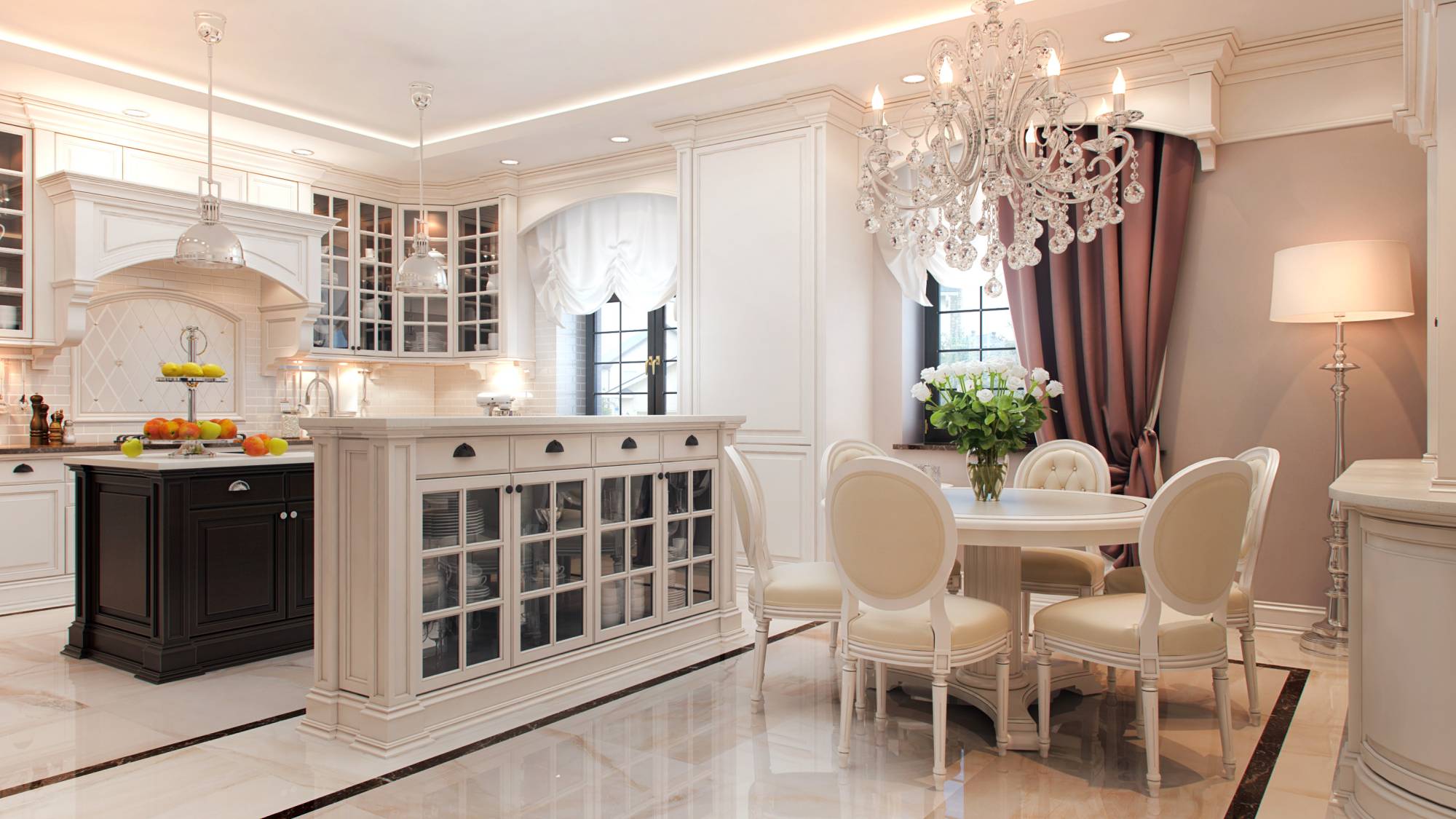 В дизайне гостиной, кухни, спальной комнаты парадные образы классики приобретают современное звучание. Особенно элегантной обстановку делает утонченная цветовая гамма в светлых тонах.