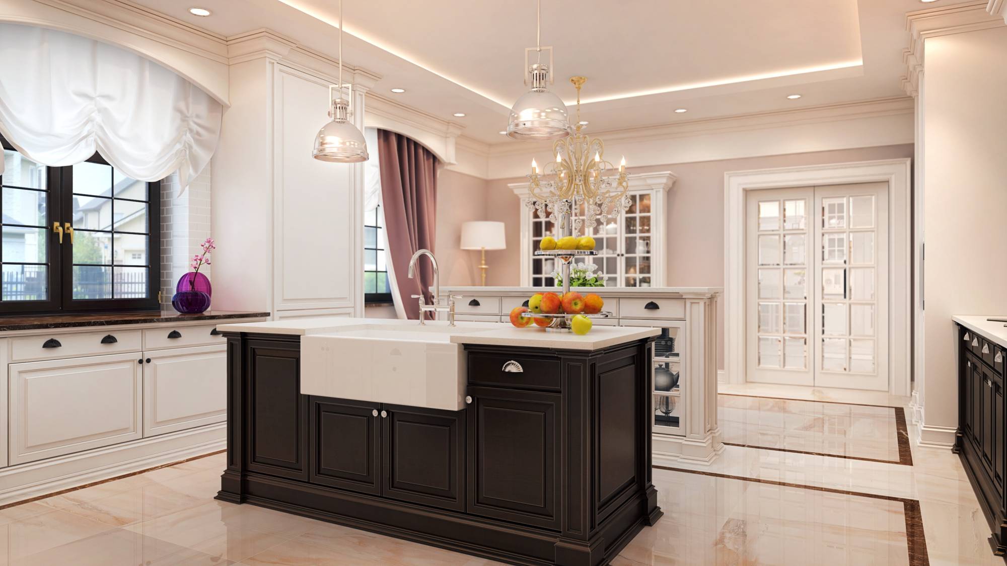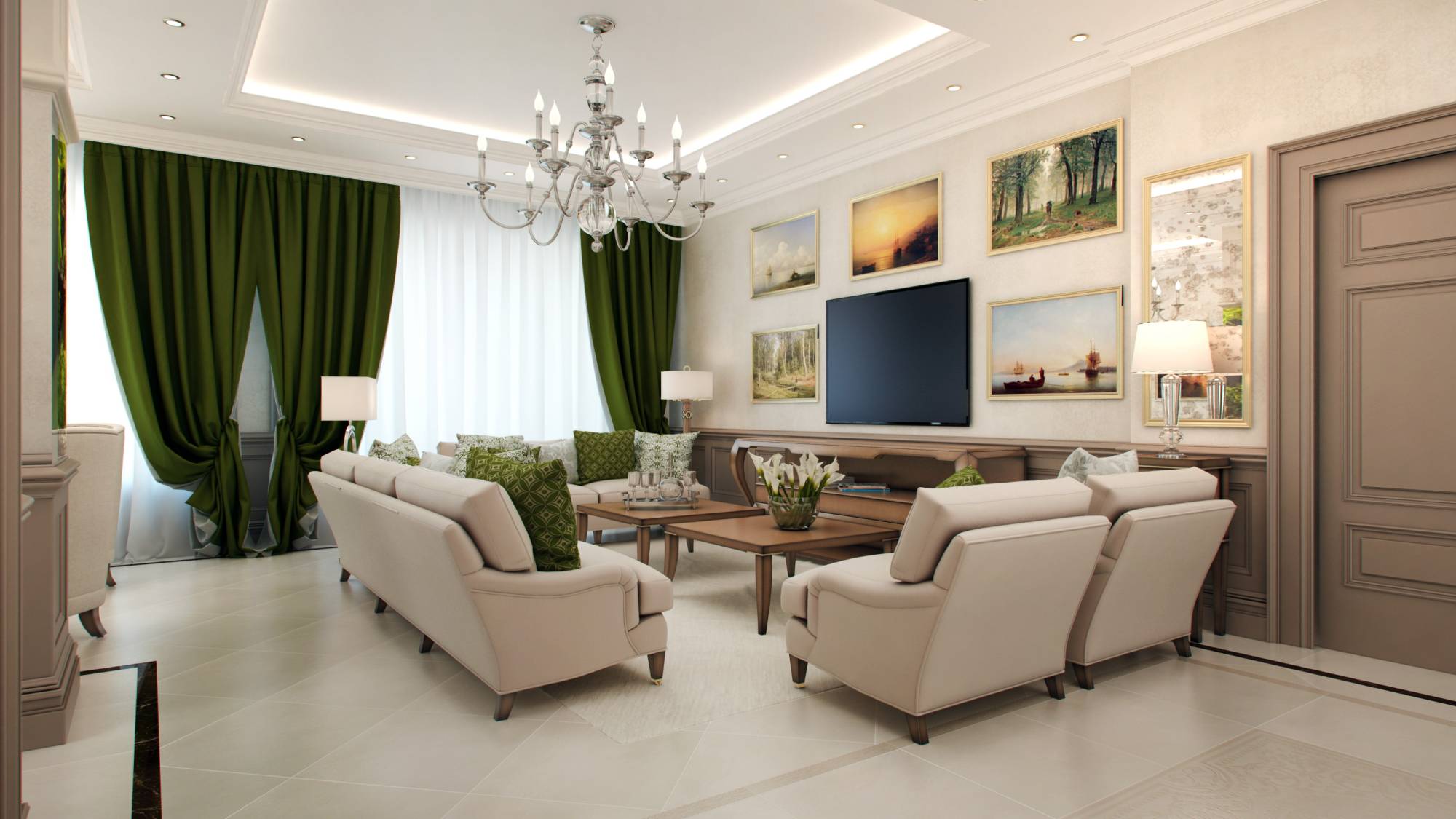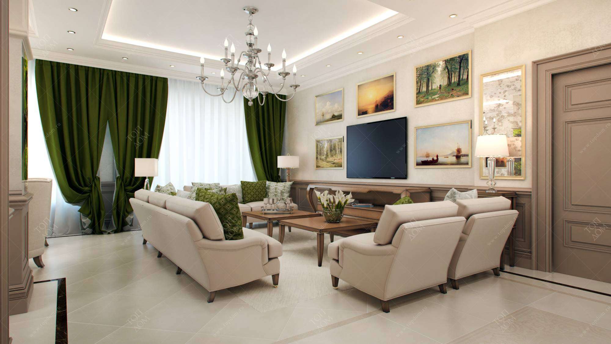 В дизайне гостиной, кухни, спальной комнаты парадные образы классики приобретают современное звучание. Особенно элегантной обстановку делает утонченная цветовая гамма в светлых тонах.