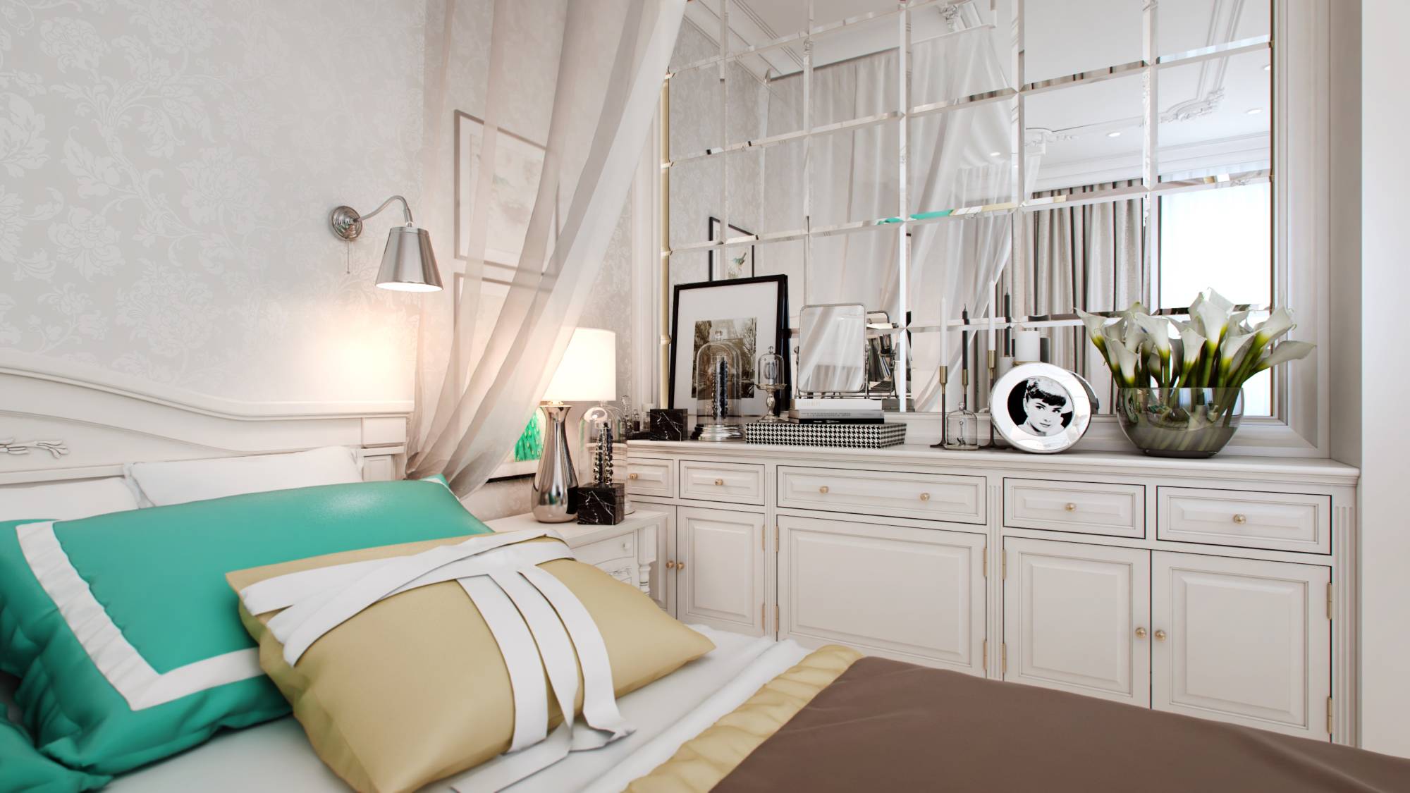 Проект уютного домашнего интерьера в неоклассической стилистике объединяет традиционные элементы (лепнину, обои, пастельную палитру, декор) и современный подход к организации пространства, светлые объемы и зеркальные перспективы.