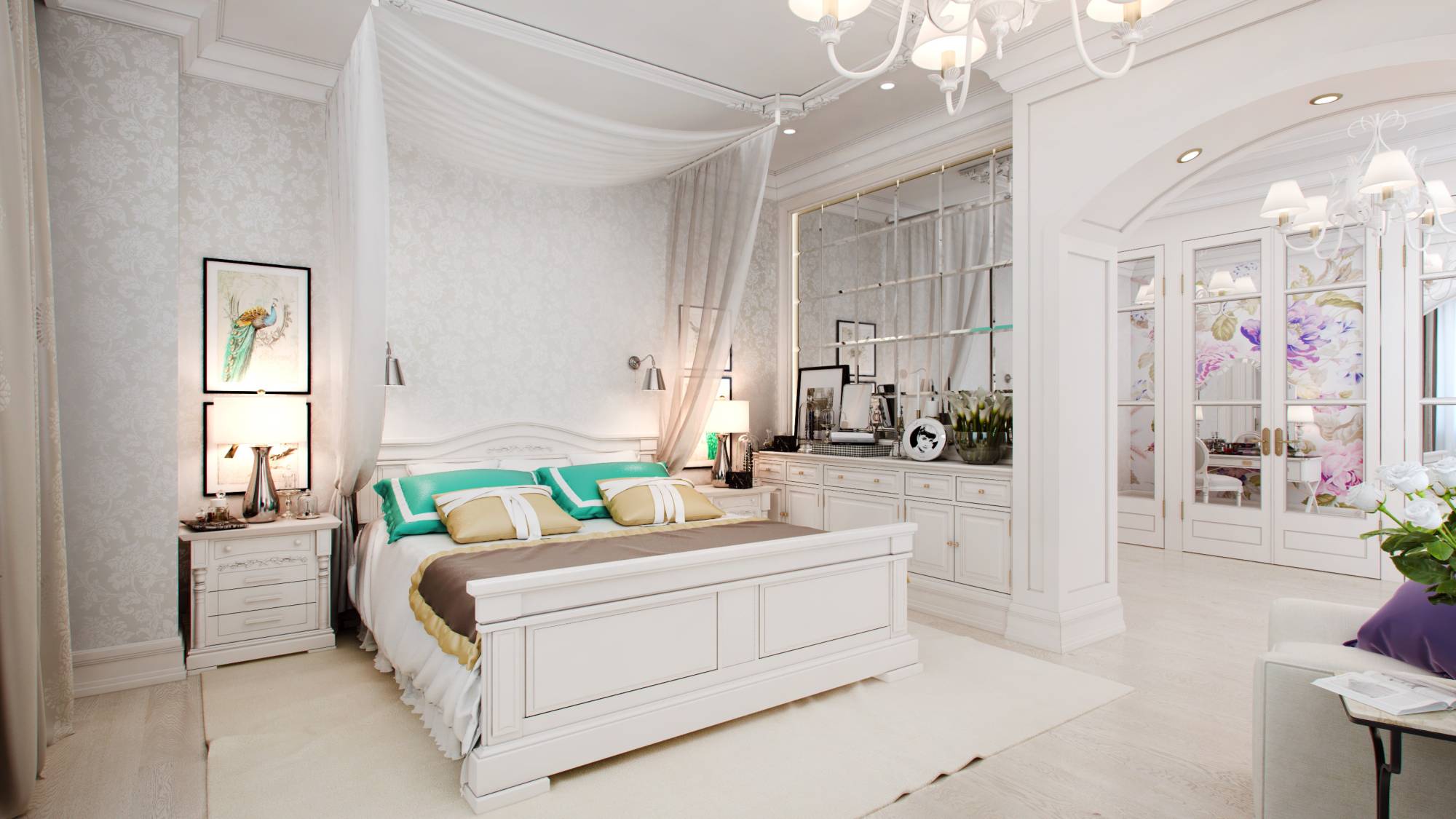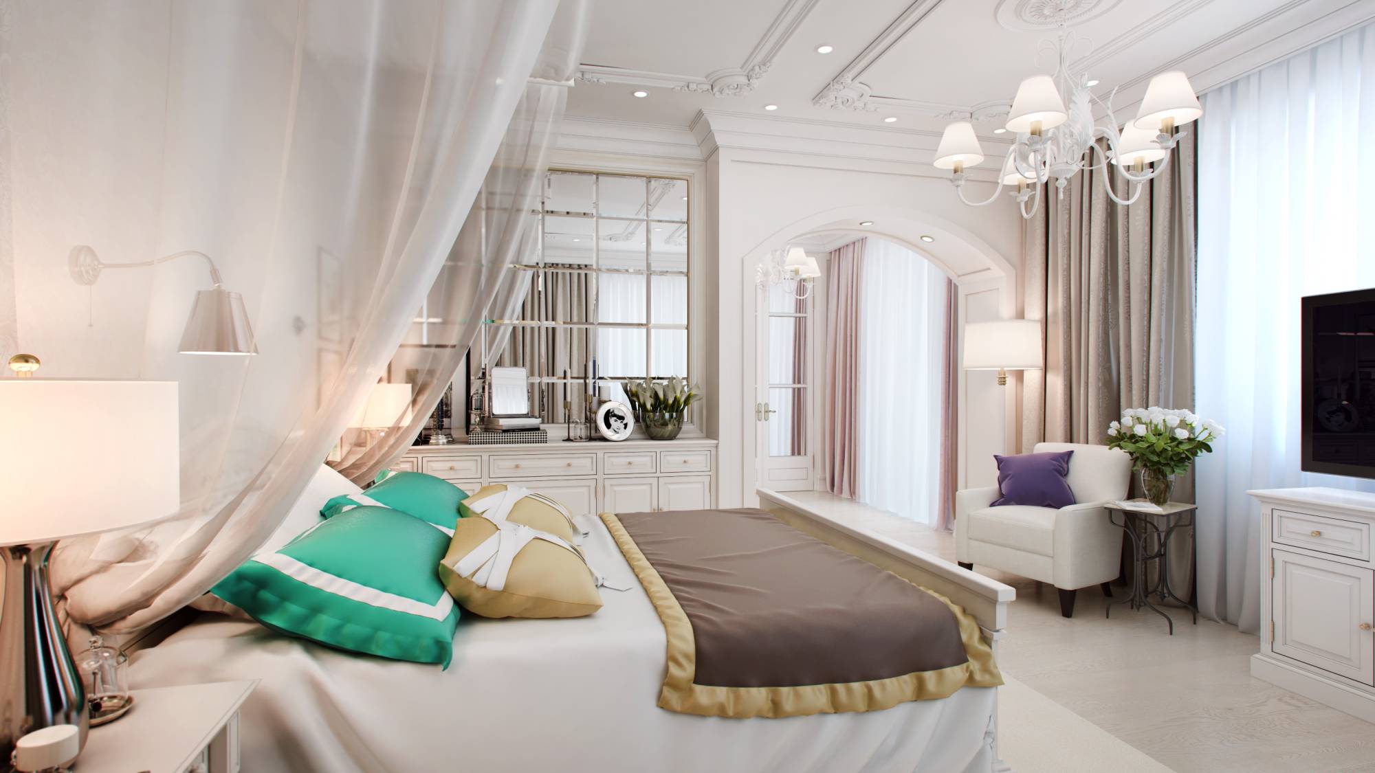 Классическая спальная комната – светлая и просторная. Для создания комфортного интерьера приватной зоны традиционные классические элементы отделки соединились с современными атрибутами.