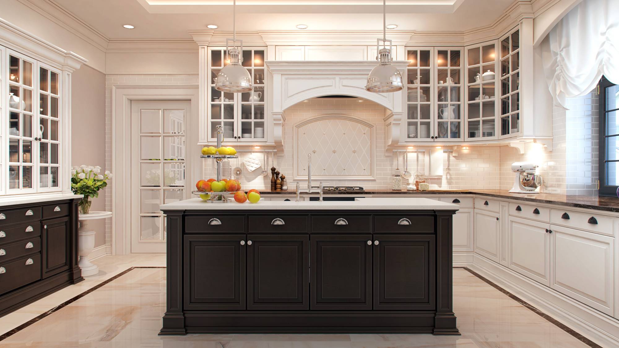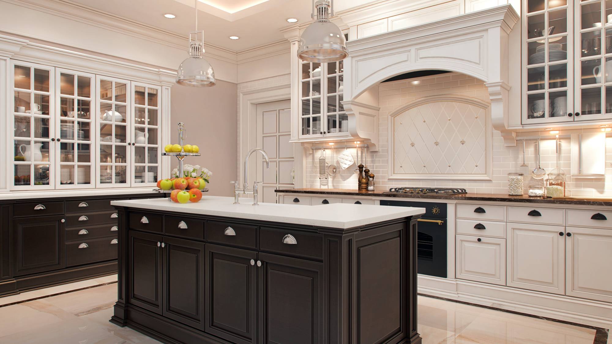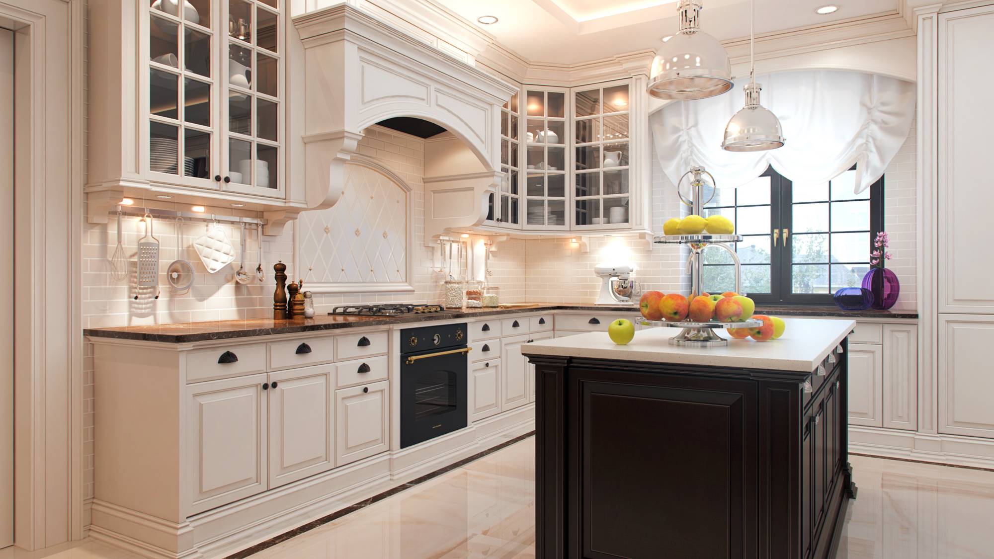 - Вытяжка замаскирована декоративной белой аркой, переходящей в подвесные шкафы. Прозрачные фасады шкафов украшены тонкими деревянными переплетами белого цвета, глухие – традиционными филенками.