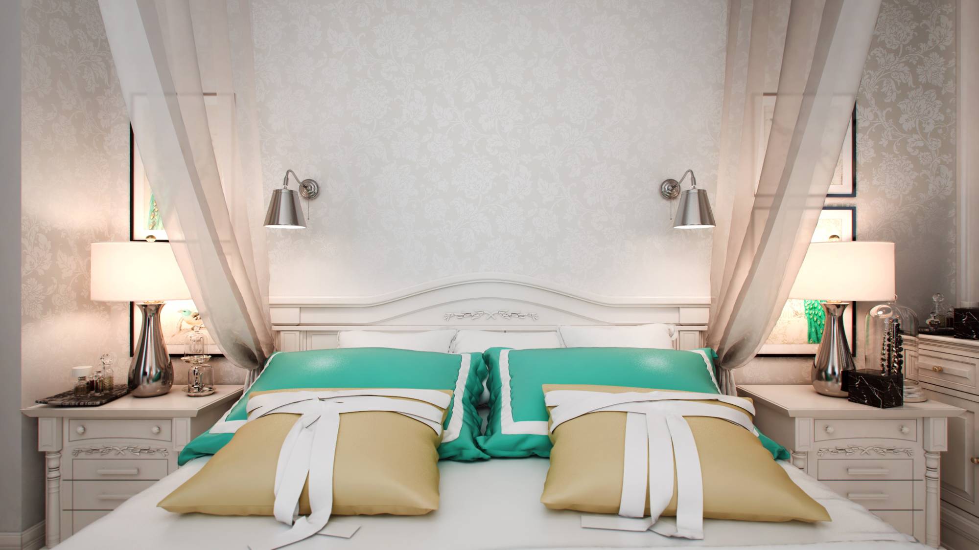 Стены комнаты оклеены светло-серыми обоями с растительным узором. Потолок украшен гипсовой лепниной. Над изголовьем двуспальной кровати прикреплен струящийся полупрозрачный балдахин. Текстиль (бирюзовые и сиреневые подушки, коричневое покрывало) вносит в светлое окружение дозированные цветовые акценты. А блестящие металлические бра и настольные лампы придают обстановке актуальный характер.