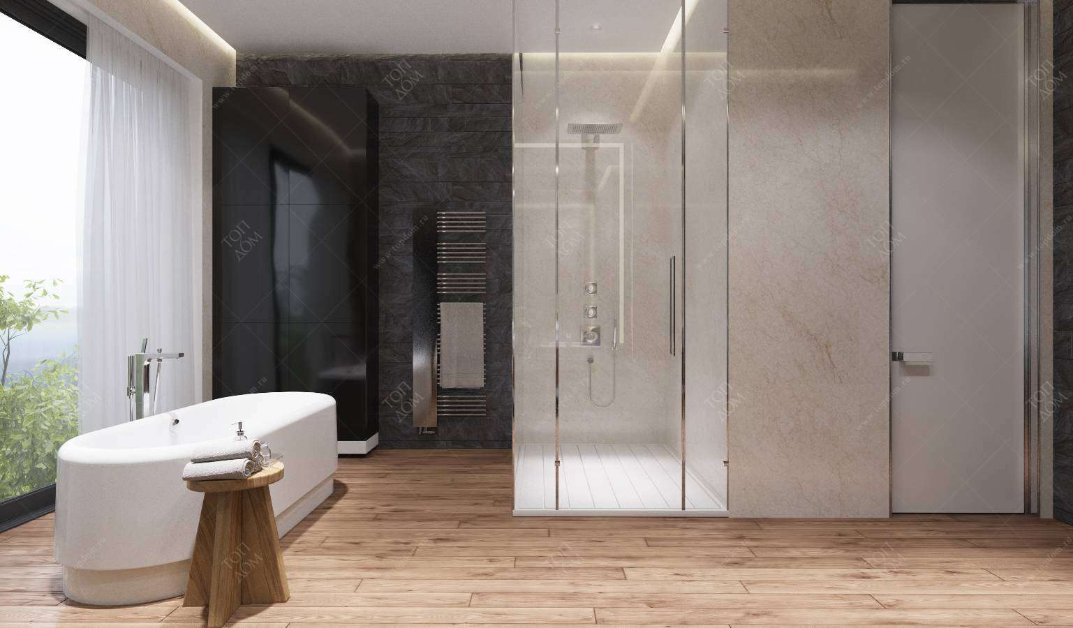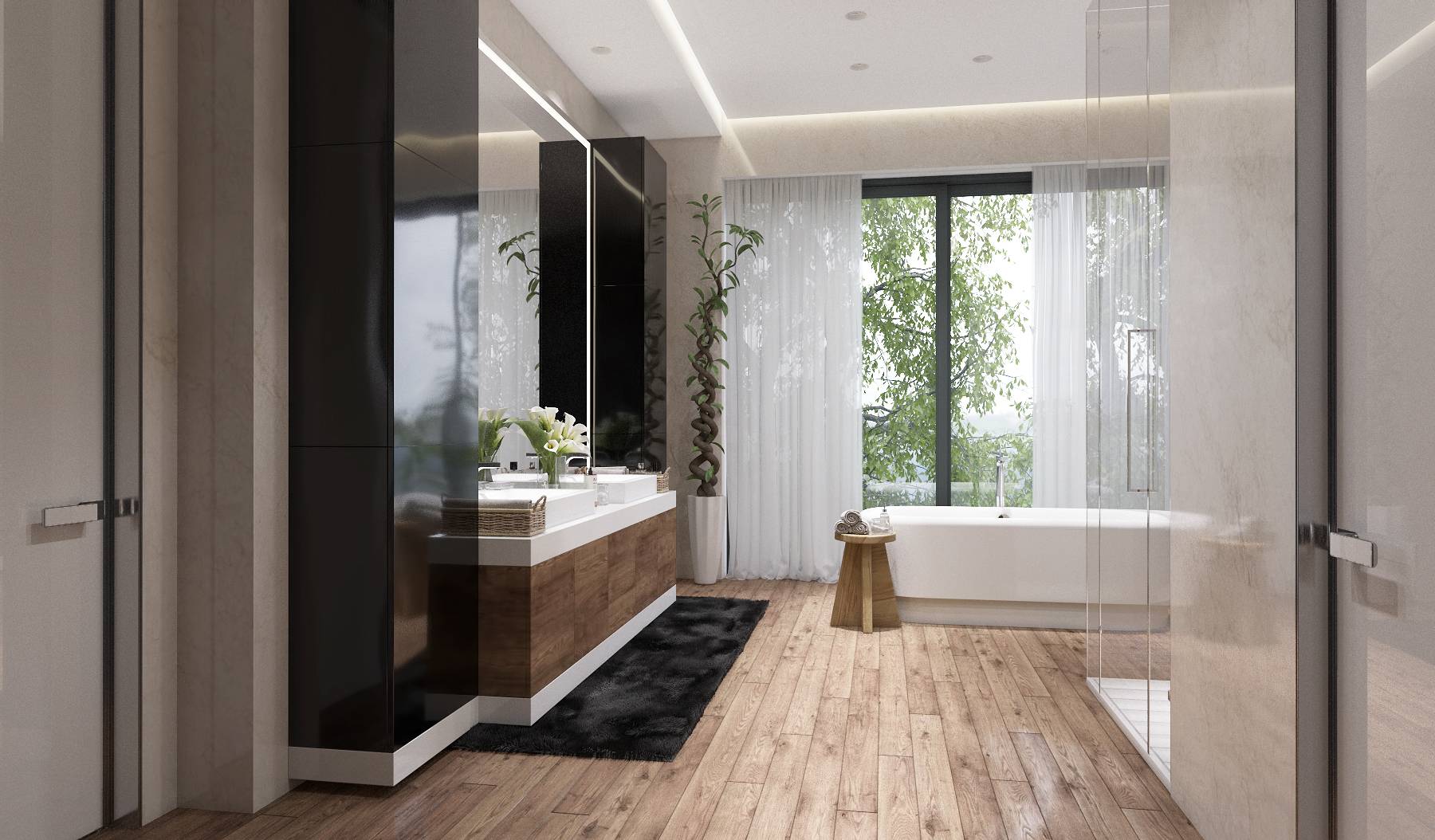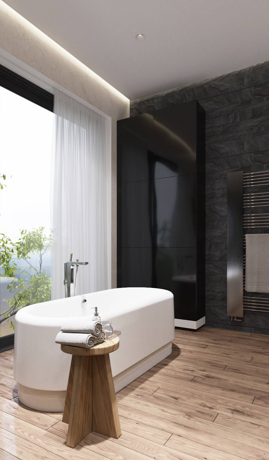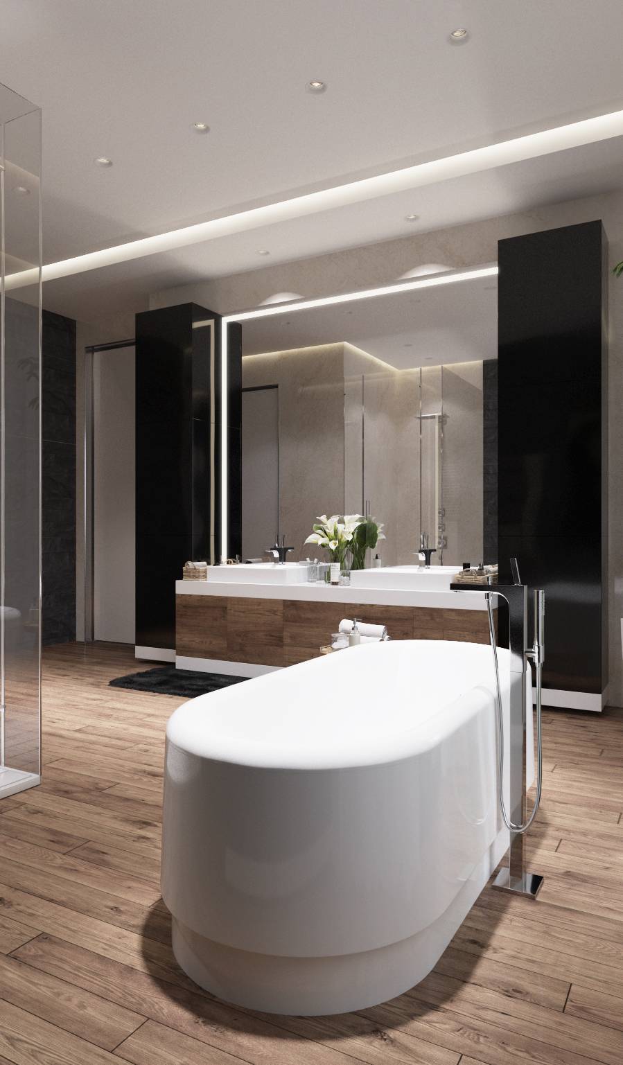 В композиции с черными матовыми шкафами еще ярче сияет белоснежная, отдельно стоящая овальная ванна.