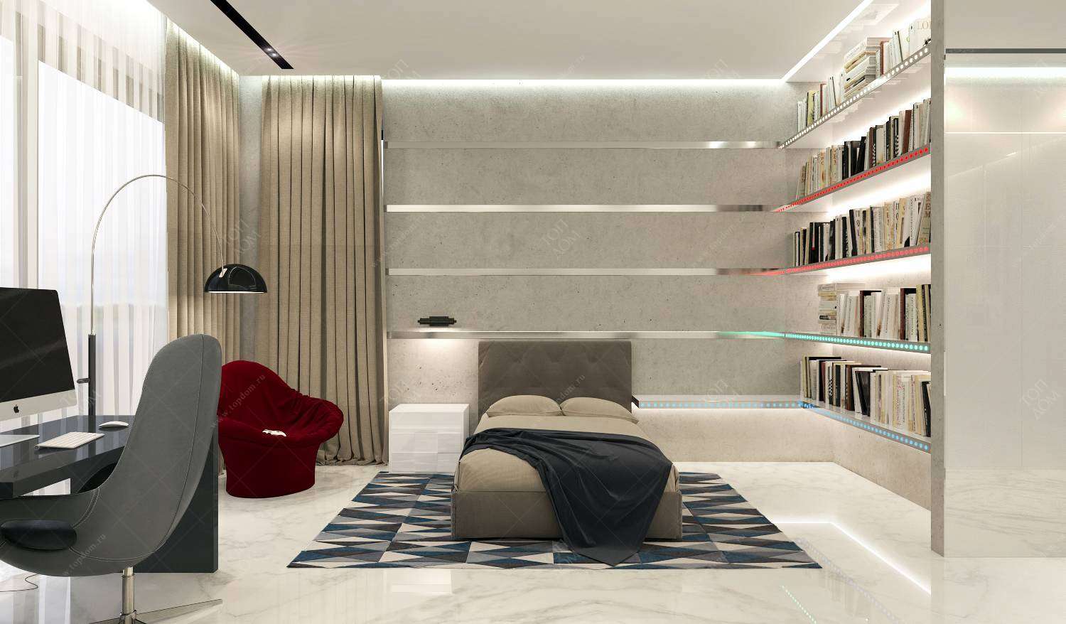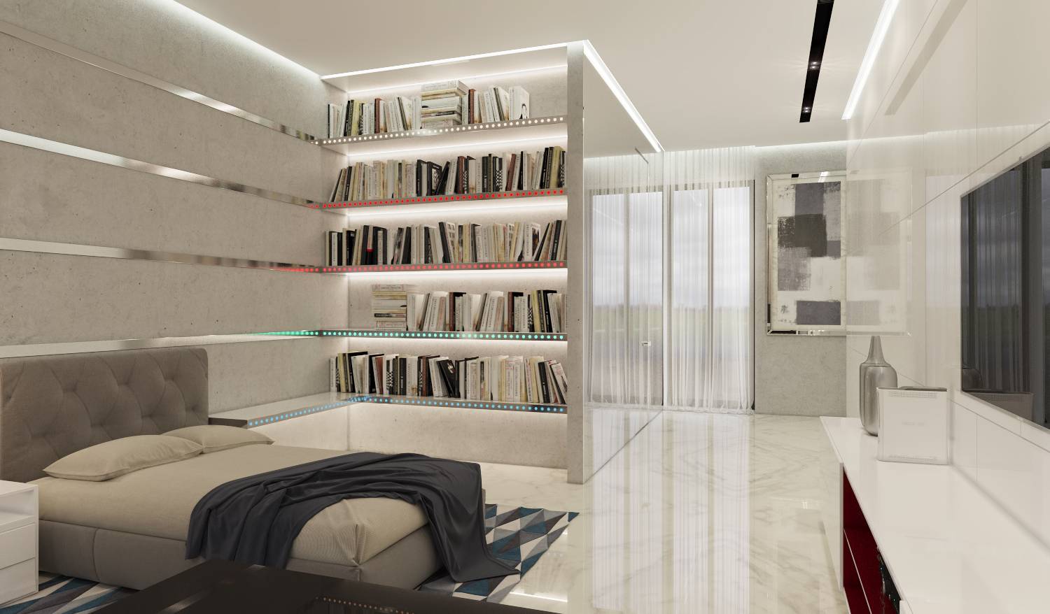 Полки книжного стеллажа оформлены алюминиевыми профилями с разноцветной неоновой подсветкой. Нижняя полка выполняет заодно функцию прикроватной тумбочки, остальные зрительно переходят на соседнюю стену в виде блестящих молдингов.
