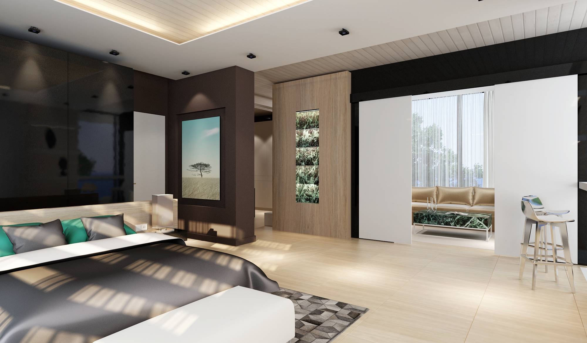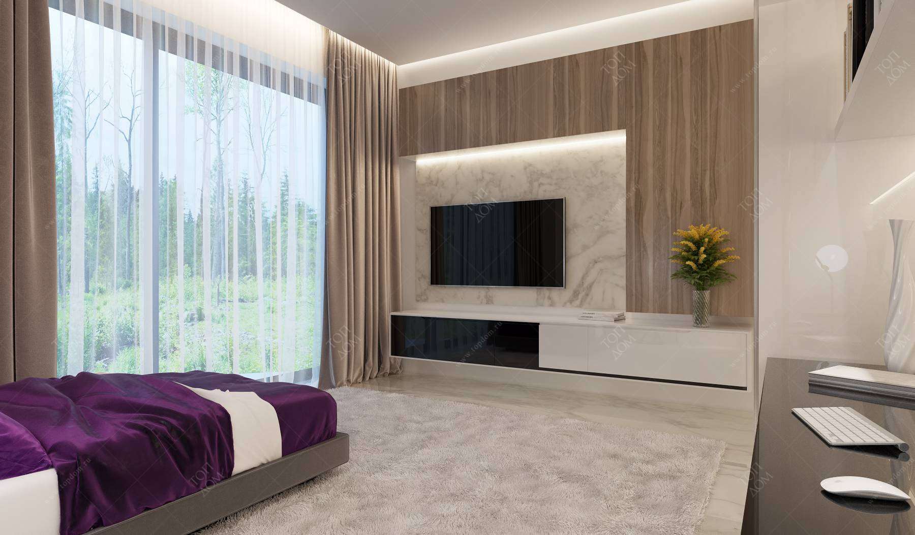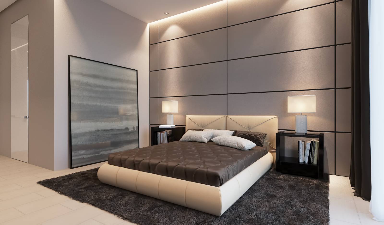 Фоном служит теплая бежевая гамма. Зона изголовья затемнена черными и коричневыми панелями.
