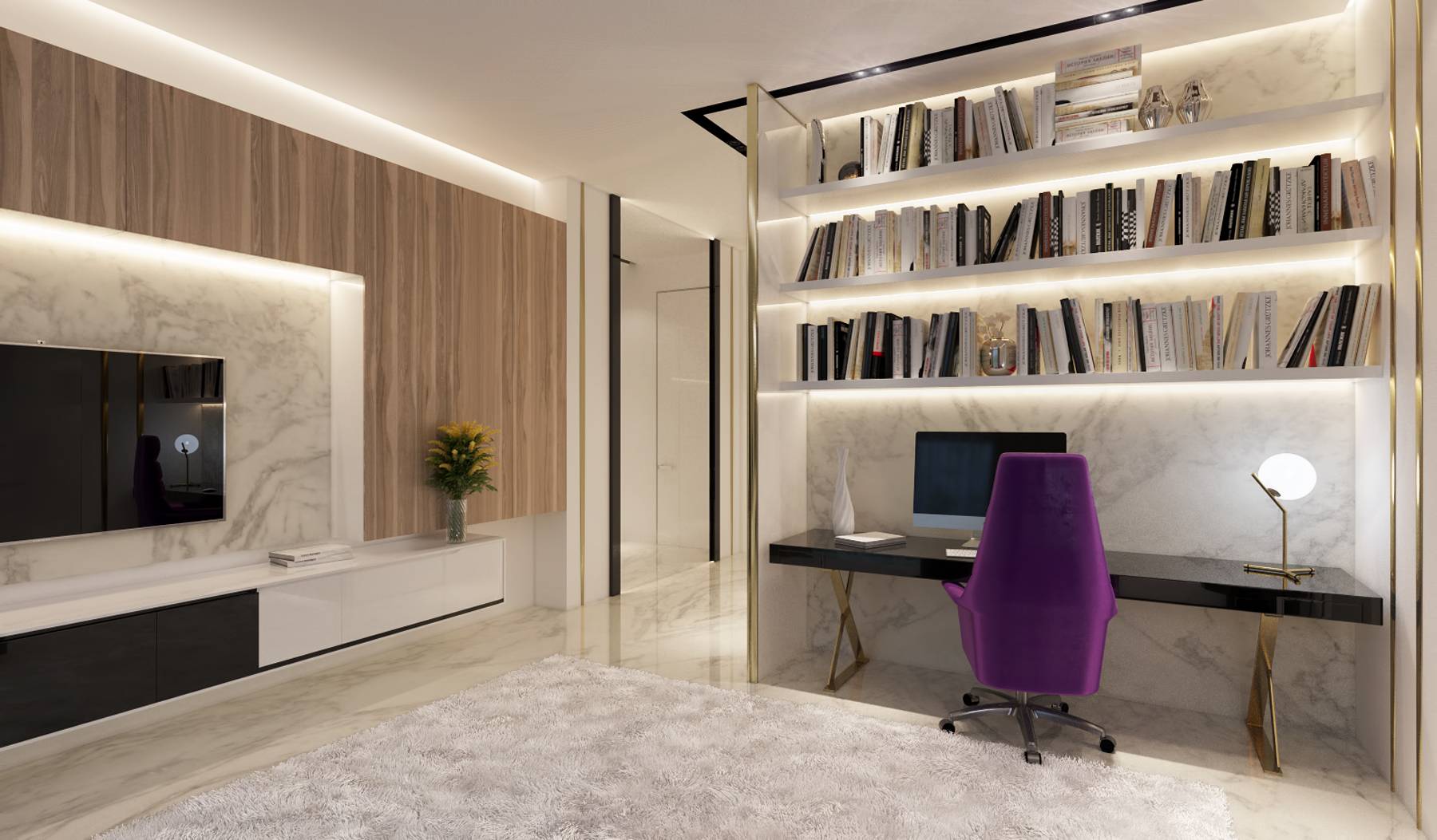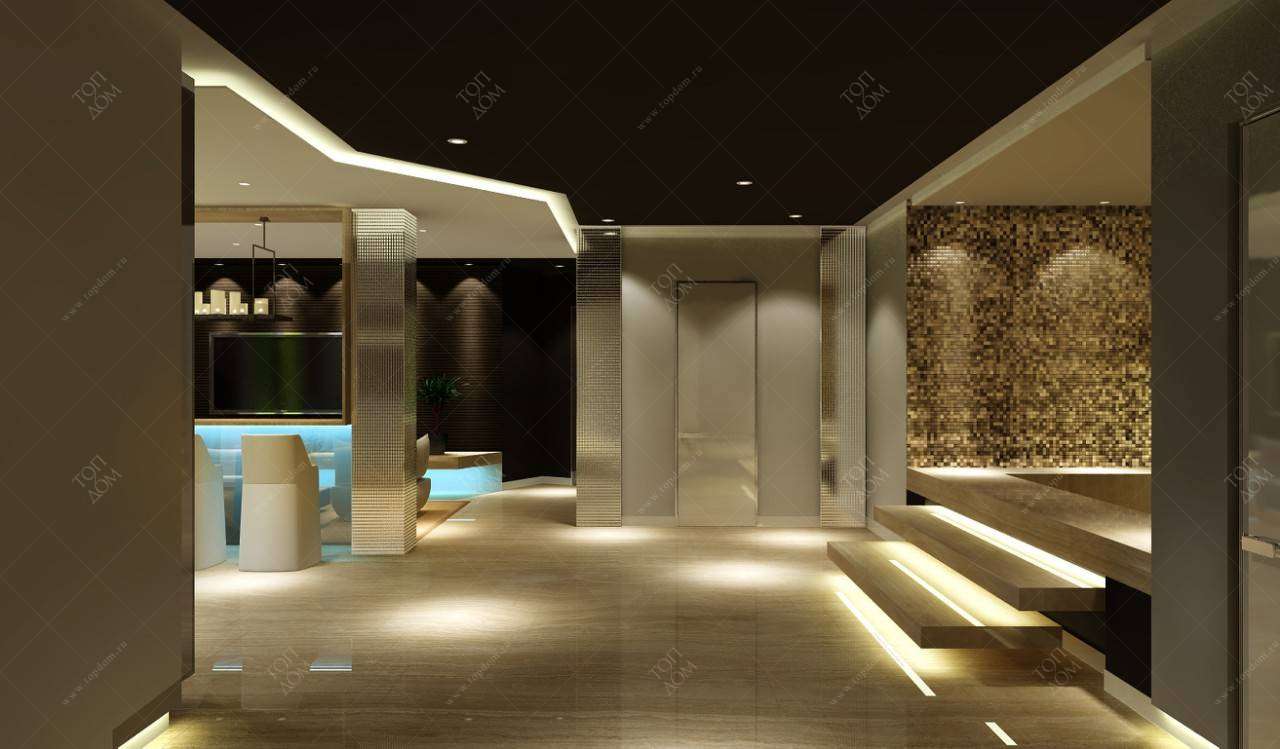 Со стороны холла место отдыха отделяется декоративной конструкцией: с полкой для аксессуаров и светодиодной лентой по внутреннему периметру.