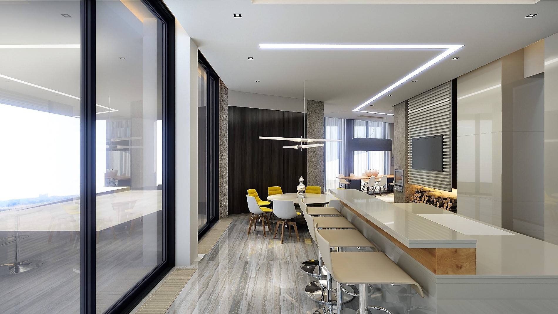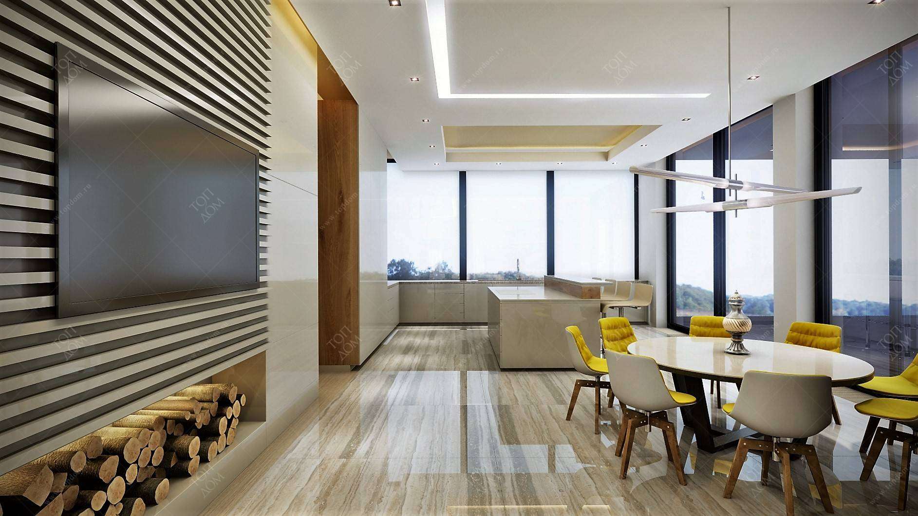 Обеденную группу стильный дизайн интерьера акцентирует ярко-желтой обивкой стульев и авторским светильником, напоминающим лопасти вертолета. Стена с телевизором выделена декоративными планками, ниша с дровами подсвечена желтым, поддерживая оформление стульев.
