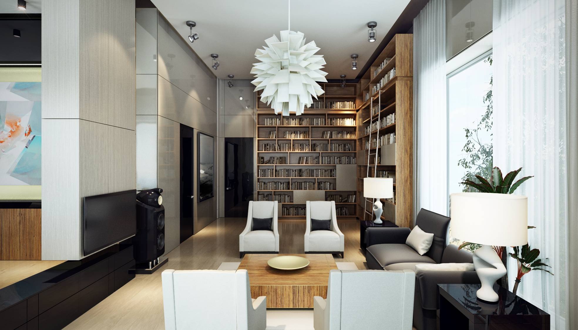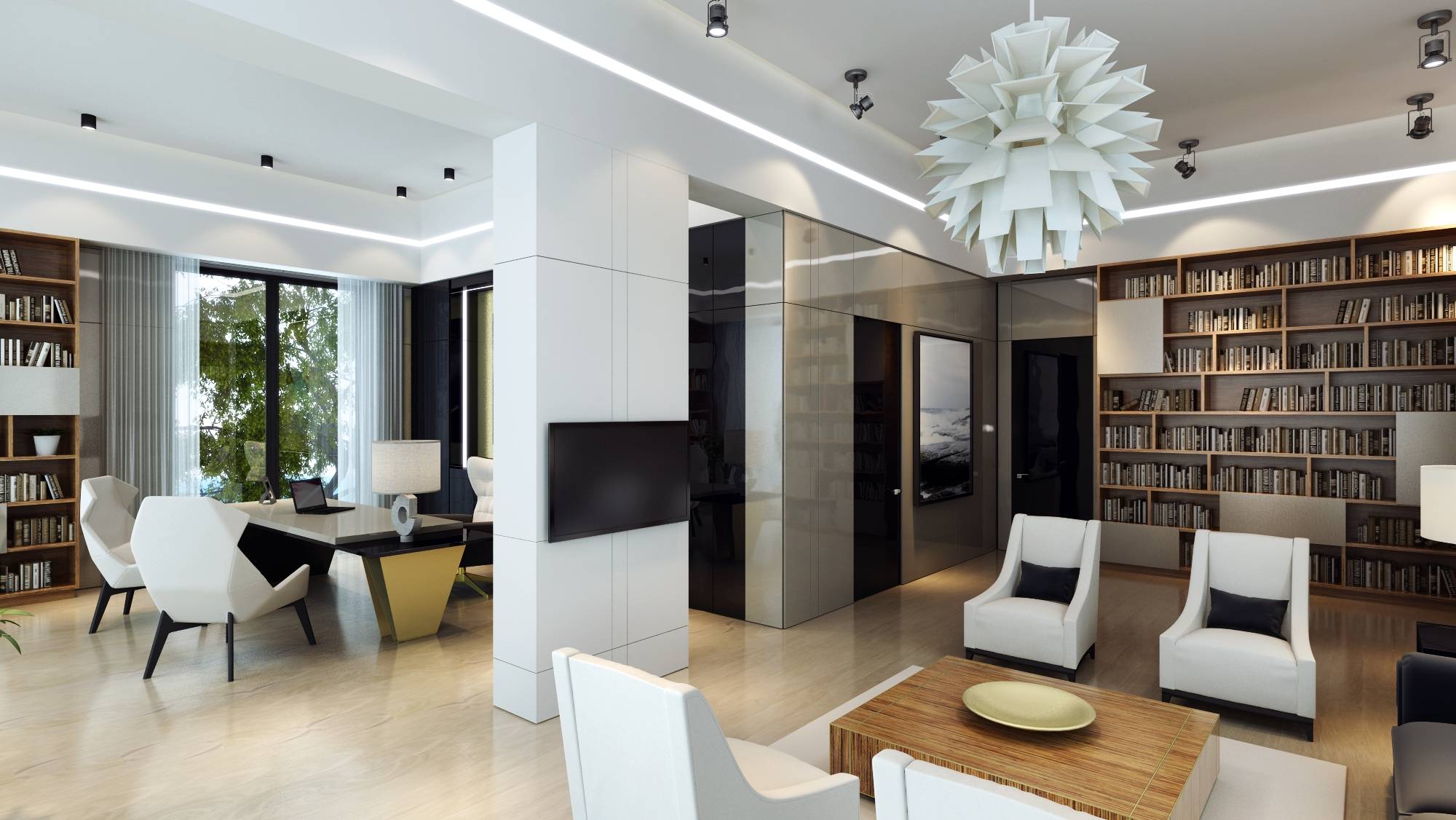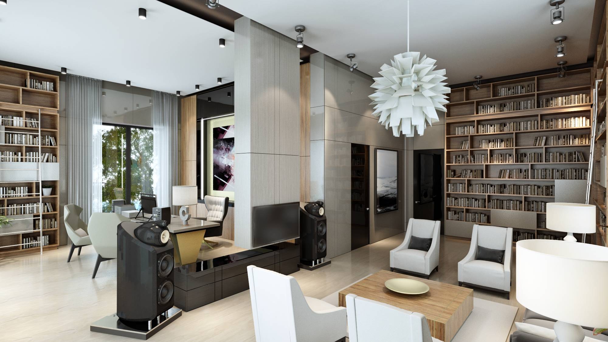 Интерьер современной библиотеки насыщен светлыми красками и глянцевыми покрытиями. Акцент в оформлении сделан на авторские работы: дизайнерский светильник в зоне чтения и футуристические граненые кресла в кабинете.