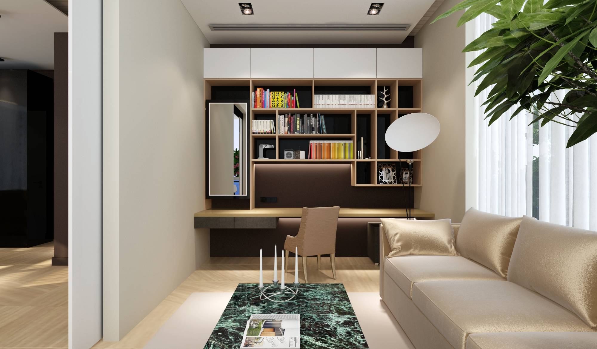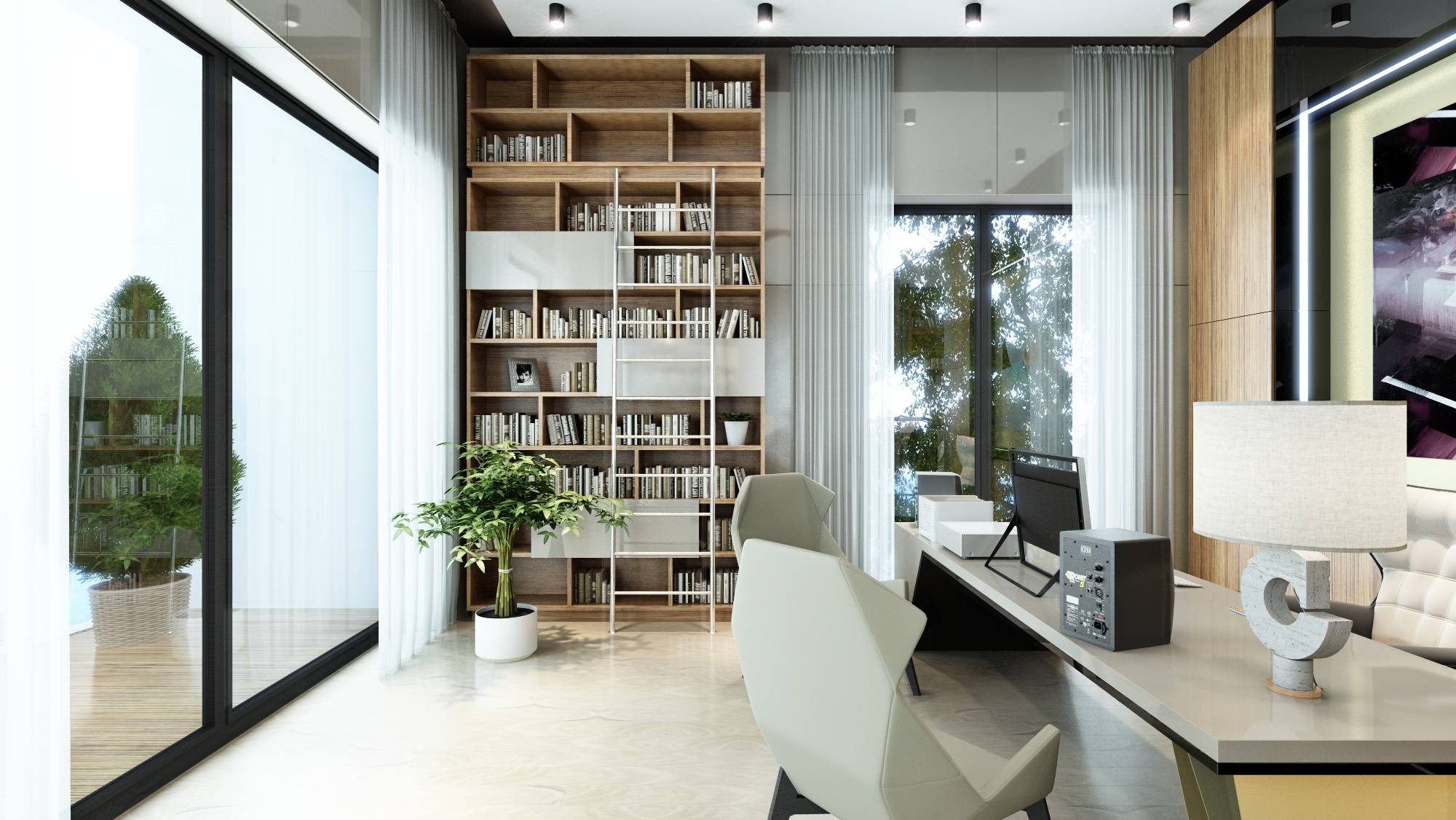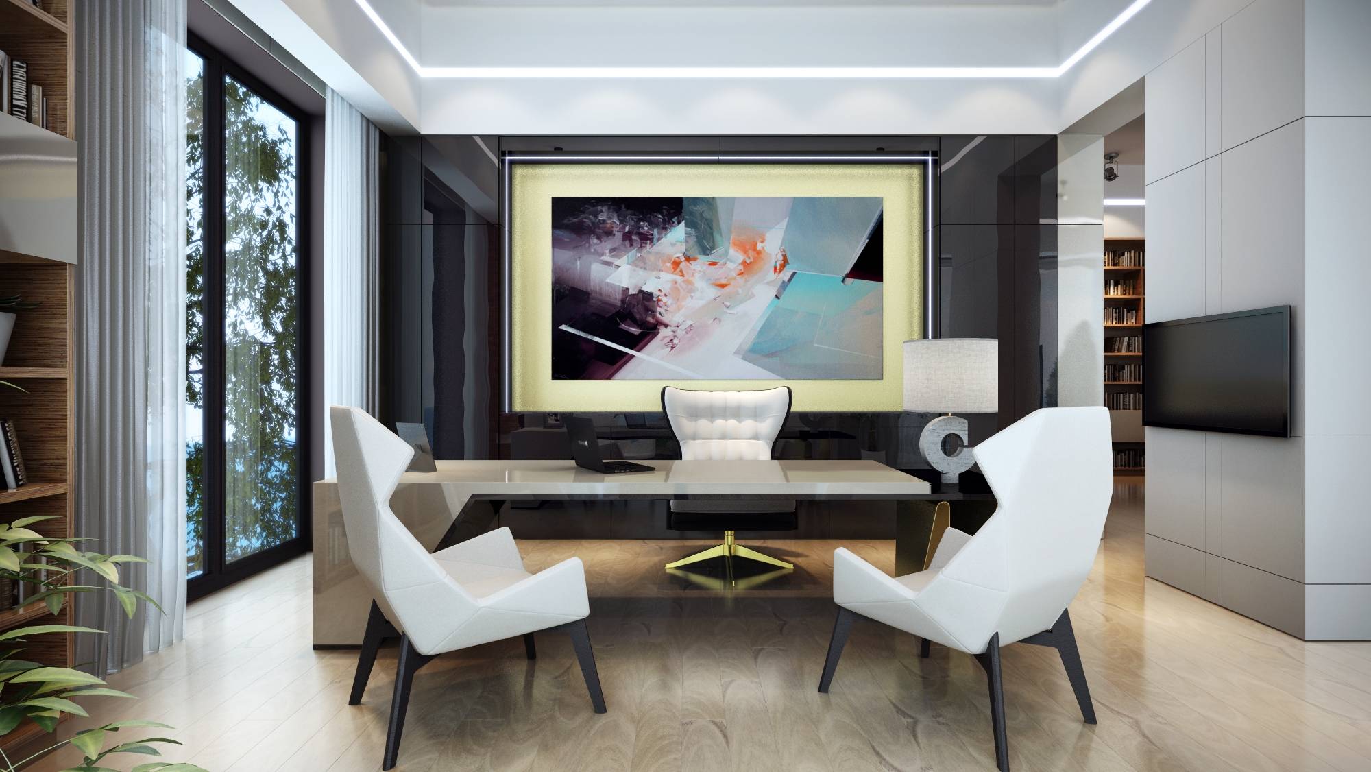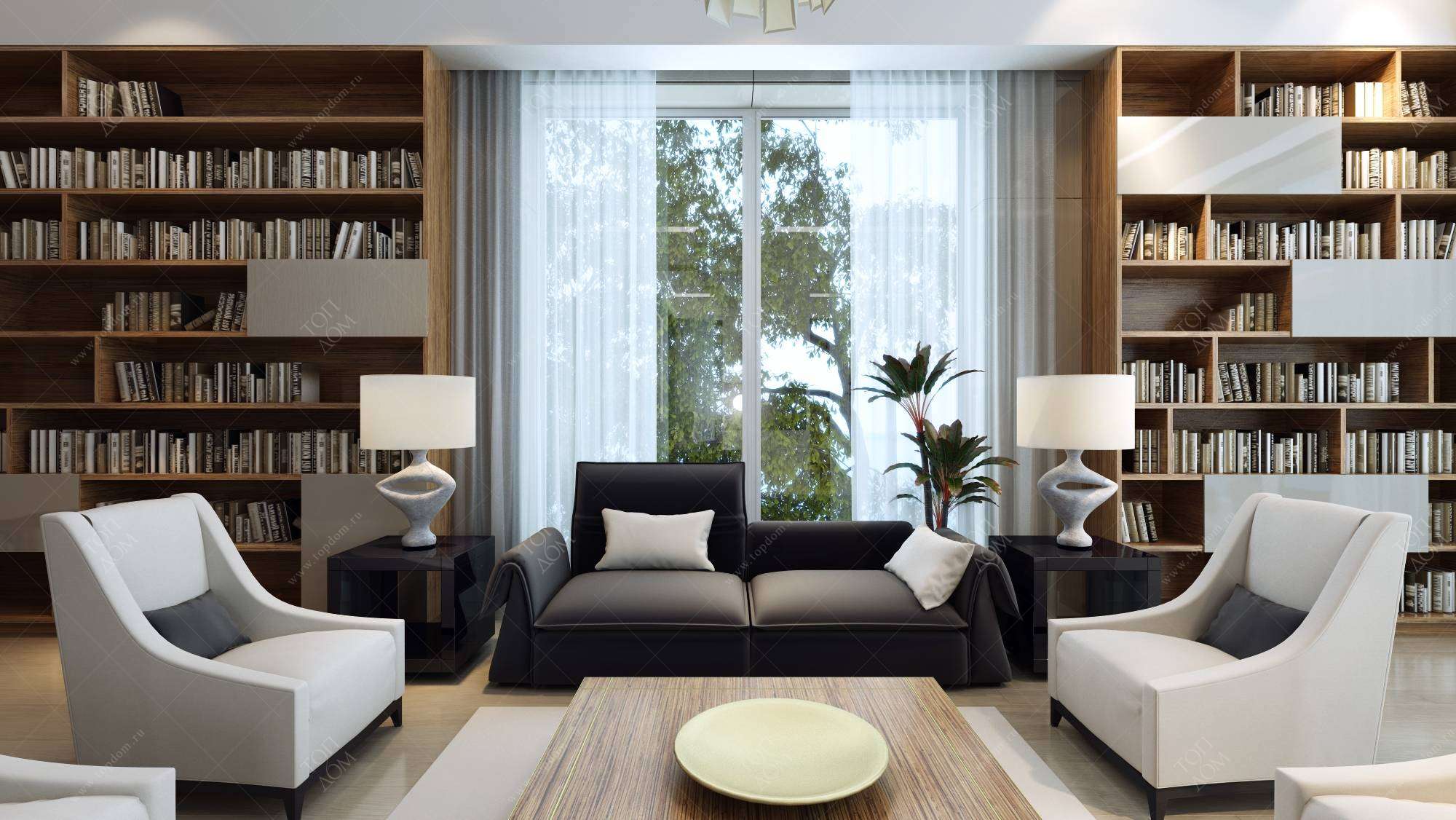 Интерьер современной библиотеки насыщен светлыми красками и глянцевыми покрытиями. Акцент в оформлении сделан на авторские работы: дизайнерский светильник в зоне чтения и футуристические граненые кресла в кабинете.