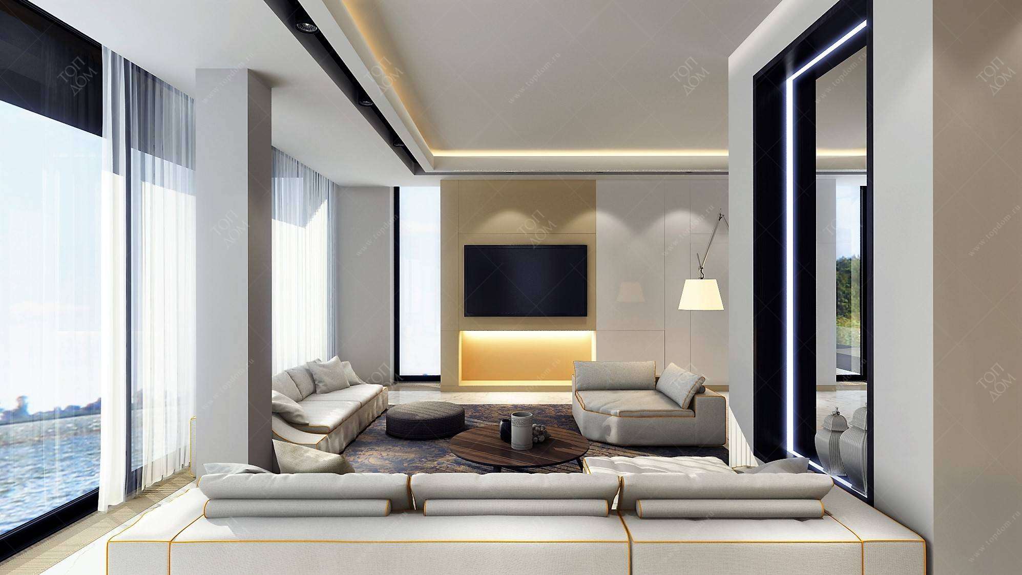 Мягкая группа развернута вдоль окон. Диваны низкие, с широкими сидениями, на таких удобно расположиться для просмотра фильмов. Панель телевизора монтируется на искусственном простенке, отделанном белыми и темно-бежевыми панелями. Подсветка нижней ниши дает дополнительное ощущение глубины, современные стильные интерьеры предполагают функциональные световые решения.