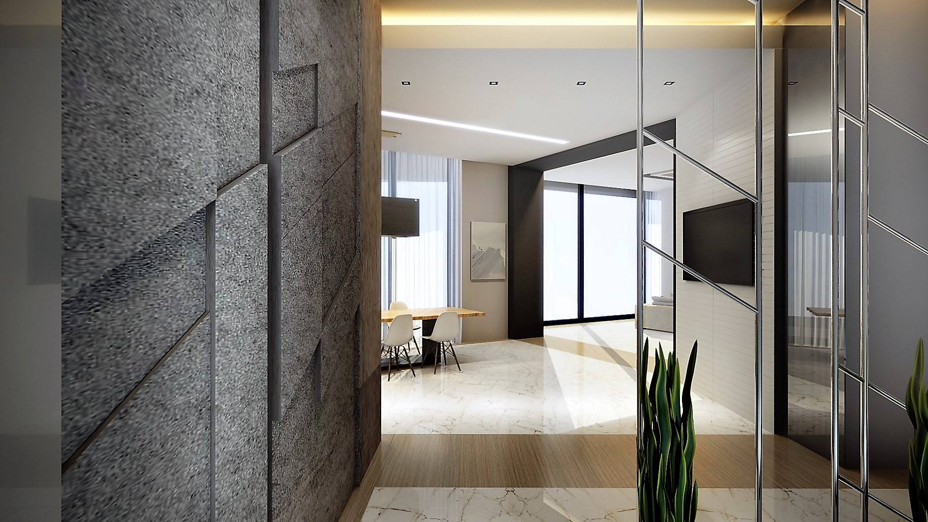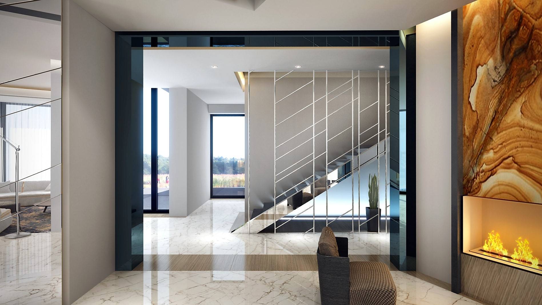 Другая перегородка отделана натуральным серым камнем. С геометрическим рельефом облицовки перекликается рисунок хромированного ограждения внутридомовой лестницы. Общественную часть, за исключением кухни, объединяет напольное покрытие – полированный мрамор цвета слоновой кости со вставками древесной текстуры.