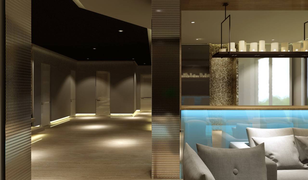 Комплекс для релакса располагается на нижнем уровне дома. В стильном современном интерьере сауны преобладают золотистая мозаика в отделке стен и колонн, светлые медовые оттенки плитки под дерево. Желтая подсветка ступеней, ниш, плинтусов эффектно приподнимает стены и темный коричневый потолок.