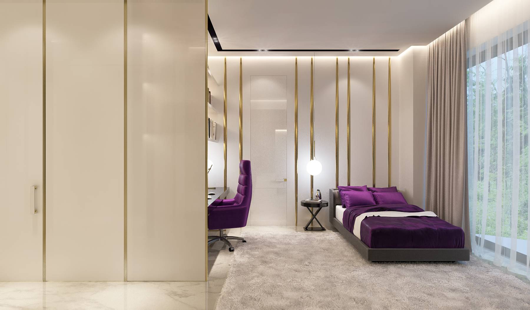 - сиреневое кресло и убранство кровати,