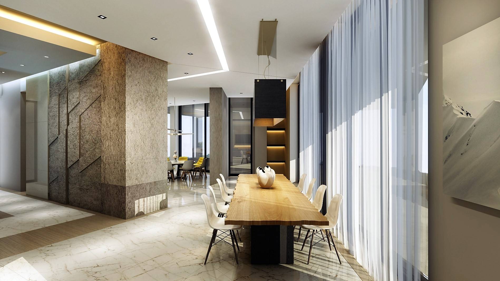 В заявленных фактурах по-современному сочетаются мрамор, дерево, металл.
