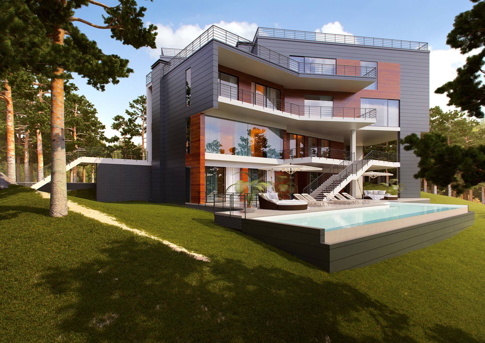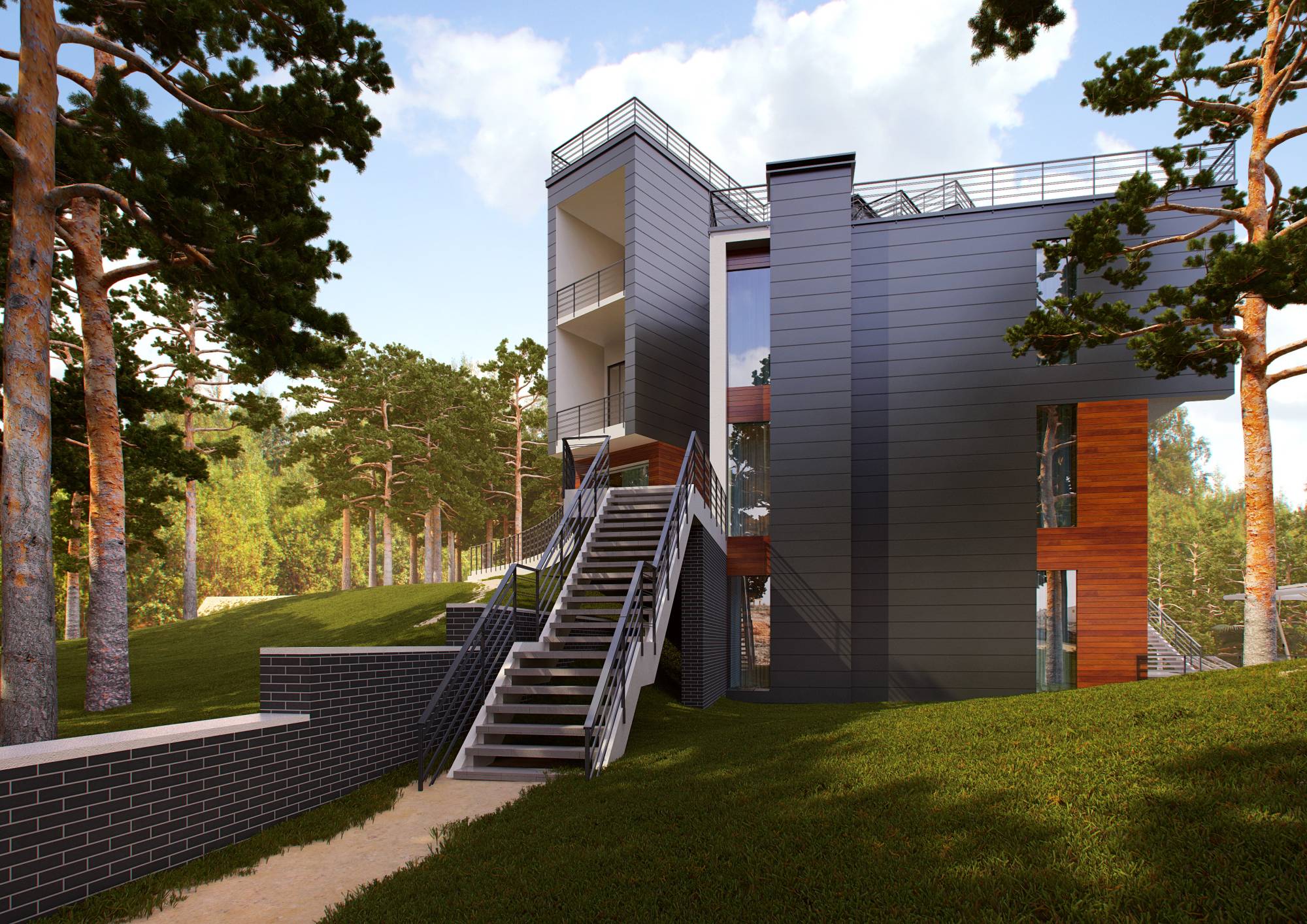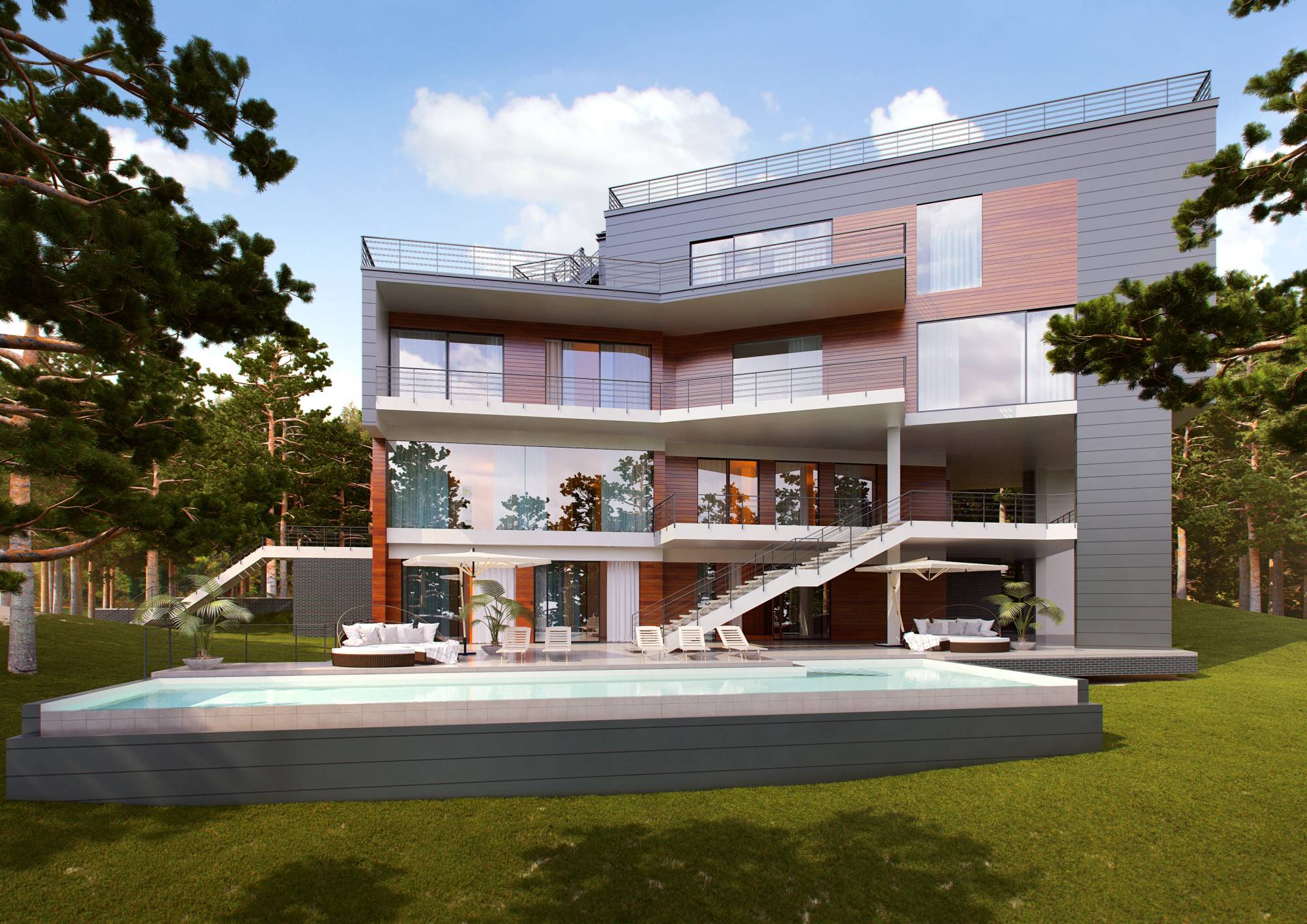 Характерные черты актуальных интерьеров дома проявились и в экстерьере. В цветовой гамме сочетаются серые, коричневые, белые тона. Фасад частично обшит деревом с красивыми тонировочными переходами. Открытые террасы ритмично чередуются с лестничными пролетами.