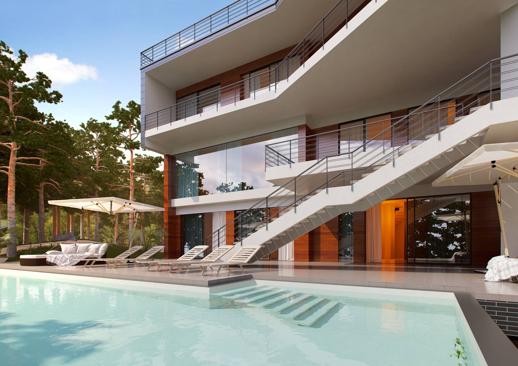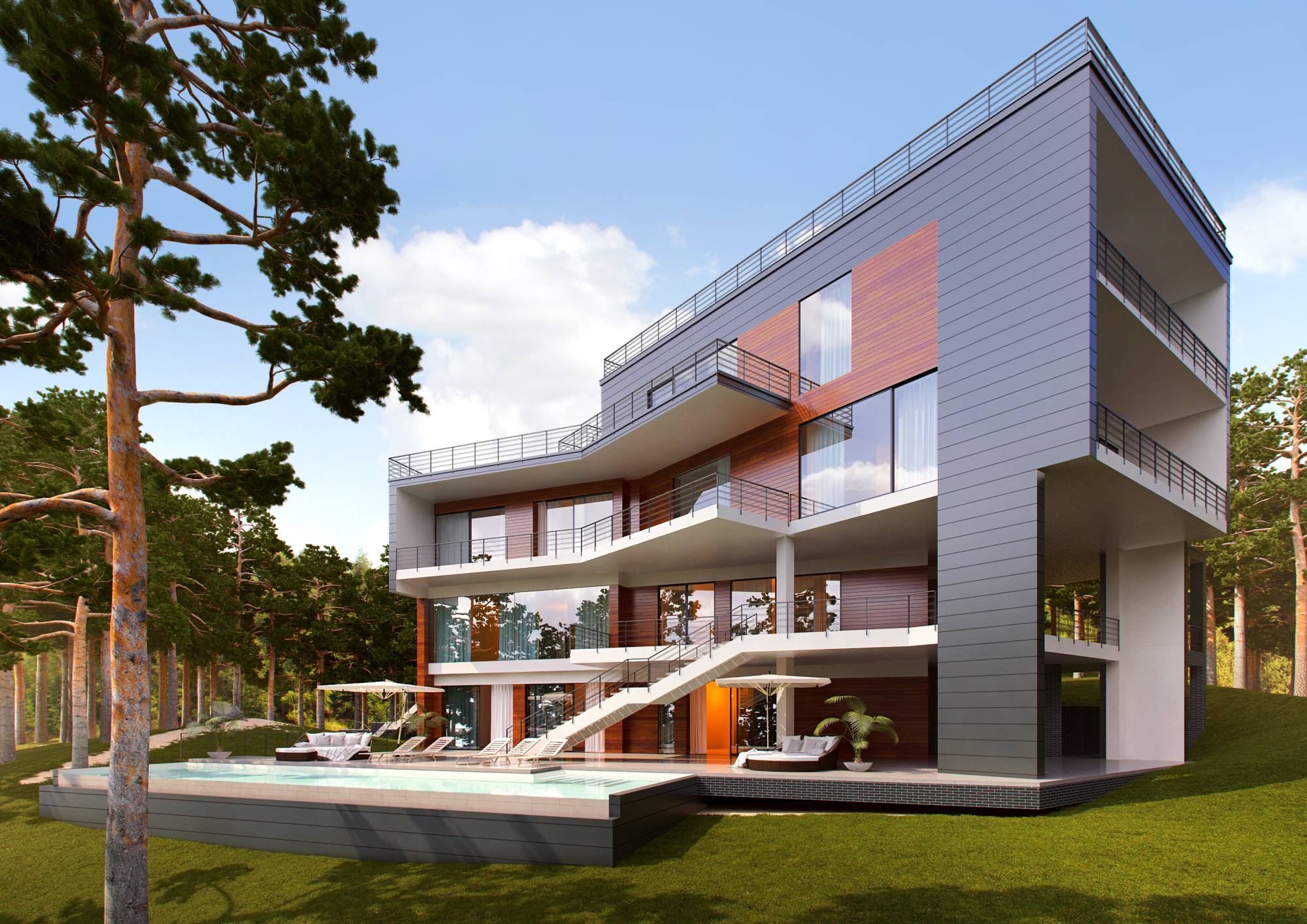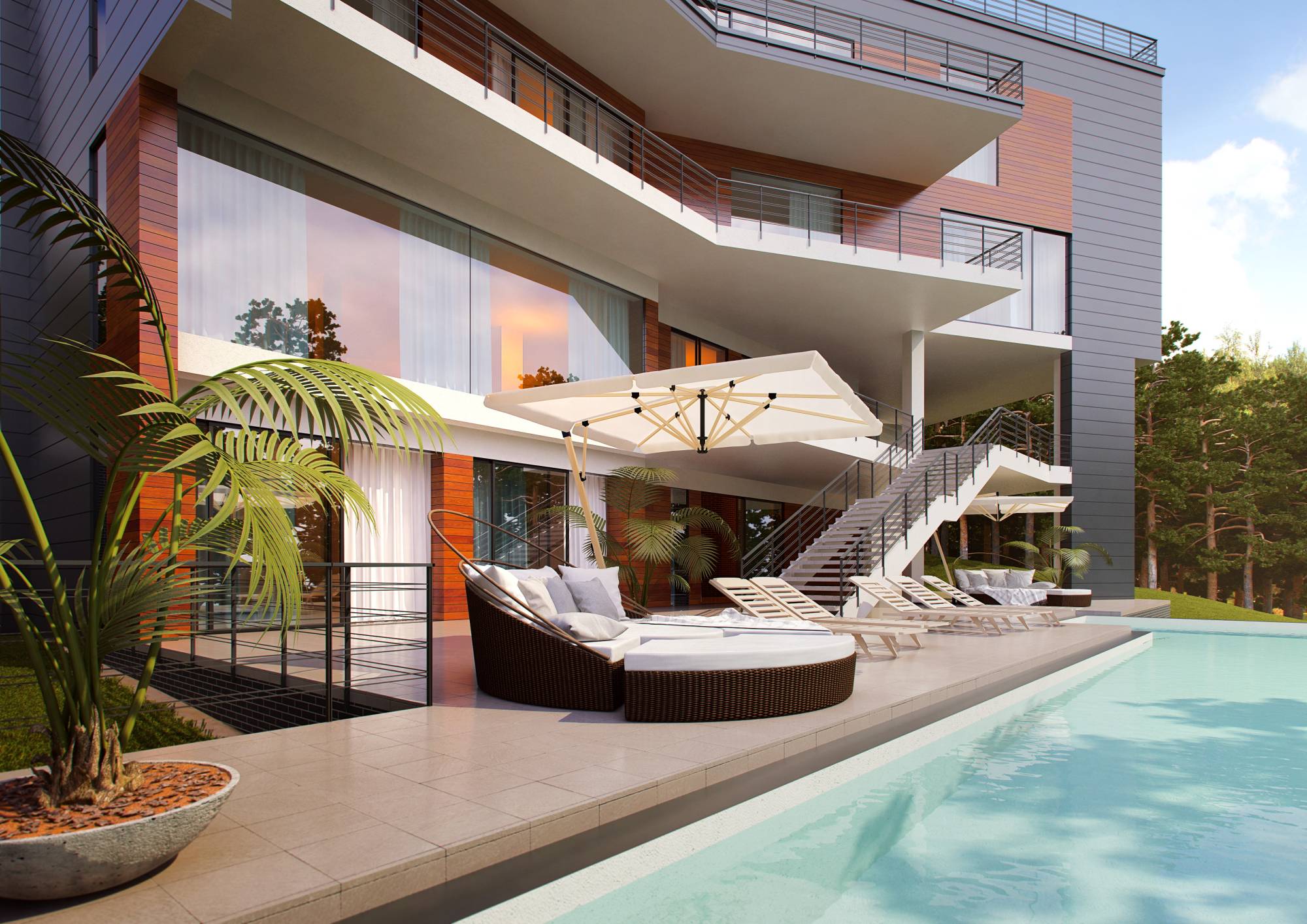 Характерные черты актуальных интерьеров дома проявились и в экстерьере. В цветовой гамме сочетаются серые, коричневые, белые тона. Фасад частично обшит деревом с красивыми тонировочными переходами. Открытые террасы ритмично чередуются с лестничными пролетами.