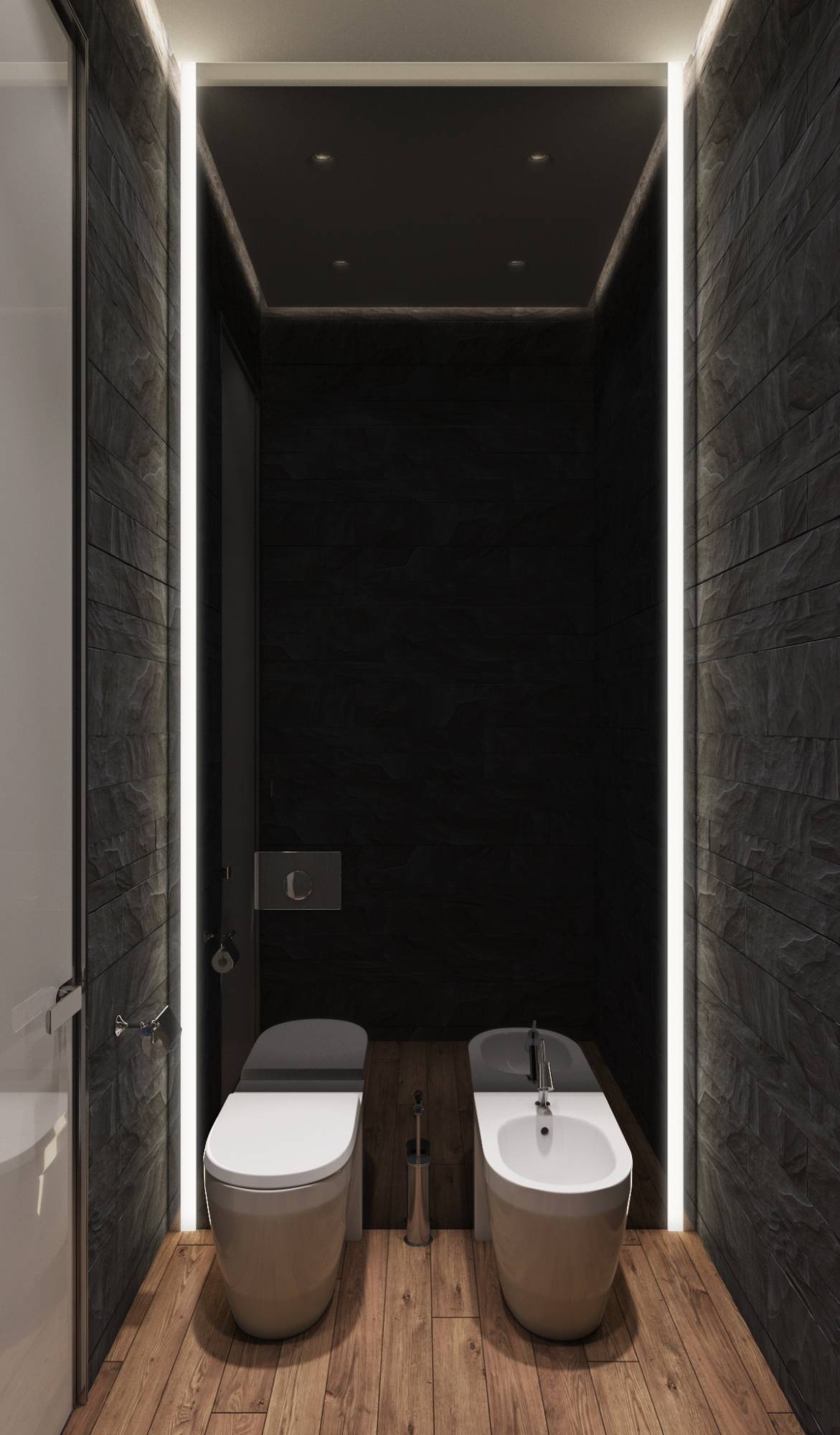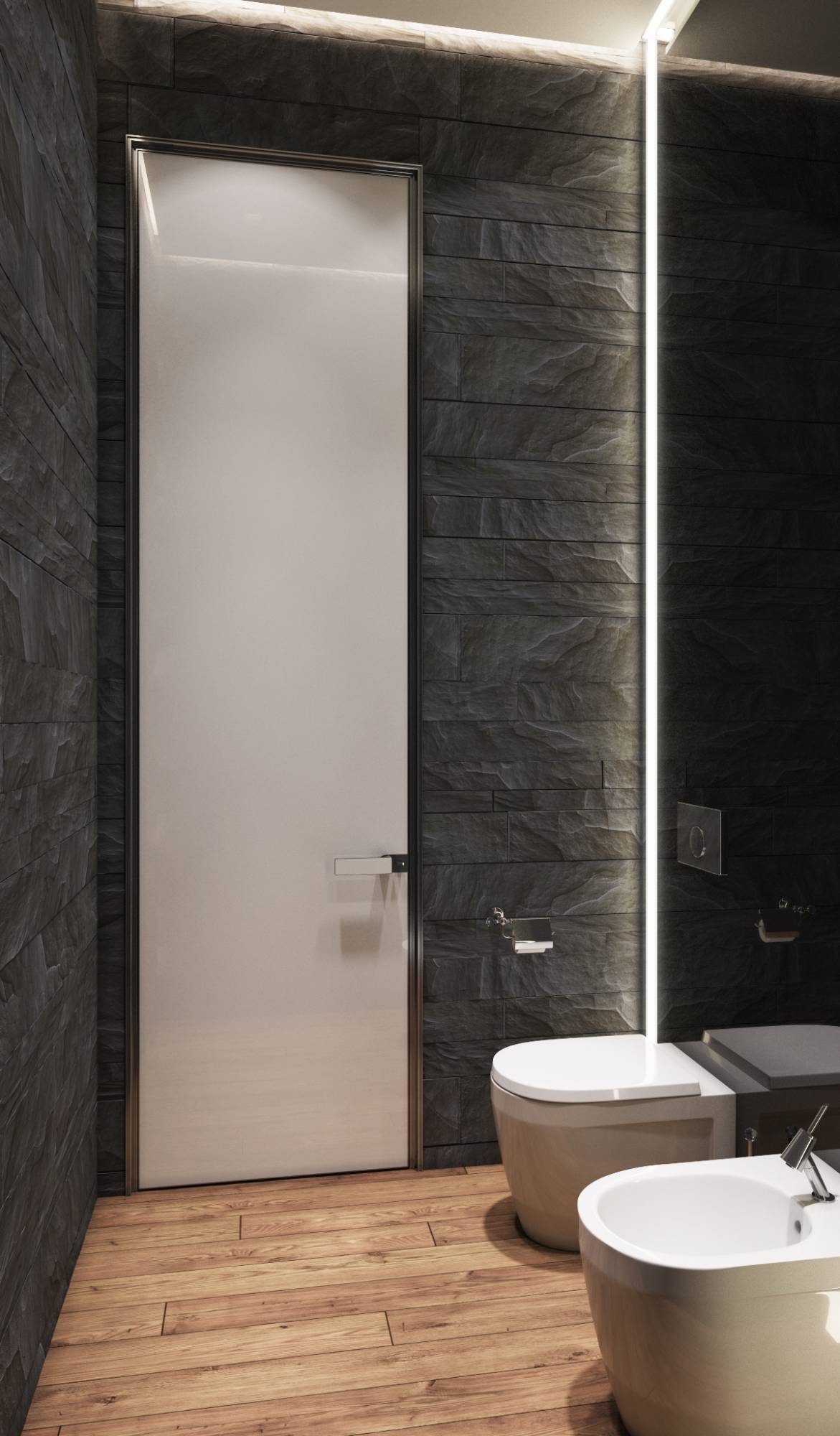 Натуральный темно-серый камень, использованный в ванной комнате в облицовке стены с полотенцесушителями, присутствует и в оформлении санузла. Черное тонированное стекло увеличивает объем компактного помещения, а чтобы интерьер не казался слишком тяжелым, скрытая потолочная и вертикальная подсветка раздвигает плоскости.