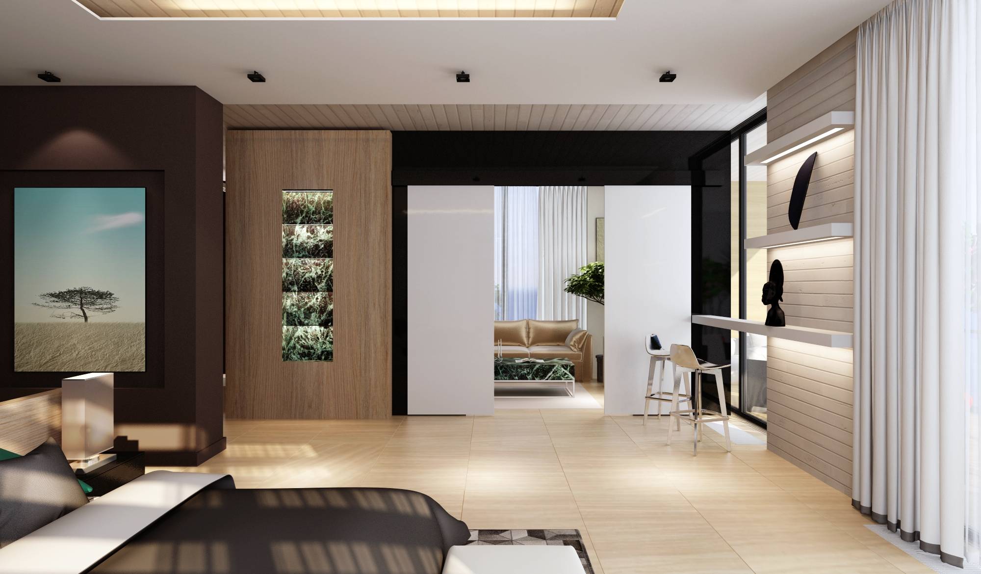 Пространство поделено на зону для сна, барную стойку, гардероб. Раздвижные белые двери ведут в компактный кабинет.