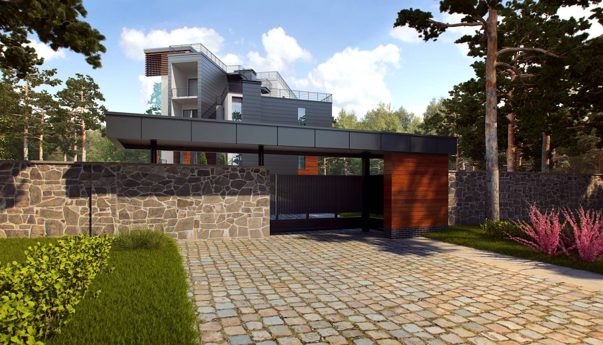 Серая нейтральная отделка, натуральный камень в оформлении забора и парковки органично включают дом в ярко-зеленый природный ландшафт.