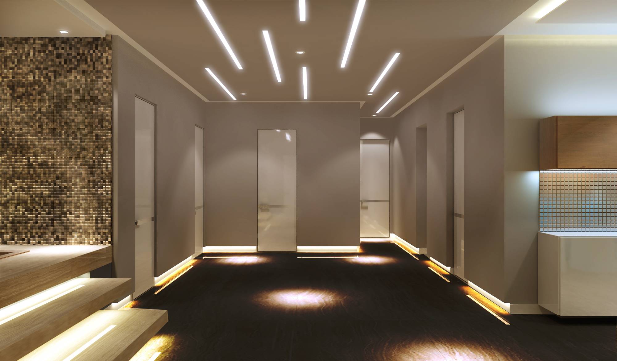 Направленное точечное потолочное освещение на подвесных плитах превосходно вписывается в ультрамодную концепцию проекта.