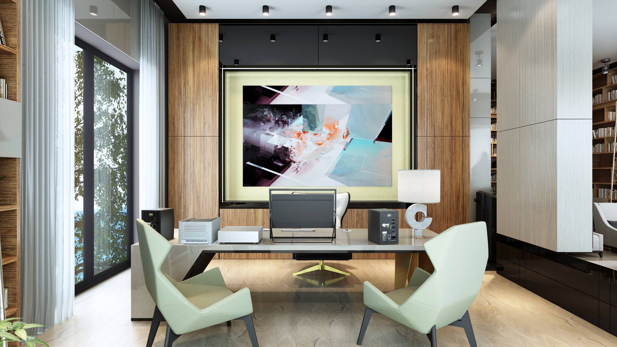 Пространство поделено на две части: первую занимают книжные стеллажи и место отдыха с домашним кинотеатром, вторую – рабочая и переговорная зона. В роли границы – неширокая перегородка по центру помещения.