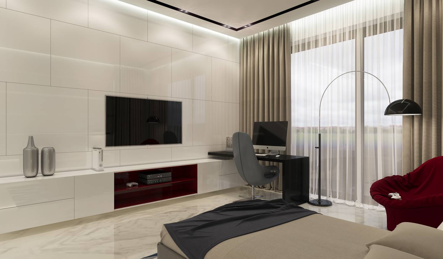 Интерьер современной спальни для молодого человека решен в белых, светло-бежевых и серых оттенках. Сочный акцент – красные кресло и ниша под ТВ.