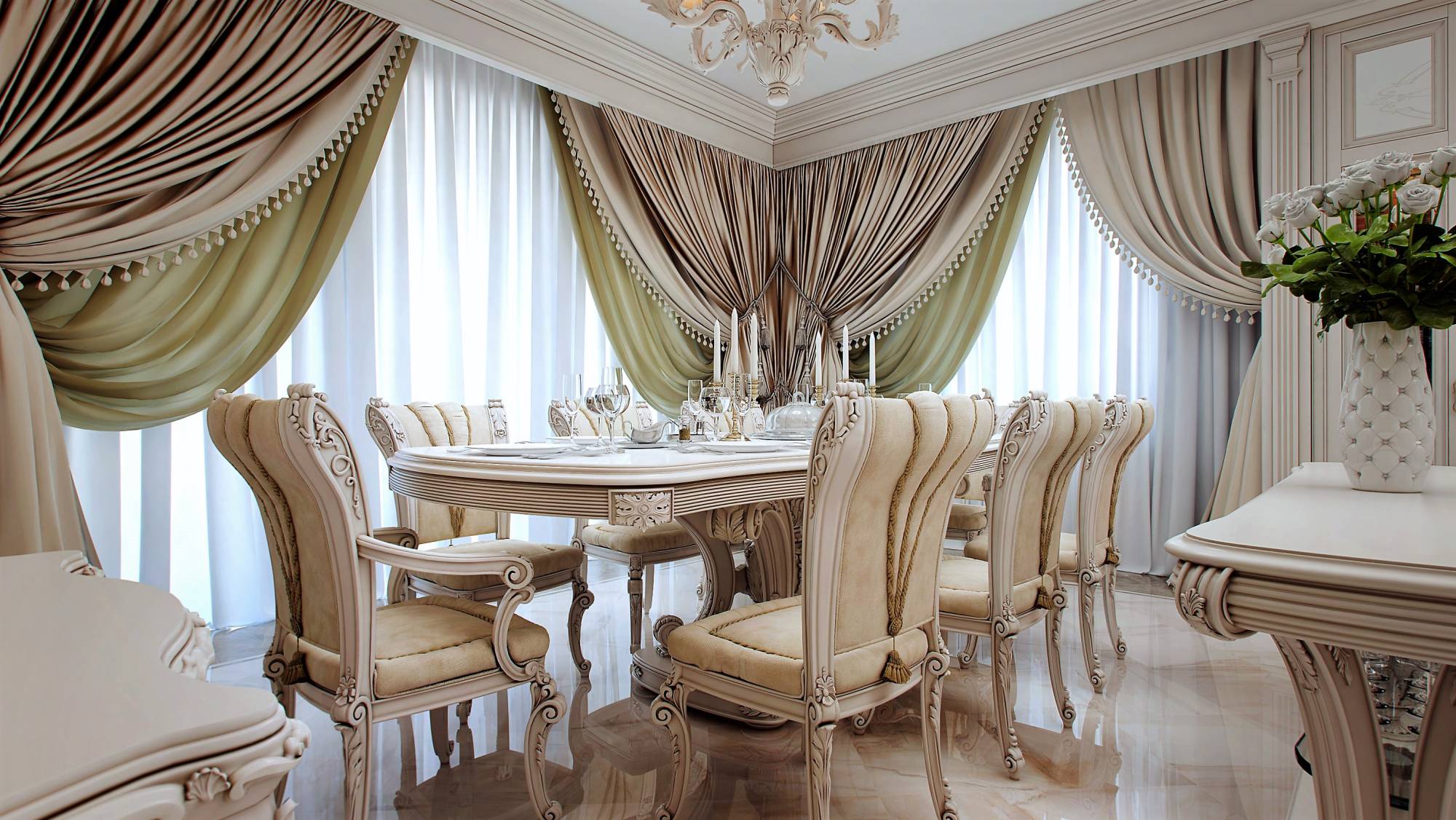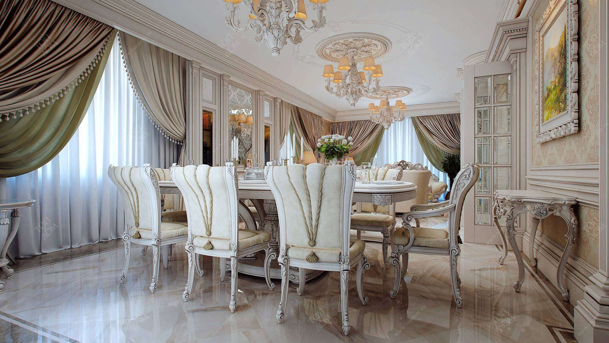 Как и интерьер всего дома, дизайн столовой и гостиной выдержан в торжественной светло-бежевой гамме: