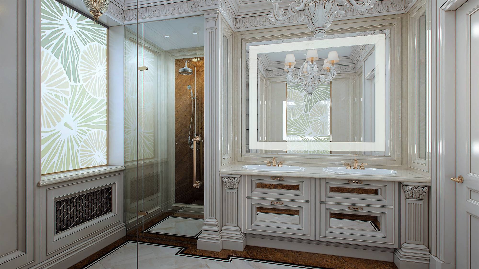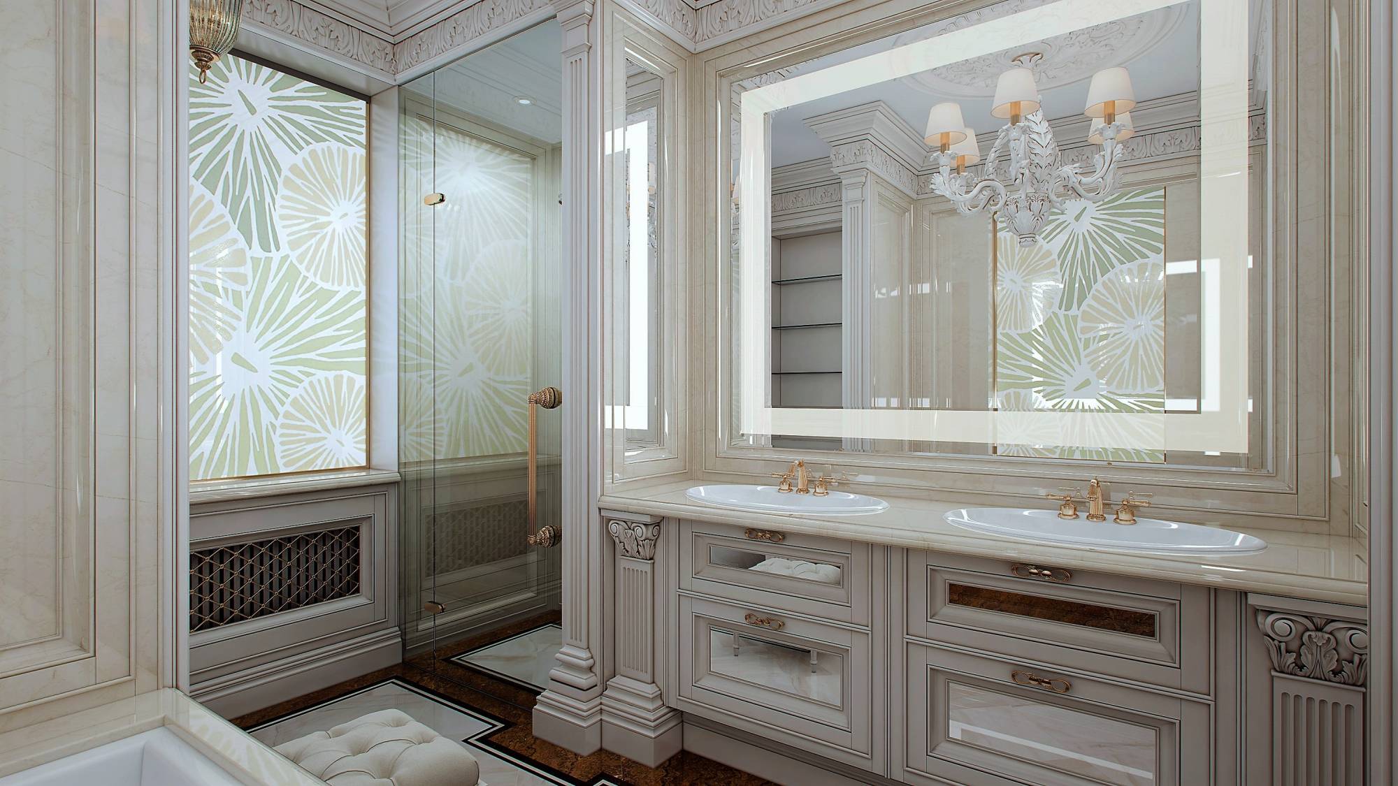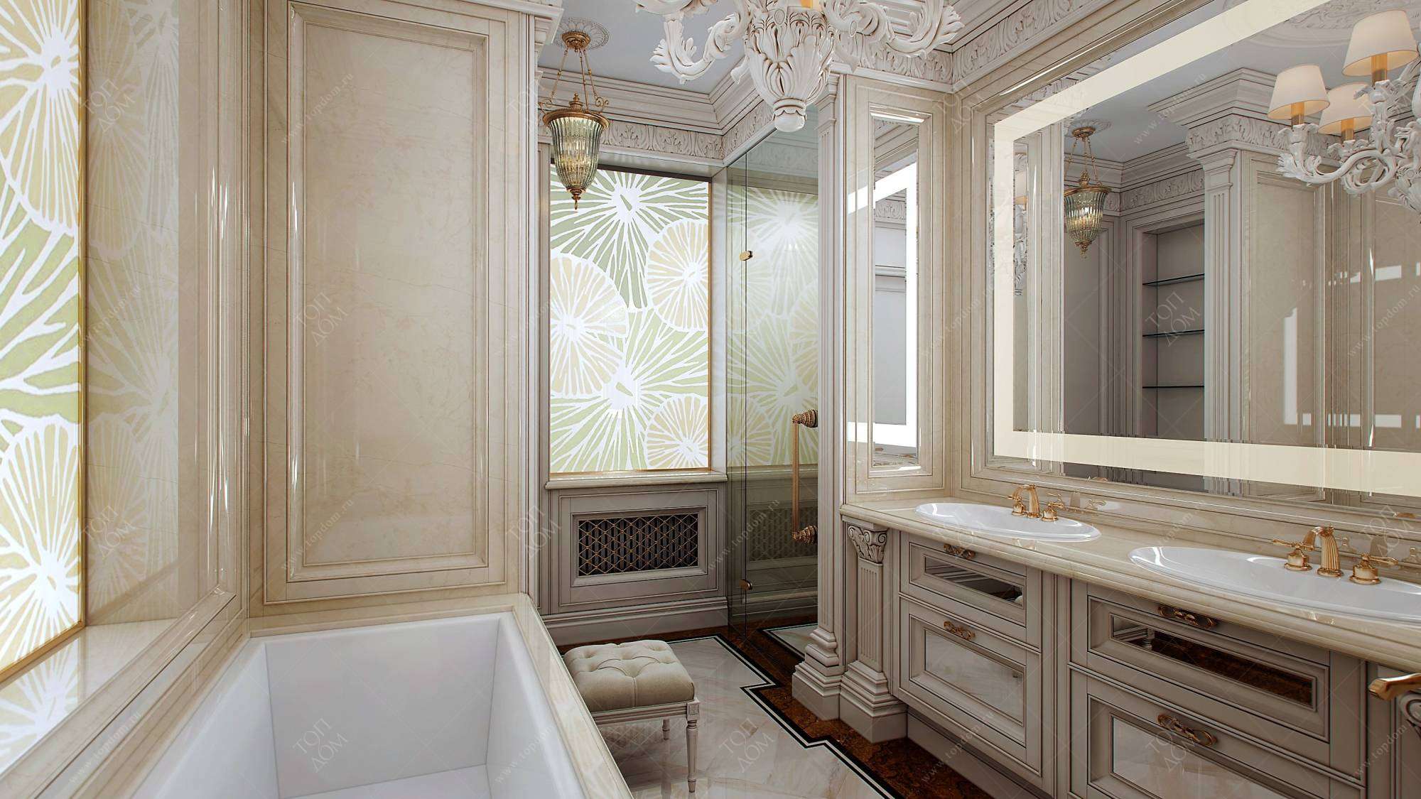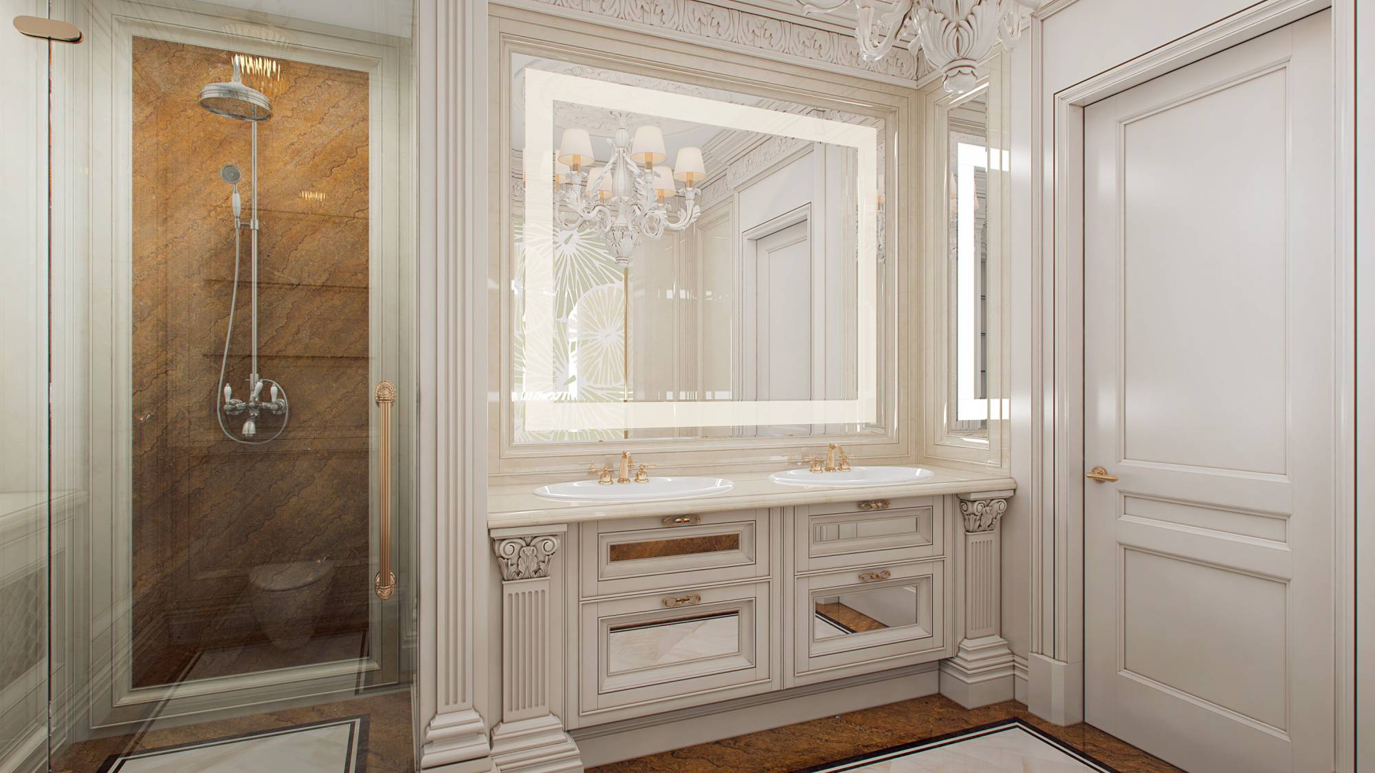 Интерьер ванной выдержан в бежевой гамме с акцентным включением темно-коричневого мрамора в отделке купели, пола и стенок душевой кабины. Латунные смесители в стилистике ретро красиво перекликаются с желто-песочными мраморными прожилками во французском дизайне интерьера.