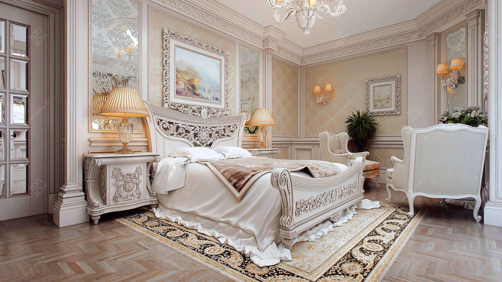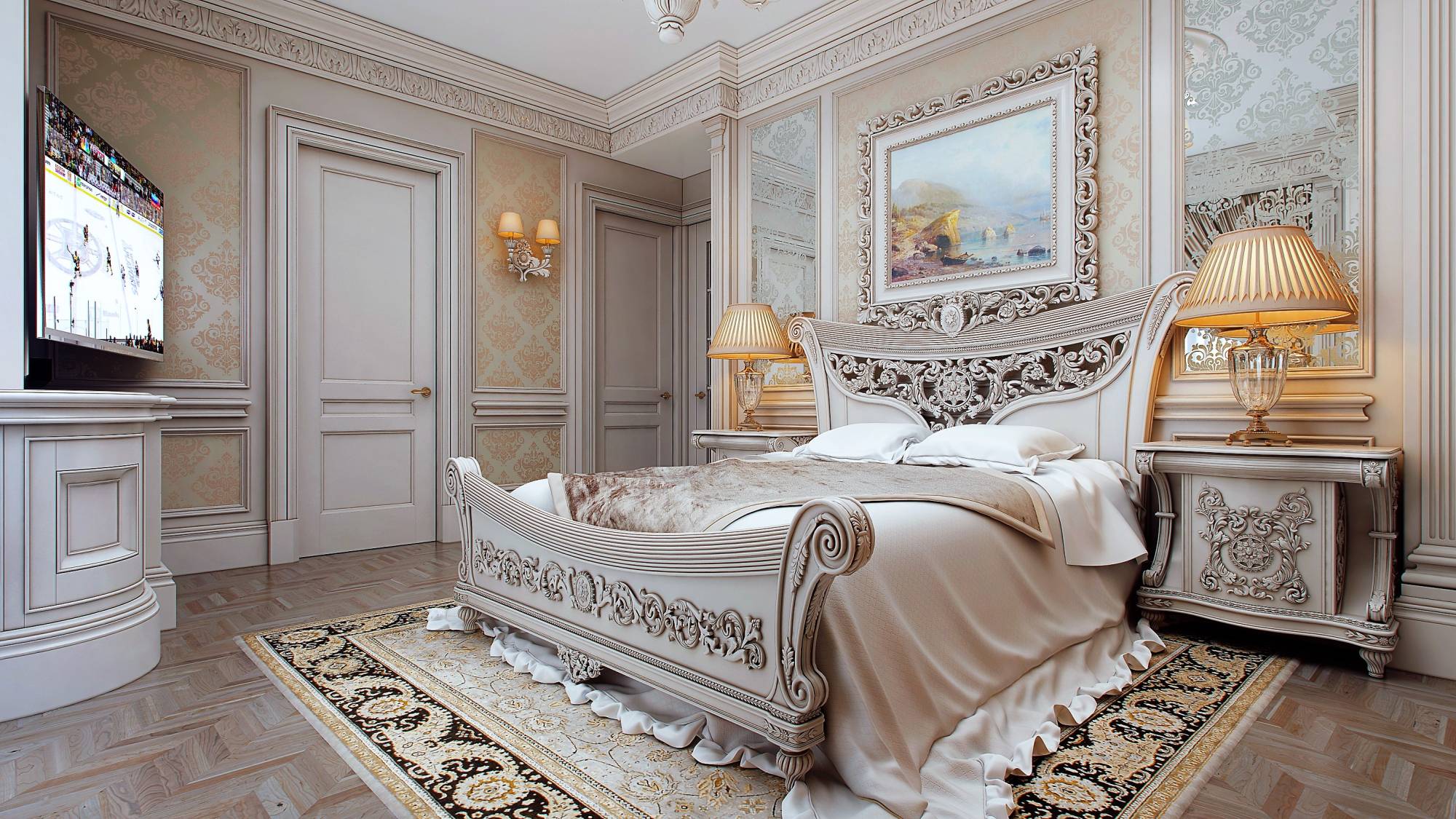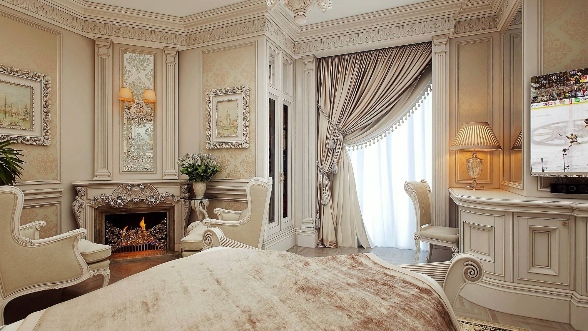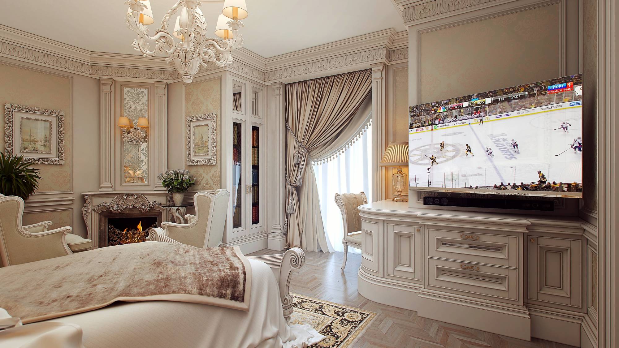 Просторная комната включает зоны сна, камина, рабочий уголок, ТВ. Центральное место, конечно, занимает двуспальная кровать, ее спинки искусно отделаны ажурной резьбой. Тонкий объемный декор украшает прикроватные тумбы, тоже из белого дерева.