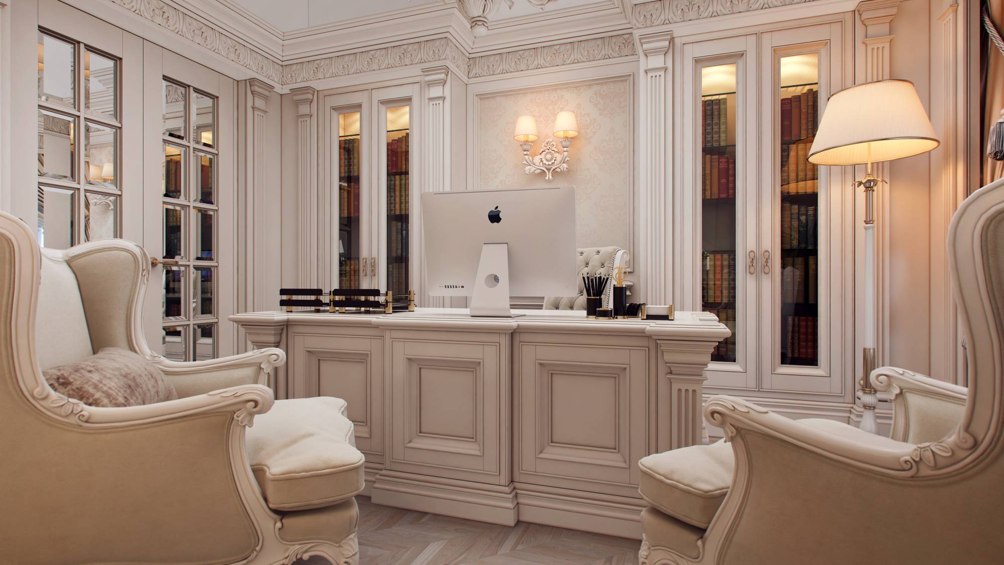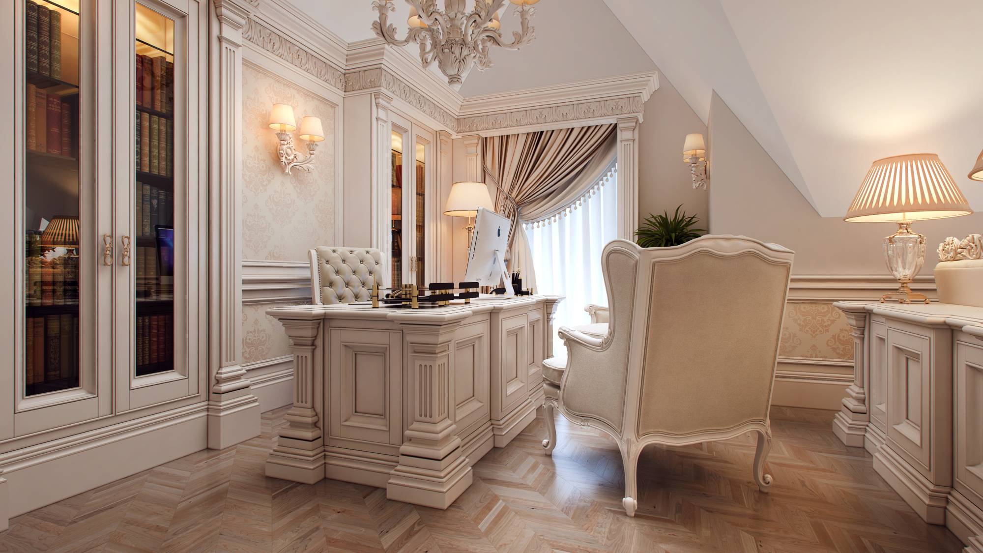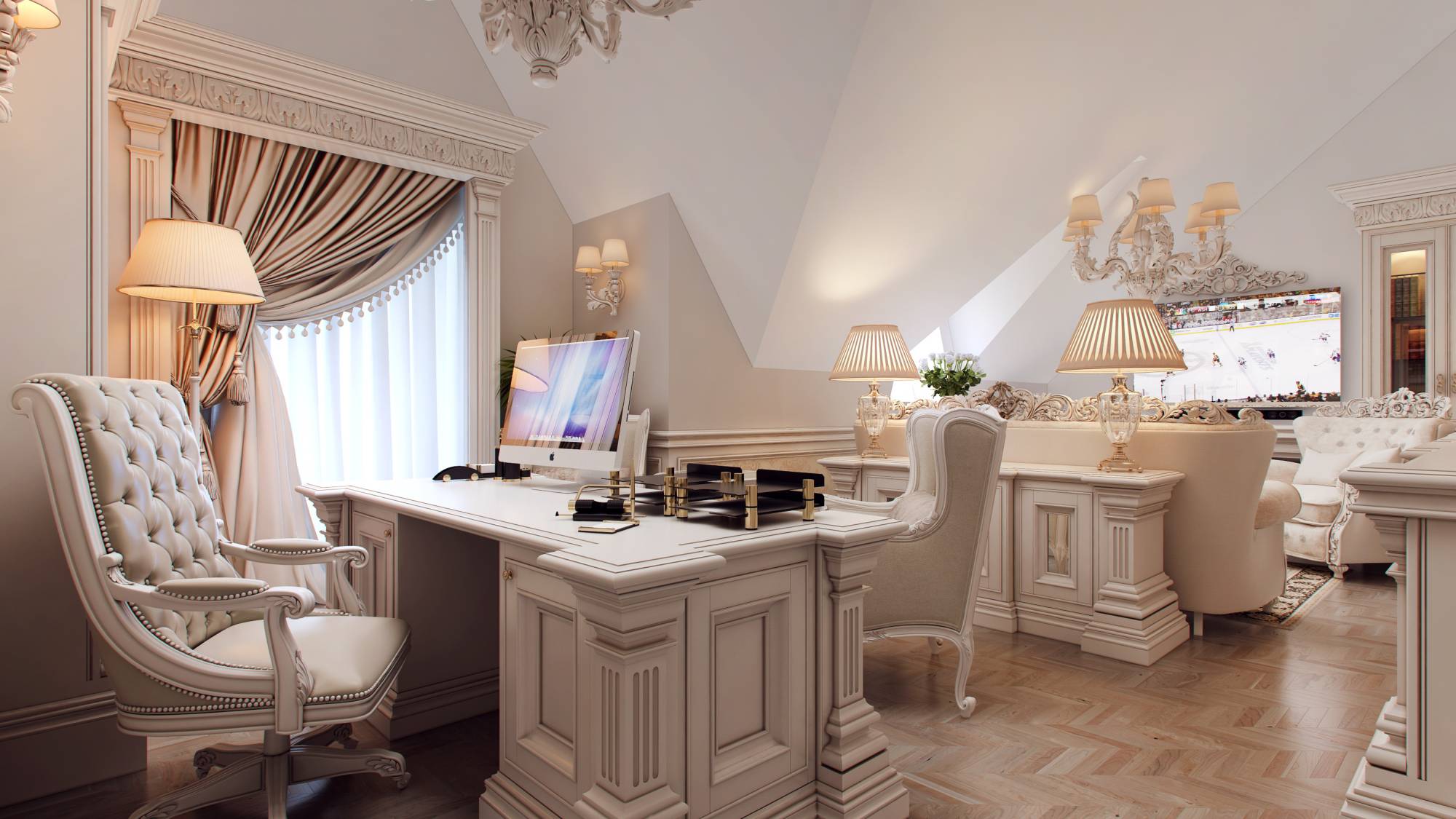 В сложном по геометрии помещении, с кровельными скосами, располагается рабочий кабинет. Его интерьер такой же светлый и торжественный, в дизайне продолжены все основные приемы общественной части. Застекленные книжные шкафы встроены в ниши и подняты на плинтусы: от этого комната кажется выше.
