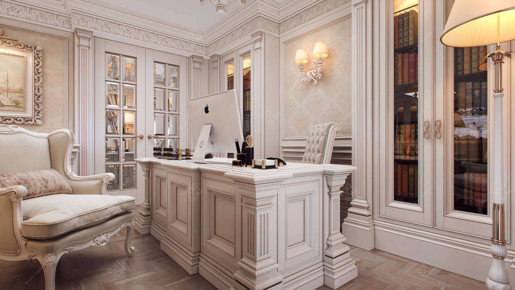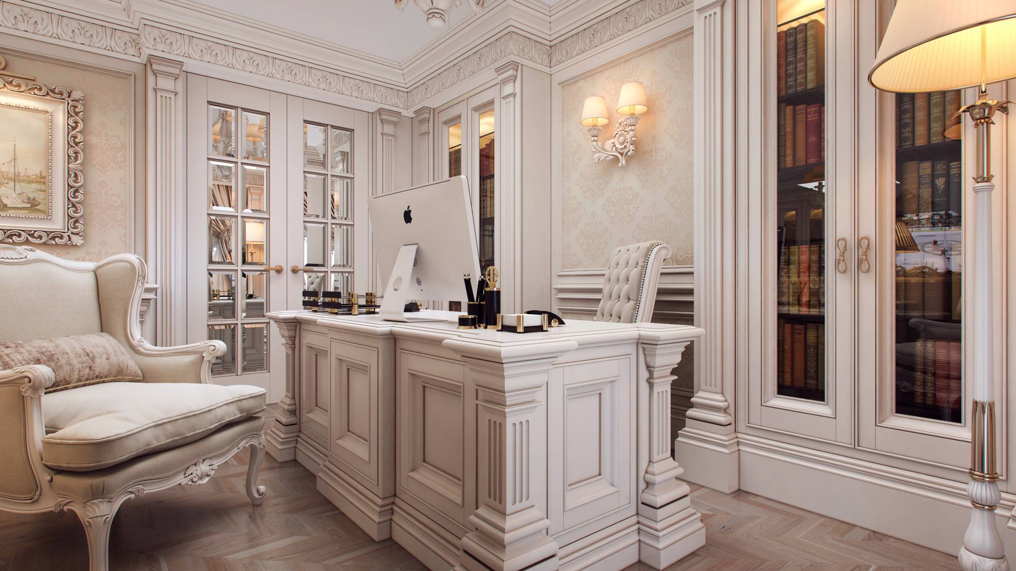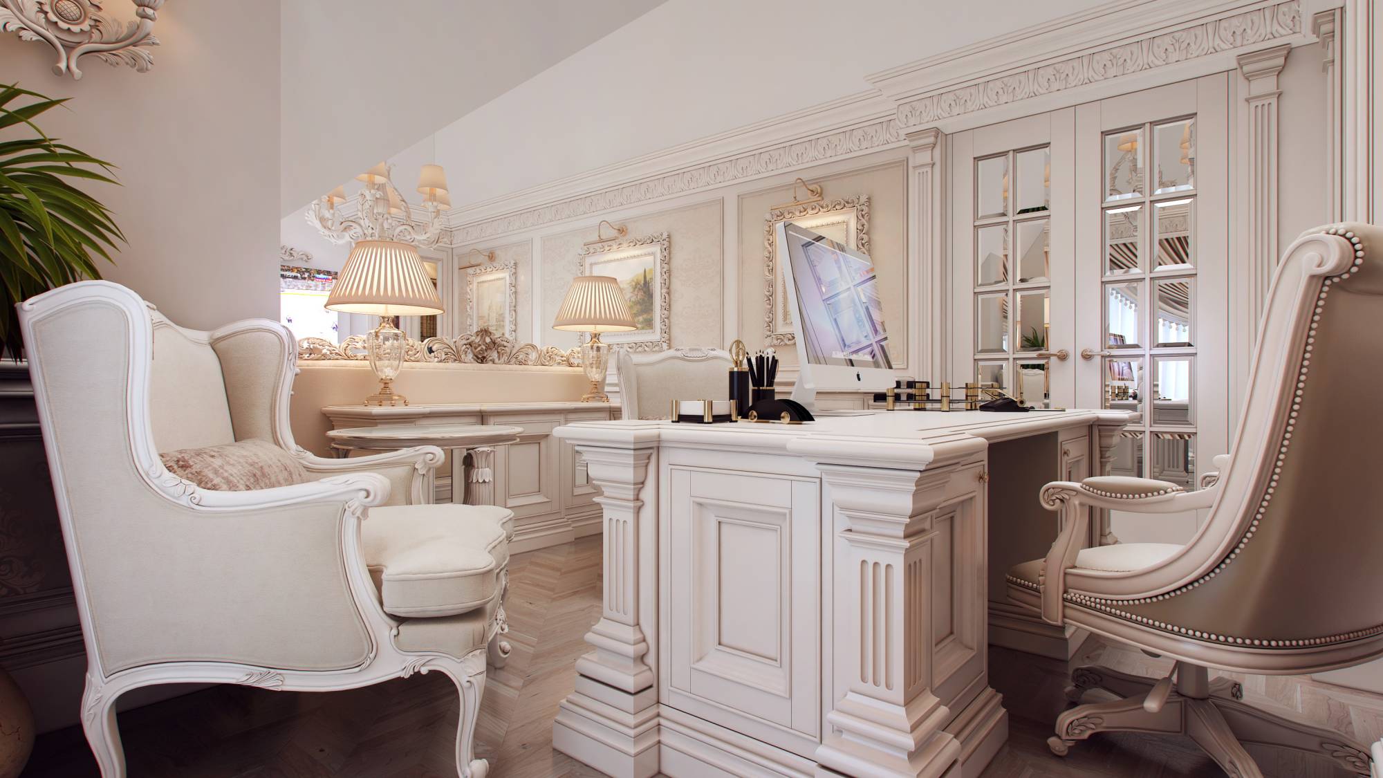 В сложном по геометрии помещении, с кровельными скосами, располагается рабочий кабинет. Его интерьер такой же светлый и торжественный, в дизайне продолжены все основные приемы общественной части. Застекленные книжные шкафы встроены в ниши и подняты на плинтусы: от этого комната кажется выше.
