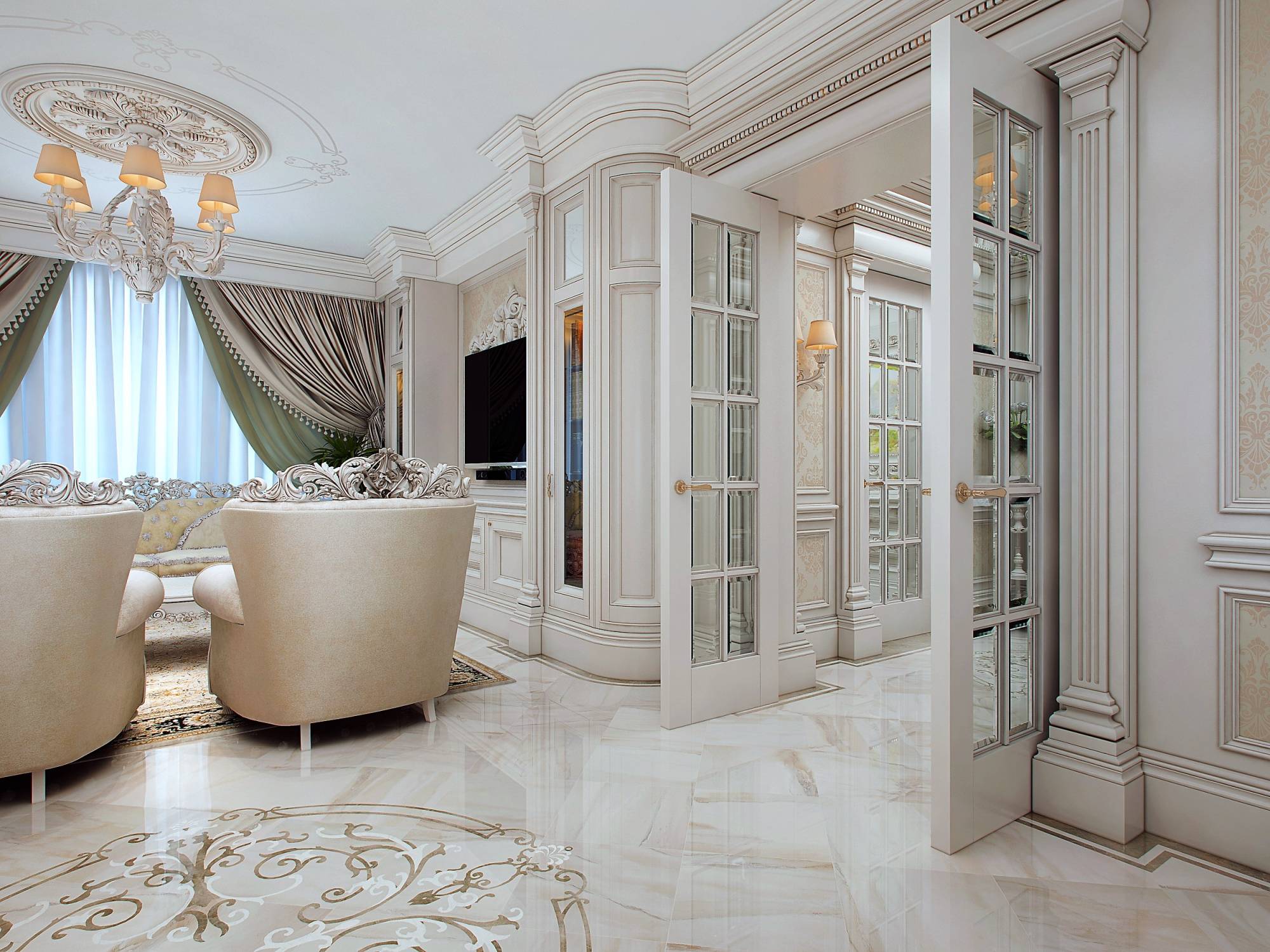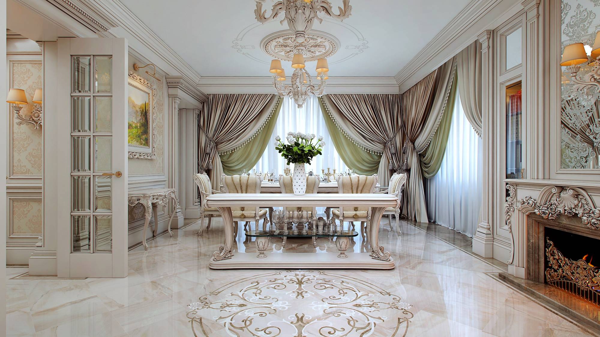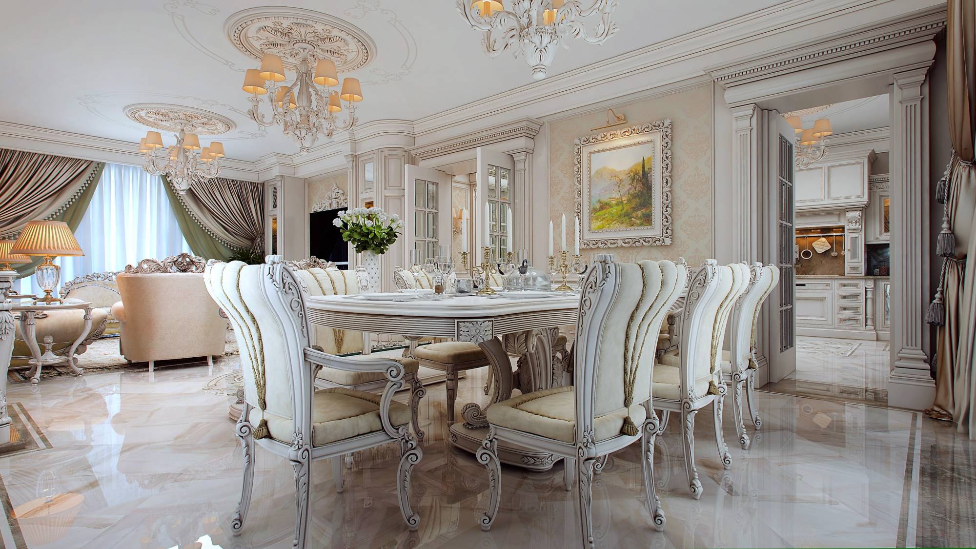Гостиная и столовая объединены в открытое, насыщенное светом пространство, где французский дизайн интерьера предстает во всем великолепии.