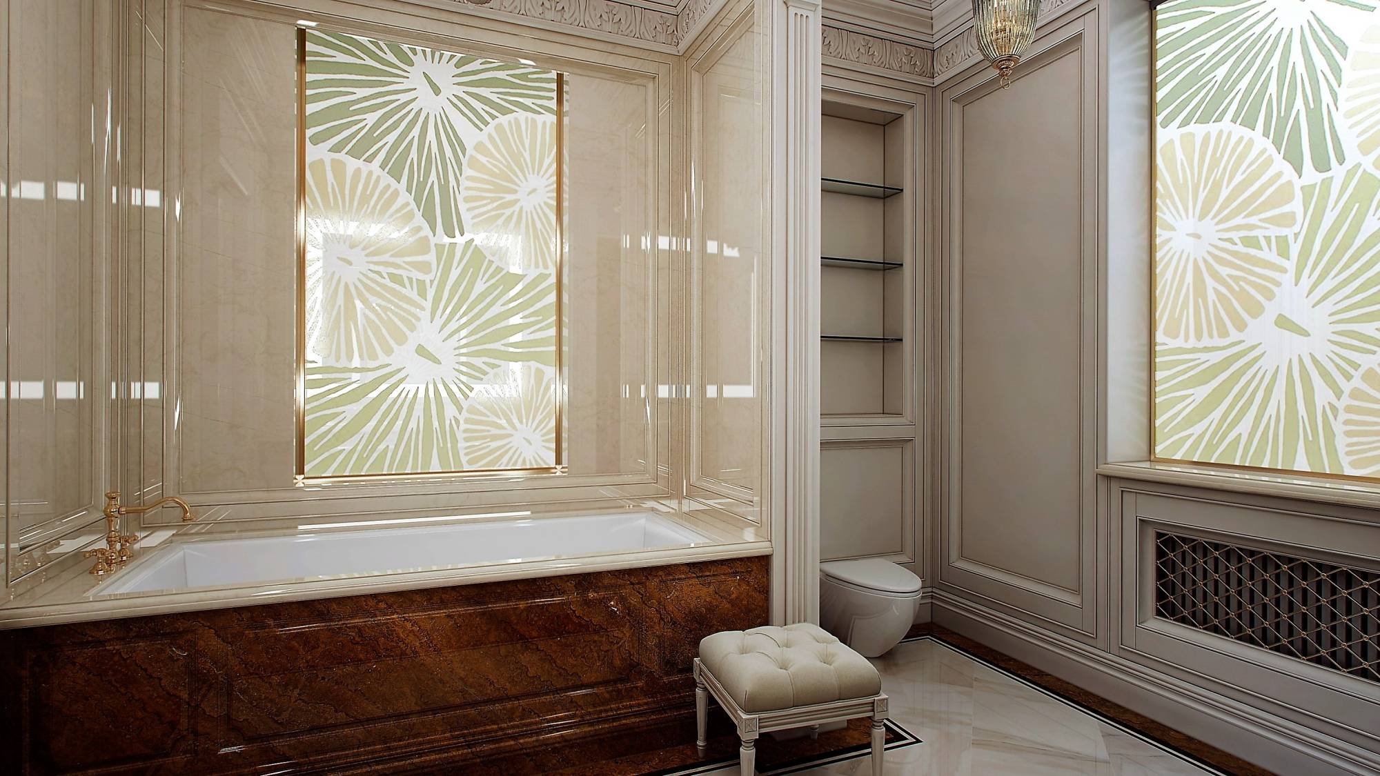 В оформлении ванной комнаты присутствуют две декоративные панели с цветными принтами. За счет подсветки они кажутся окнами, а неяркие краски не выбиваются из светлого окружения.