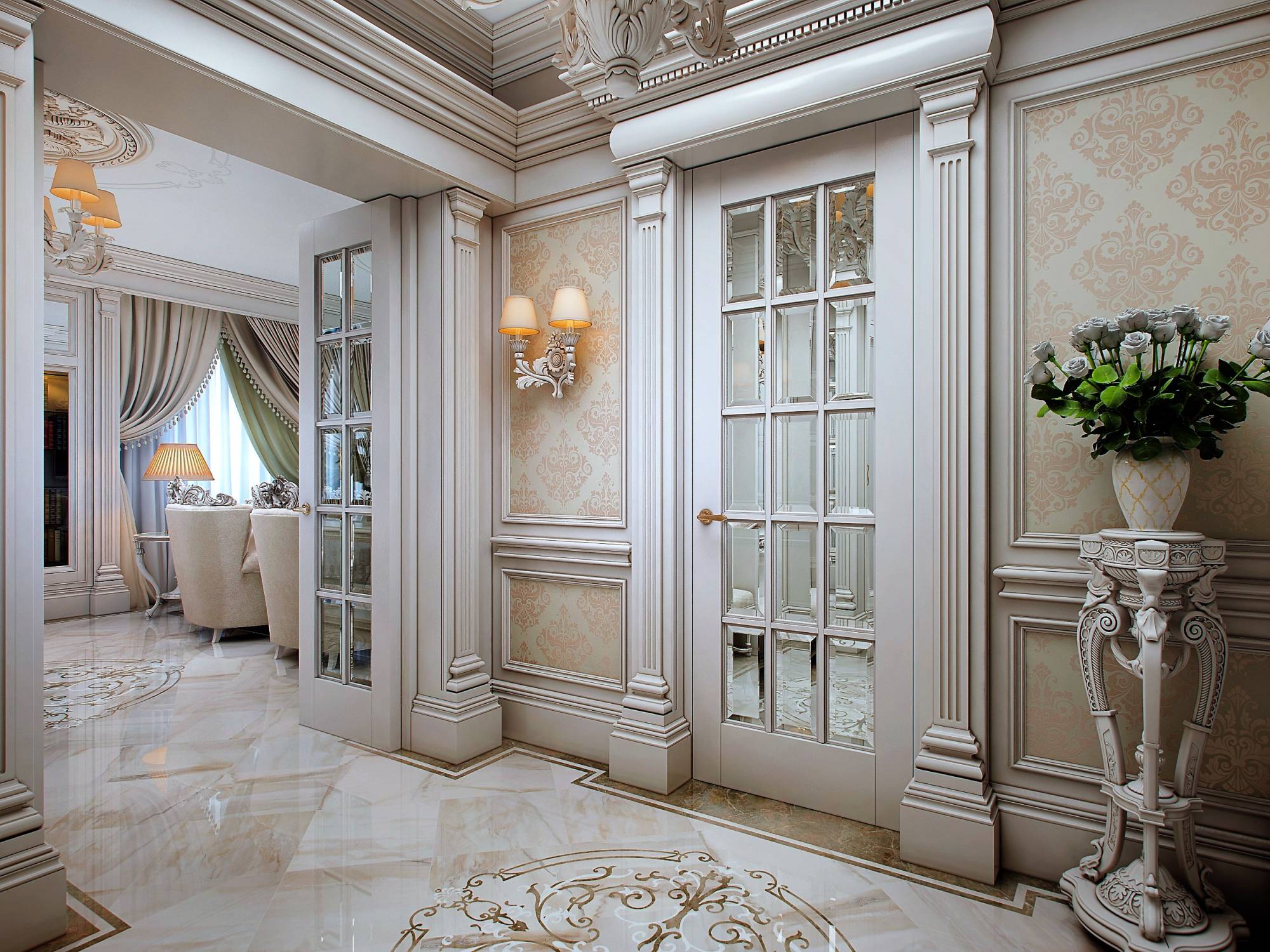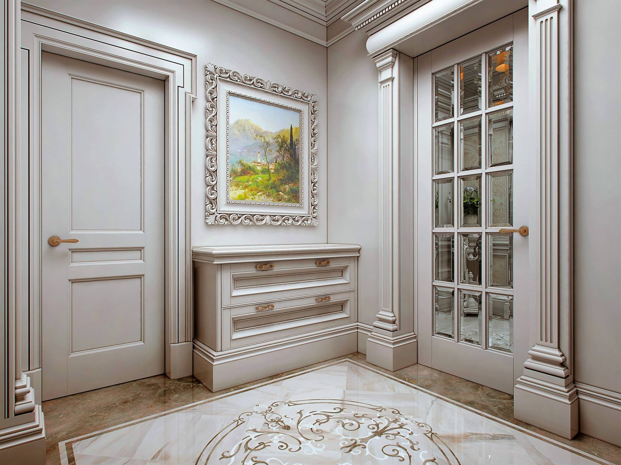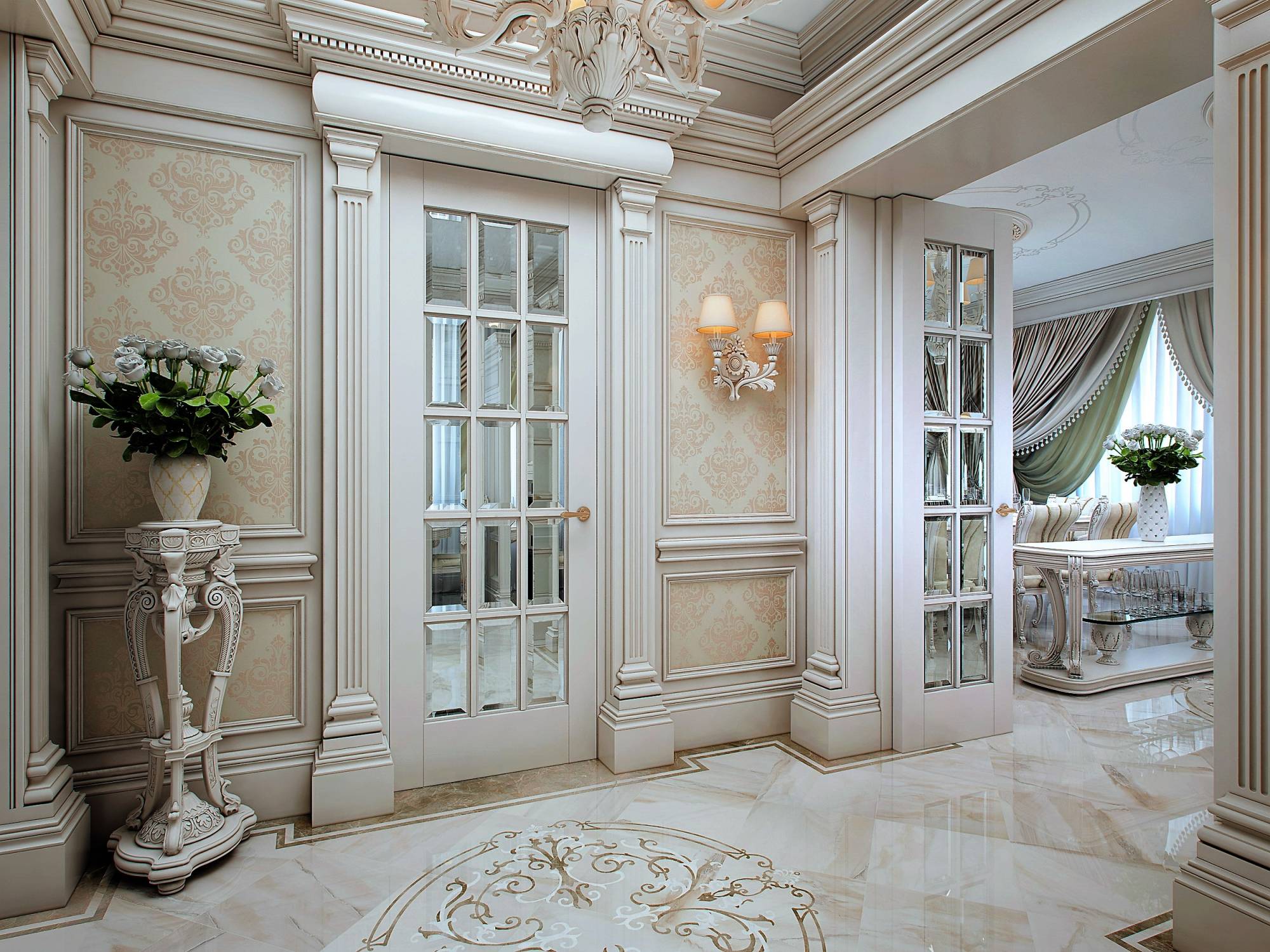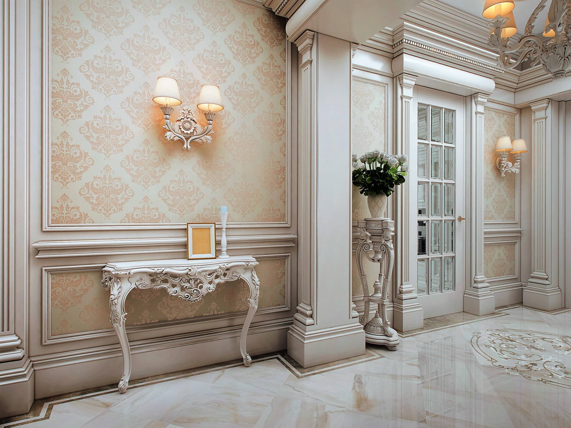 - стены оклеены текстильными обоями с классическим орнаментом и отделаны рельефными молдингами;