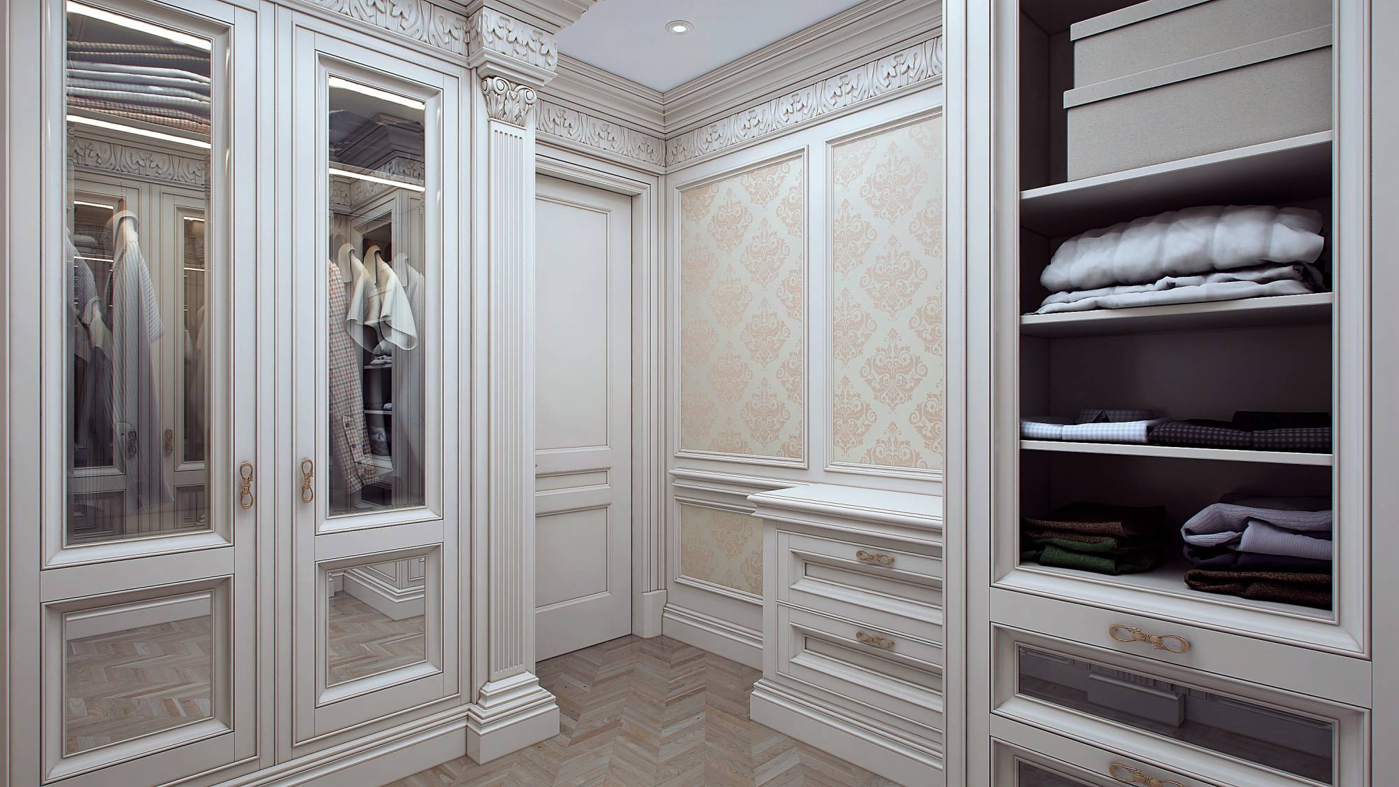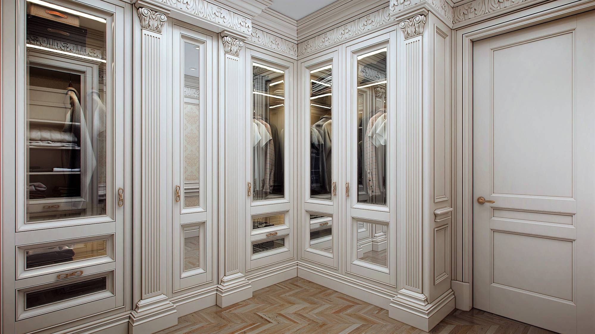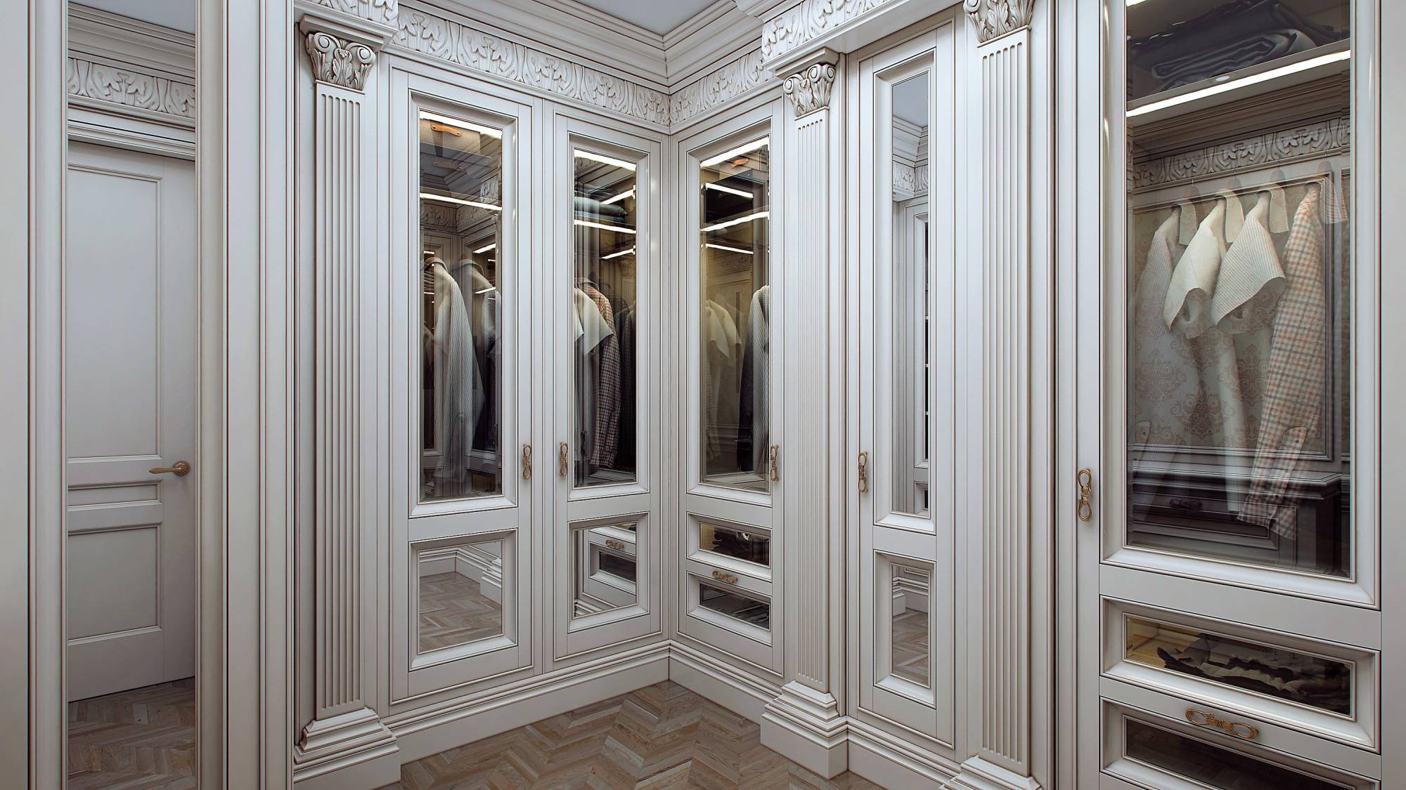 Дизайн гардеробной комнаты решен в строгом белом цвете и в строгих, прямых линиях. Фасады шкафов оформлены зеркальными и прозрачными вставками. Пилястры и витиеватые фризы подчеркивают единство оформления со спальной комнатной.