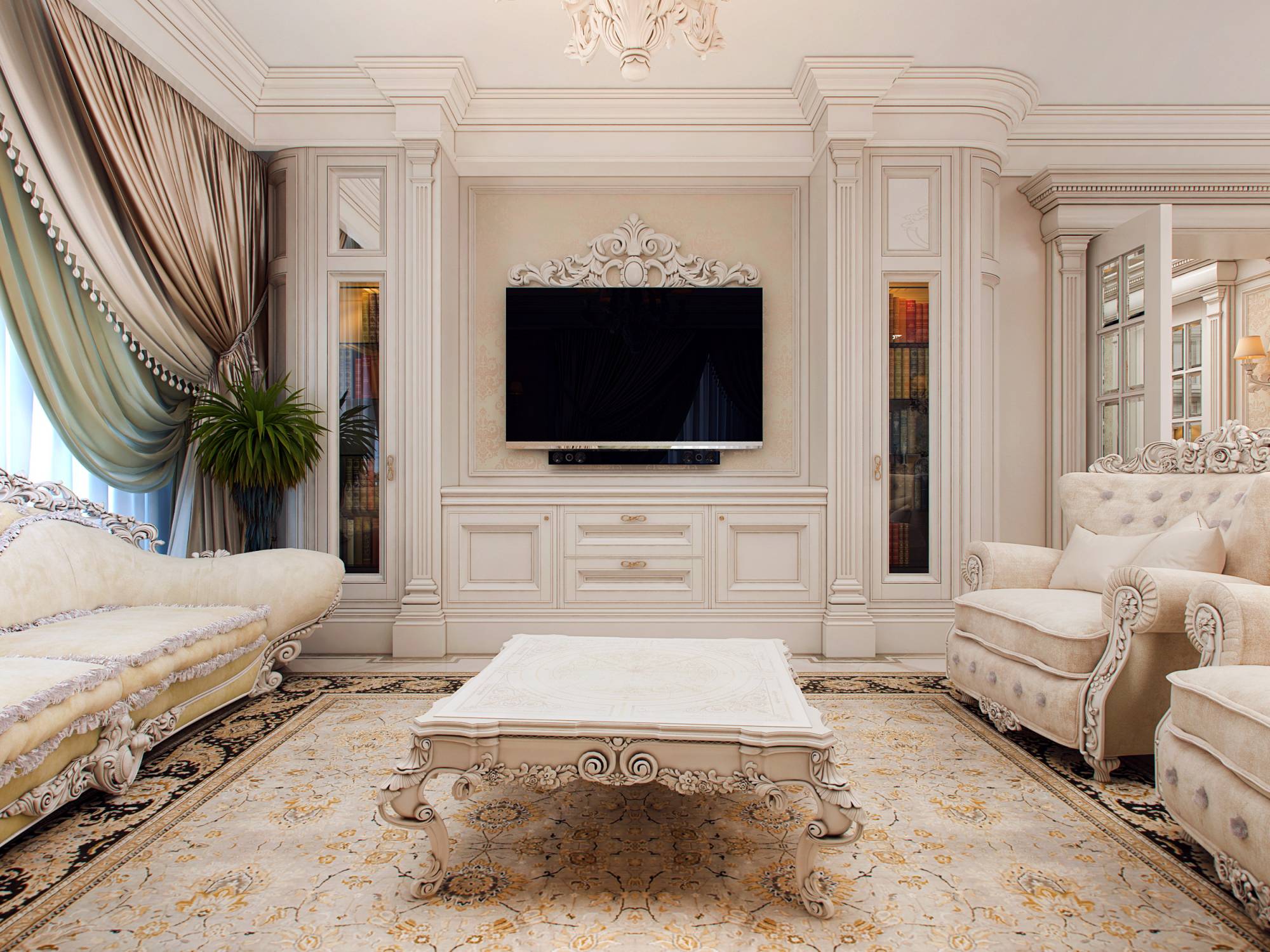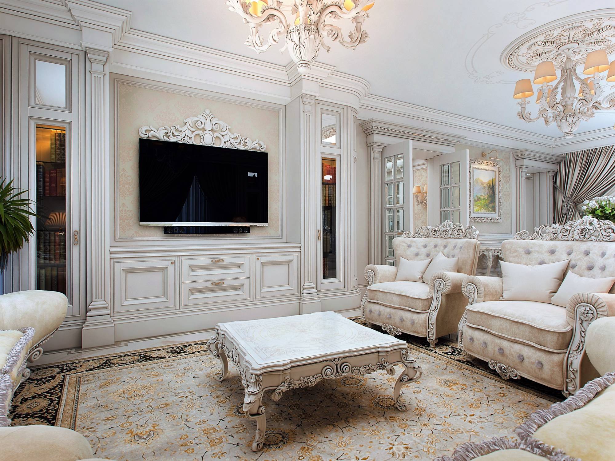 - Даже столь современный предмет, как телевизор, можно обыграть в интерьере французской классики симметричной резной консолью.