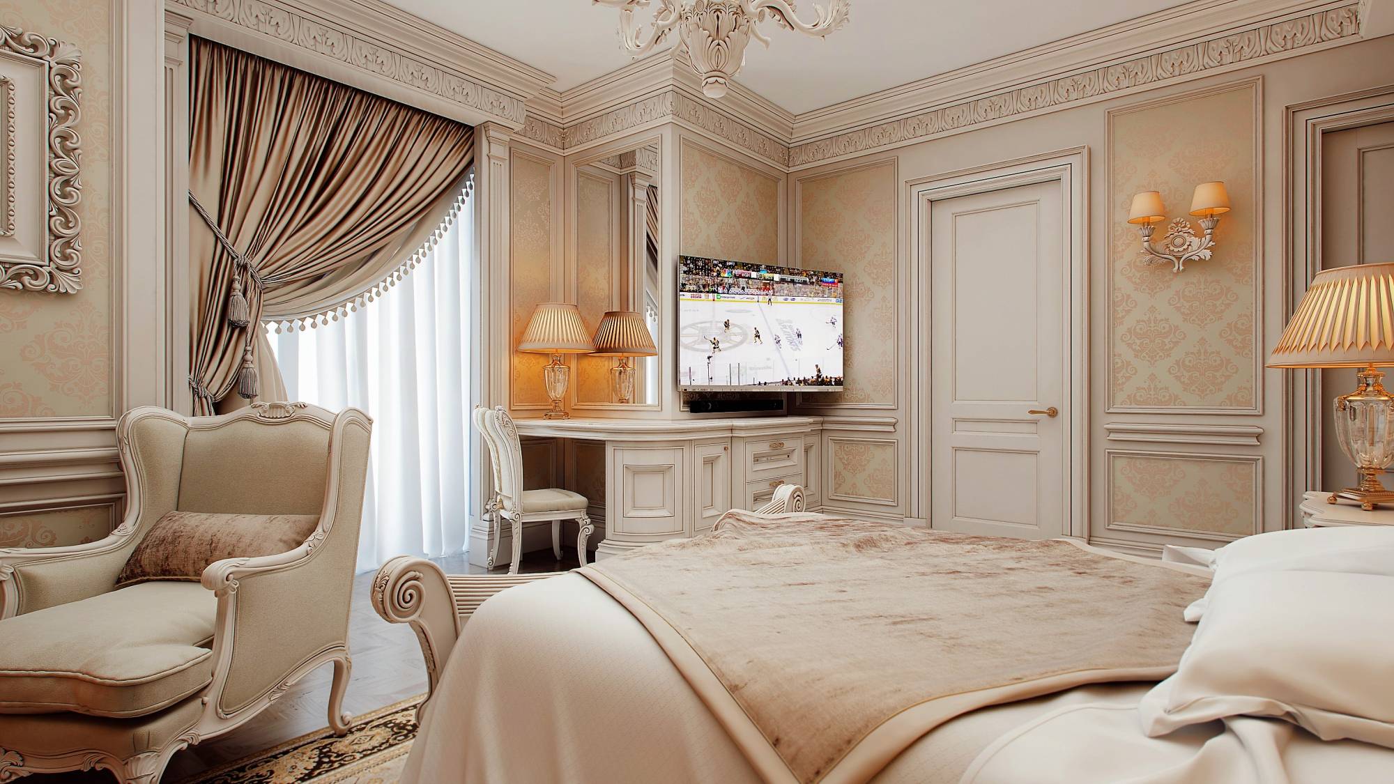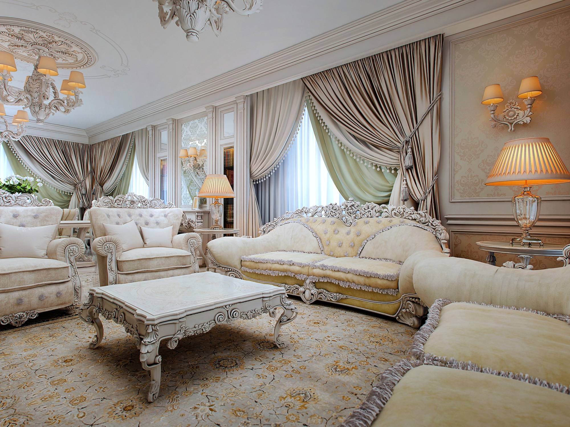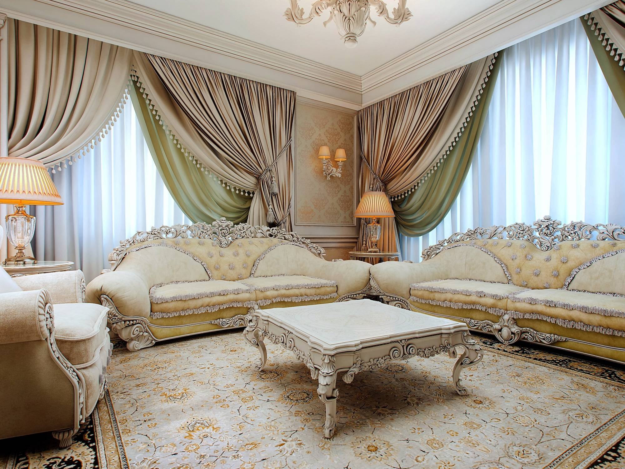 - потолки очерчены многослойными карнизами, их строгий вид компенсируется пышностью в оформлении мебели и штор.