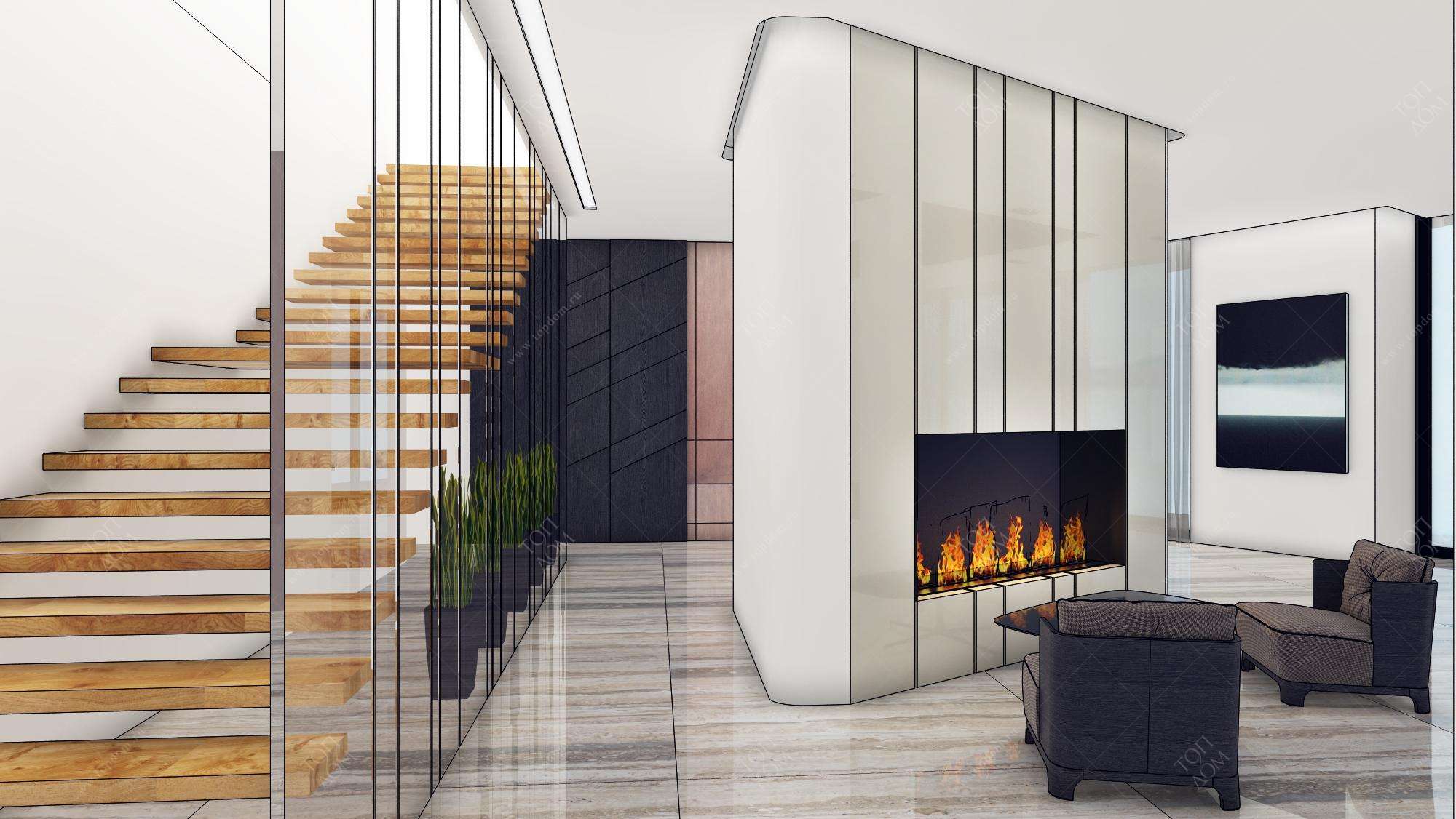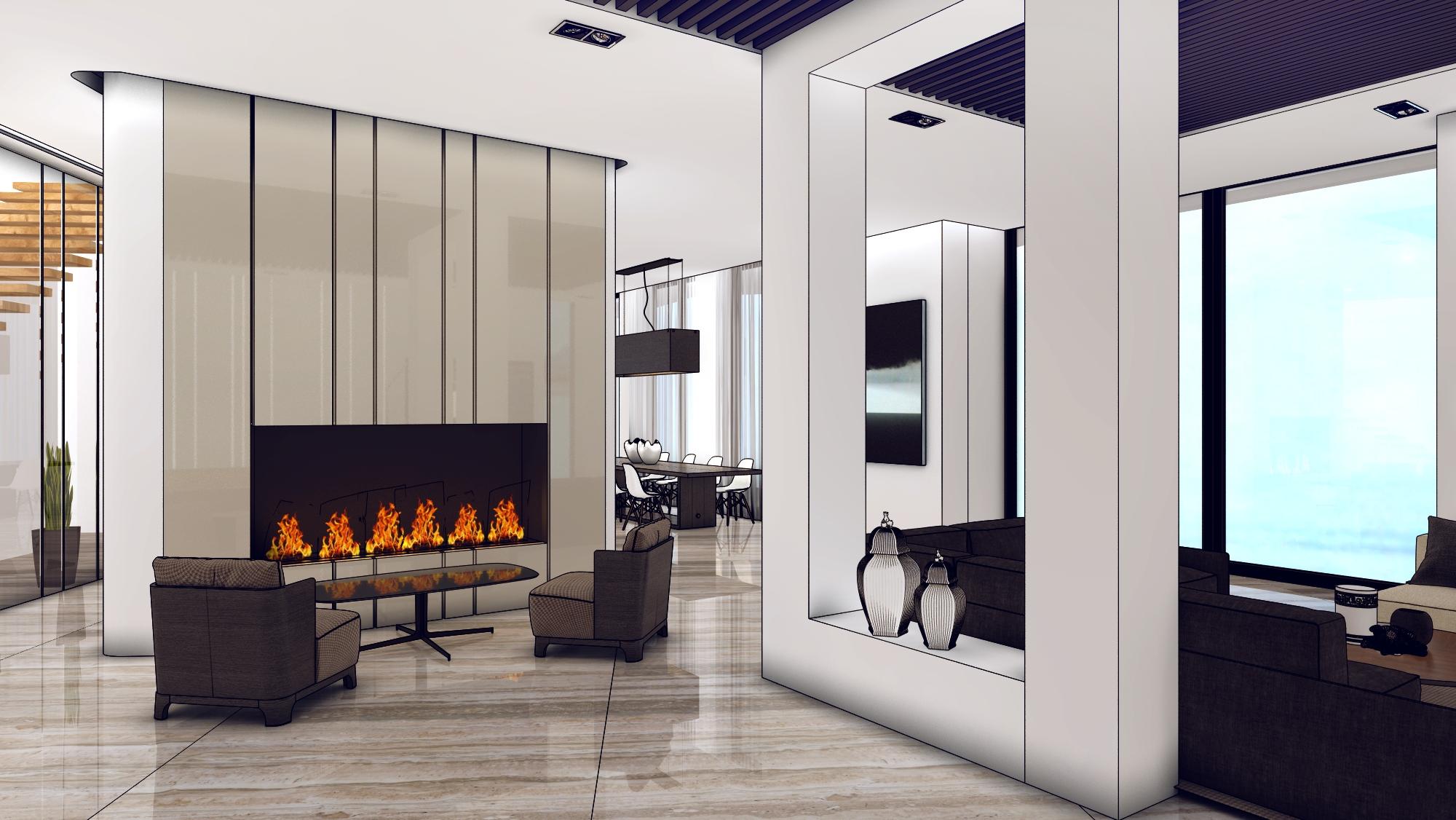 Все внимание – на перегородку со встроенным камином, перед которой обустроено место отдыха с двумя креслами. Авторы проекта предлагают два эскиза интерьера в акварели: в первом случае перегородка облицована декоративными панелями с ярко выраженным древесным рисунком, во втором – глянцевыми светло-серыми. Фактура и яркие песочные оттенки дерева выделяют зону камина ярким цветовым пятном. А серая облицовка позволяет сосредоточиться на игре желтого пламени.