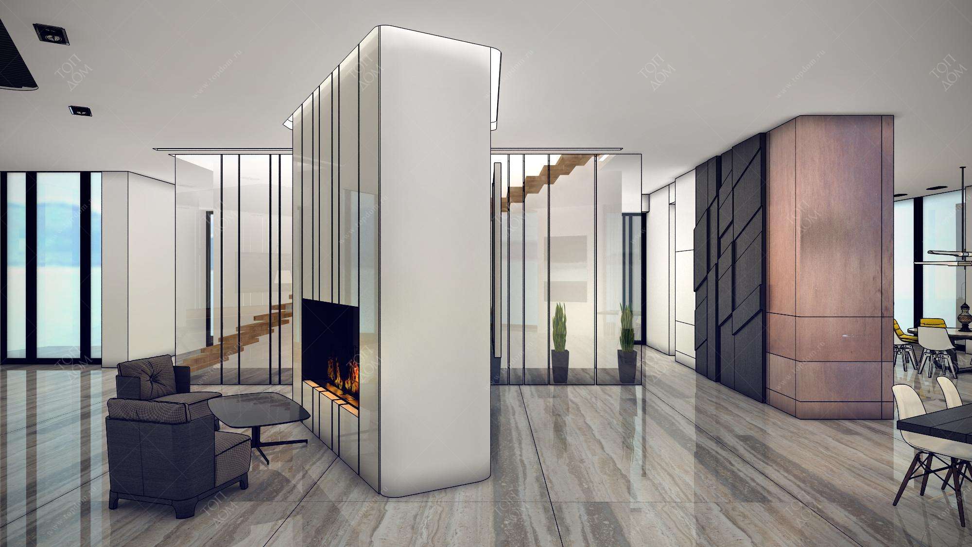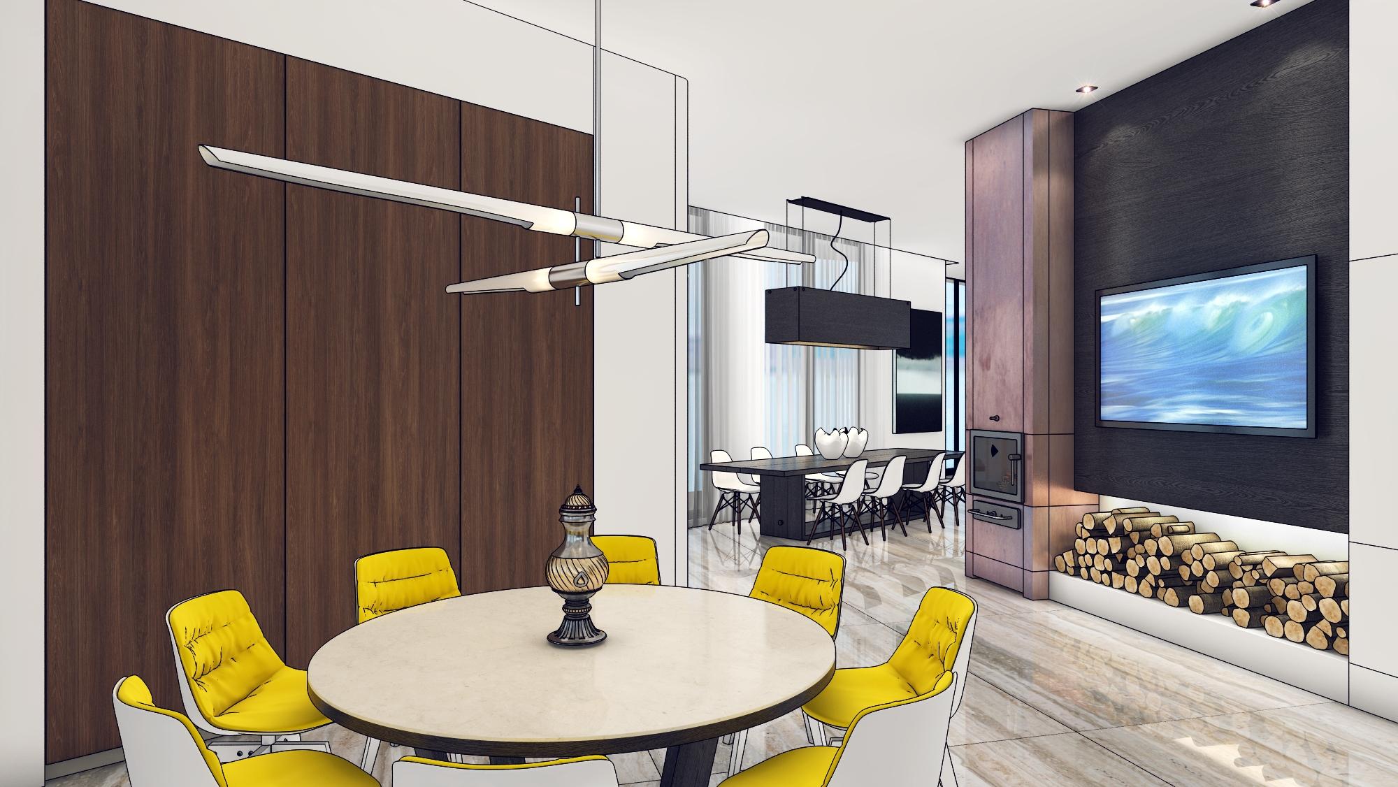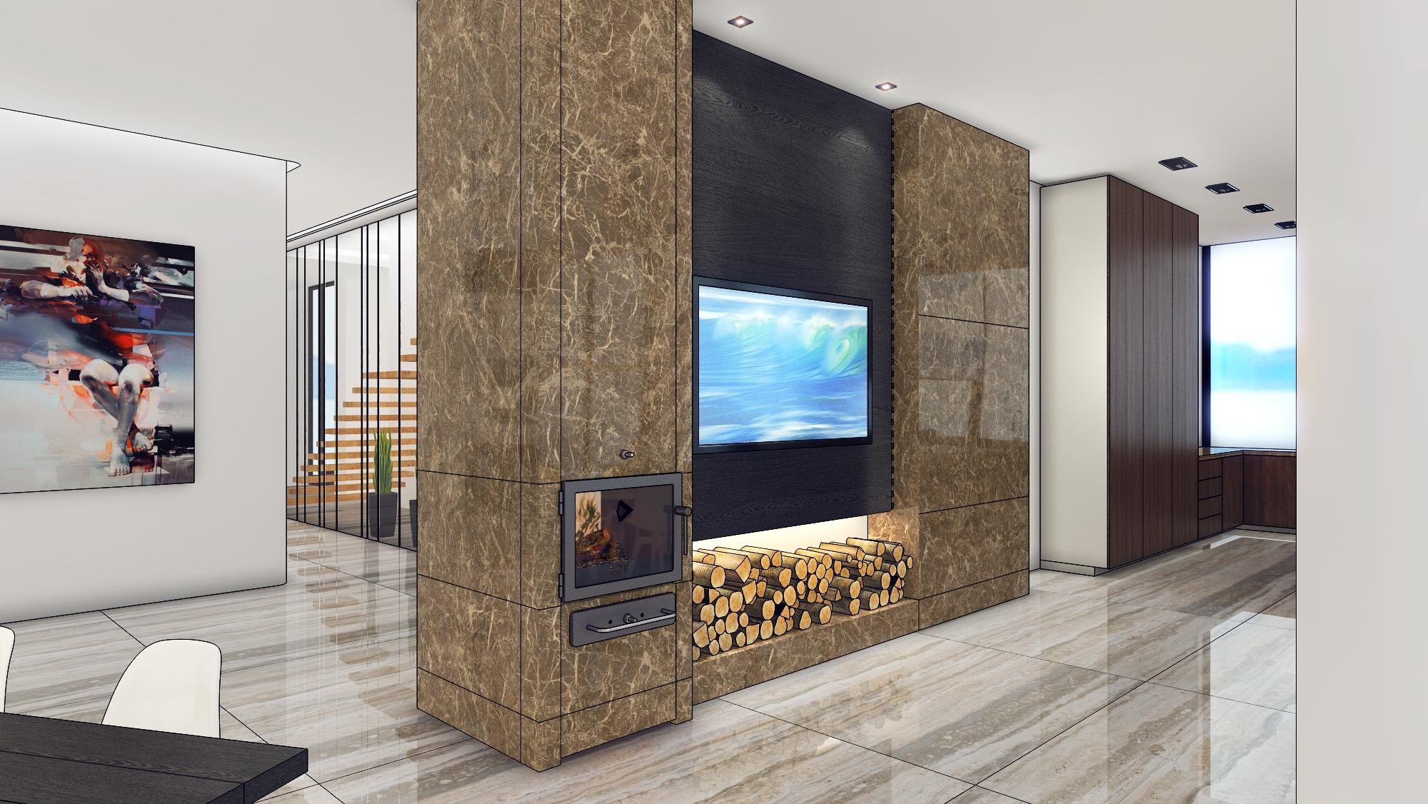 Обеденная зона акцентирована круглым столом и ярко-желтым цветом обивки стульев. Необычный элемент обстановки – настоящий камин с поленницей. В современном доме это традиционный атрибут уюта. Перегородку с дымоходом и симметричный ей участок стены предлагается отделать тоже мраморными плитами, а над сложенными дровами подвесить телевизор.