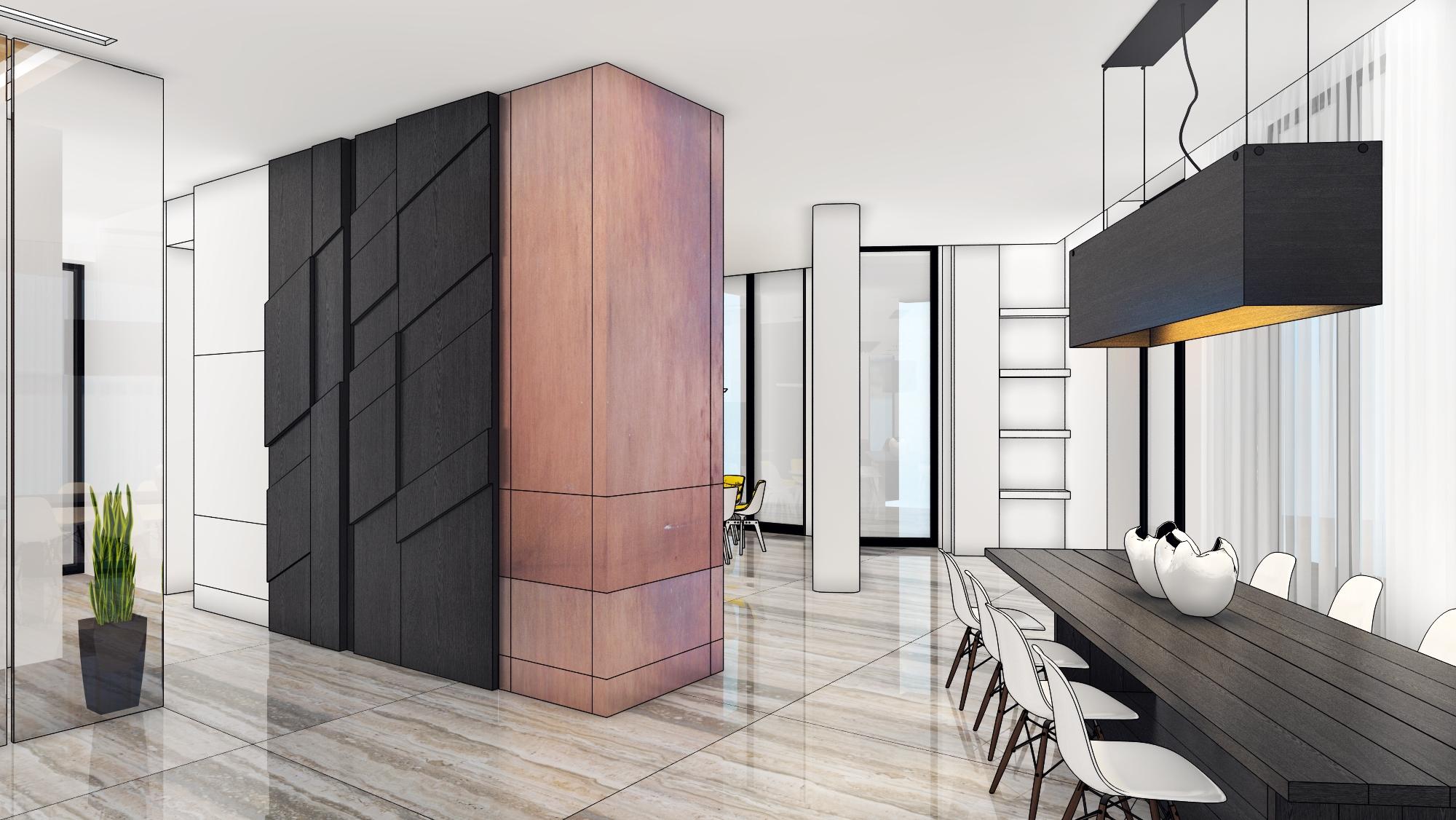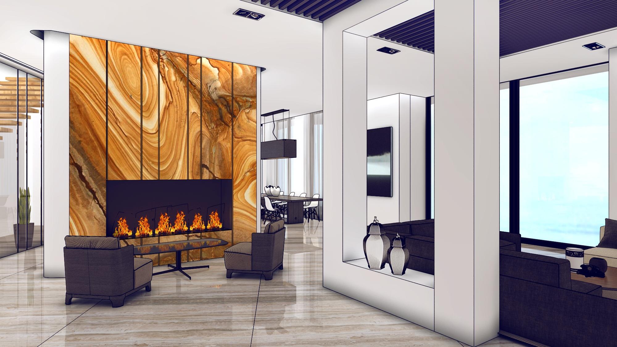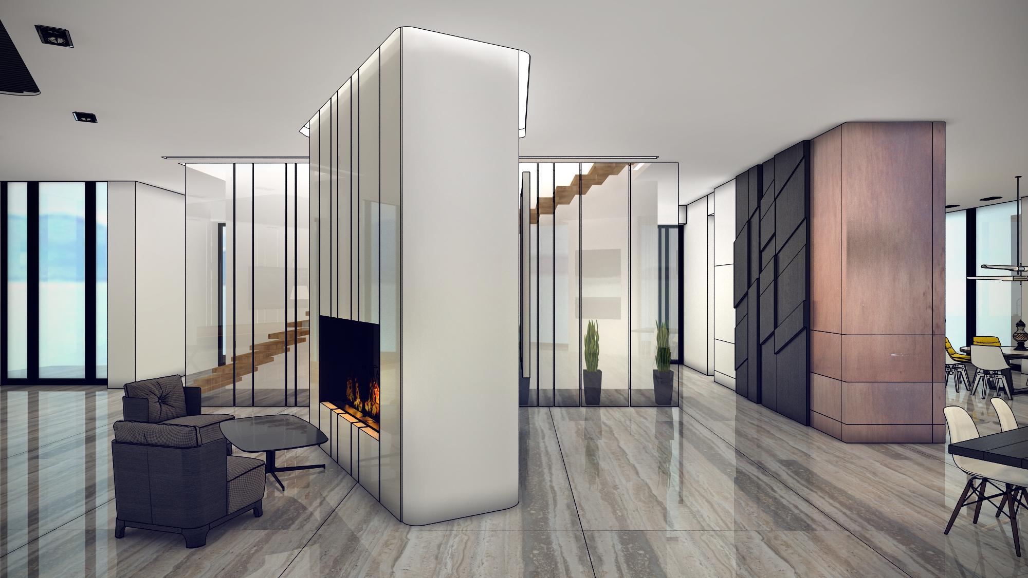 Обеденная зона акцентирована круглым столом и ярко-желтым цветом обивки стульев. Необычный элемент обстановки – настоящий камин с поленницей. В современном доме это традиционный атрибут уюта. Перегородку с дымоходом и симметричный ей участок стены предлагается отделать тоже мраморными плитами, а над сложенными дровами подвесить телевизор.