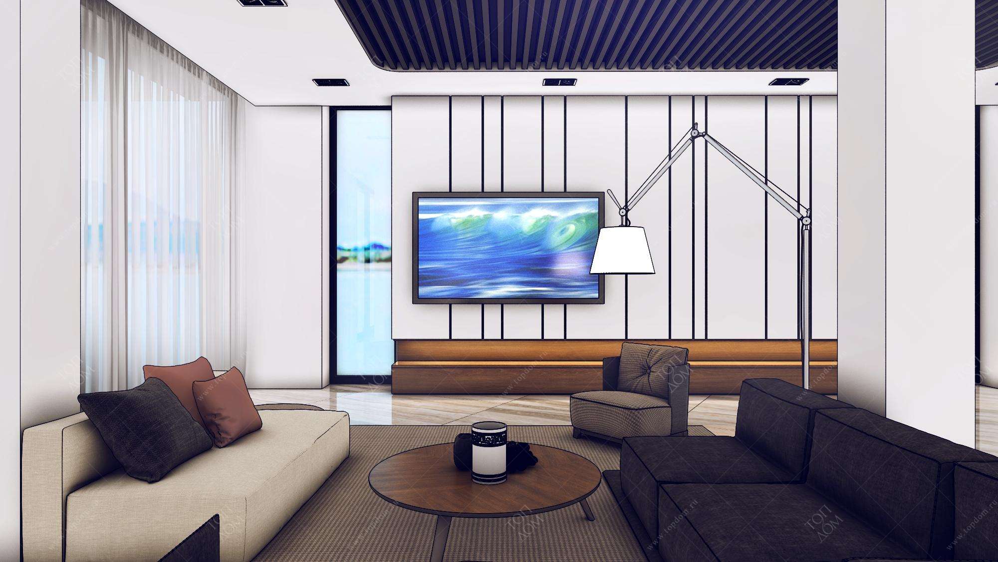 Центральная потолочная ниша отделана темно-коричневыми рейками, дизайн интерьера акварельными красками позволяет красиво передать их насыщенный кофейный оттенок. Место с ТВ-зоной обшито объемными вертикальными панелями, на соседней стене – зеркальная облицовка, зрительно расширяющая площадь.