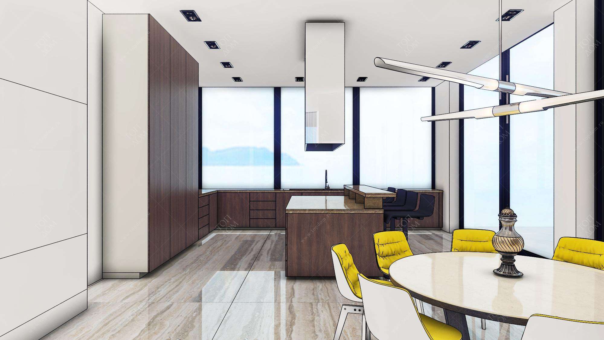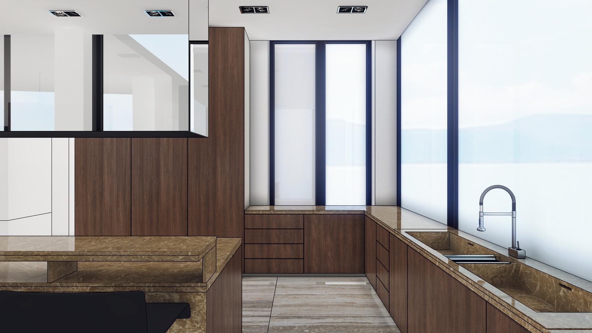 Помещение кухни поделено на две части: рабочую и обеденную. Ведущий материал в зоне готовки – натуральное дерево, им отделаны фасады шкафов, ящиков, рабочего стола в центре. В акварельных эскизах интерьера тонко переданы шоколадные оттенки ореха. Их колористически поддерживает коричневый мрамор столешниц и моек.
